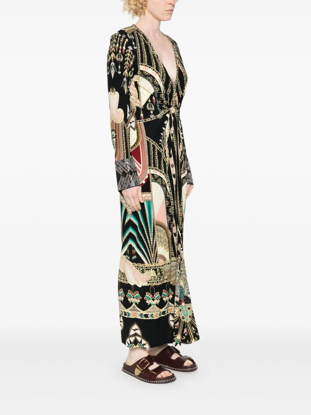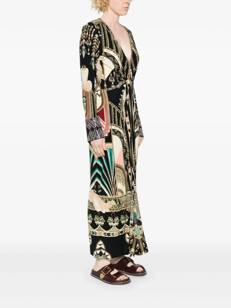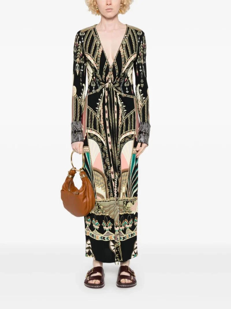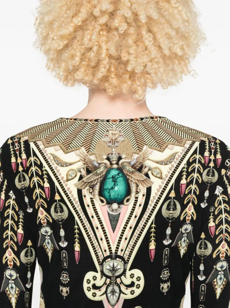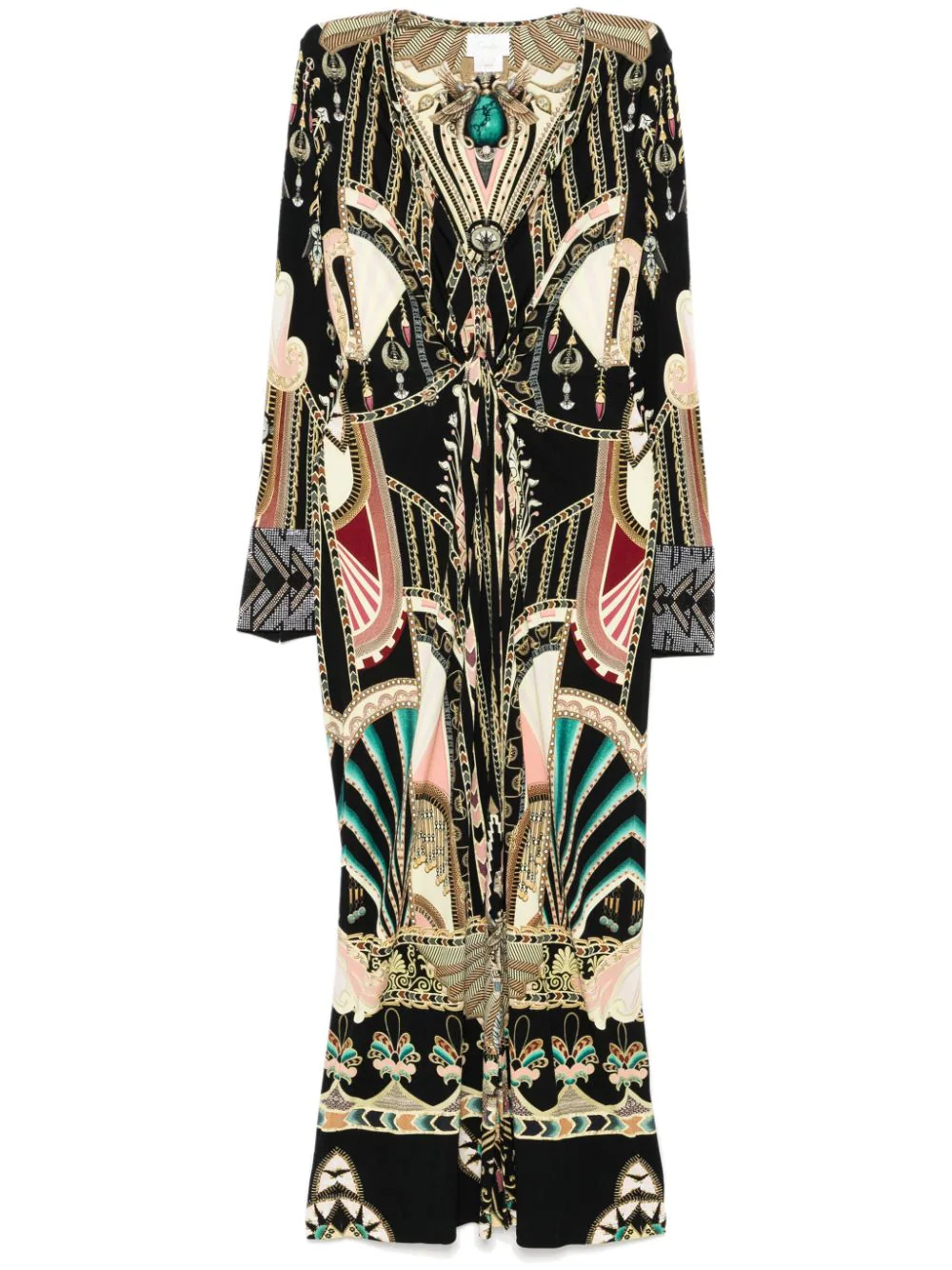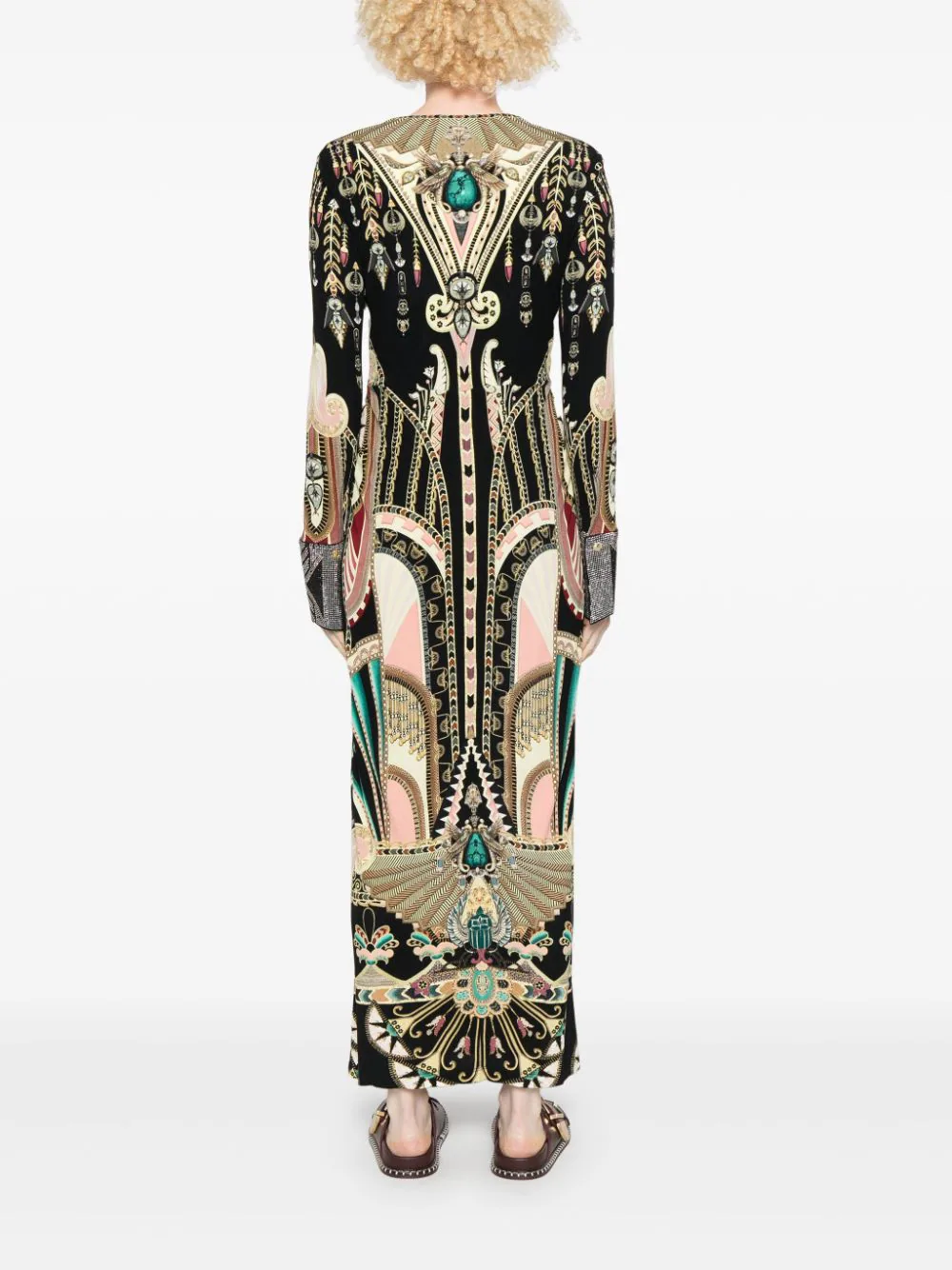 Rochie maxi Camilla Twist Jersey negru, din viscoza. cu decolteu in V, maneci lungi, mansete cu nasturi, detalii decorative tip twist, grafica Camilla „They Called Her Nefertari” in tesatura pe toata suprafata, cristale scipitoare aplicate si tiv drept. Potrivita pentru sezonul toamna/iarna. 100% viscoza; 100% viscoza.