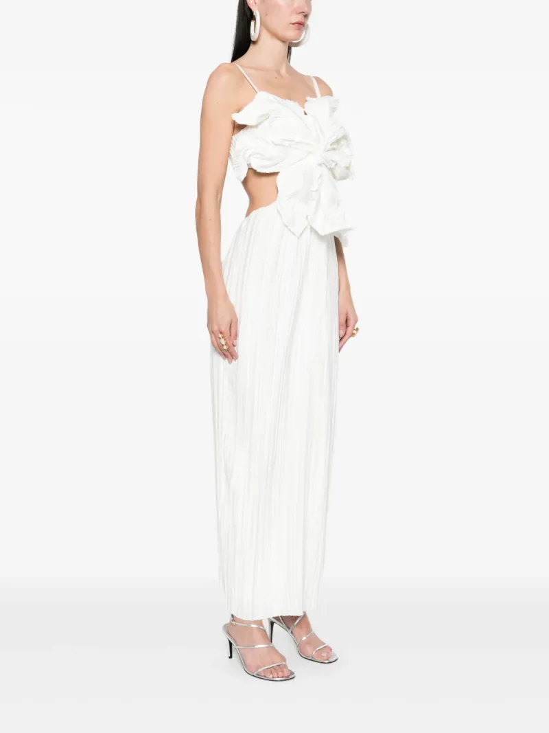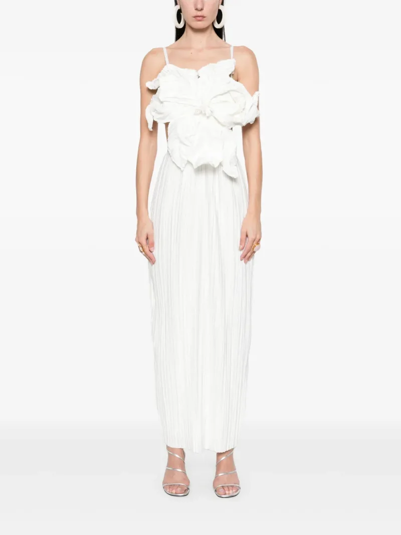 Rochie maxi Cult Gaia Hestra Gown alb, din textil, model plisat integral, cu barete ajustabile pentru umeri, inchidere cu fermoar ascuns la spate, floare decorativa aplicata pe partea din fata, detaliu decupat la spate, slit inalt si tiv drept. Potrivita pentru sezonul primavara/vara. 100% textil.