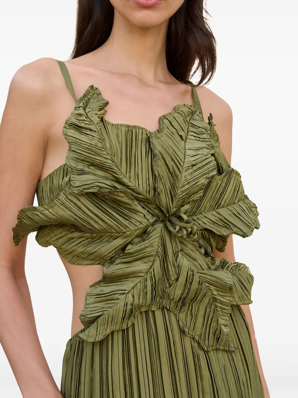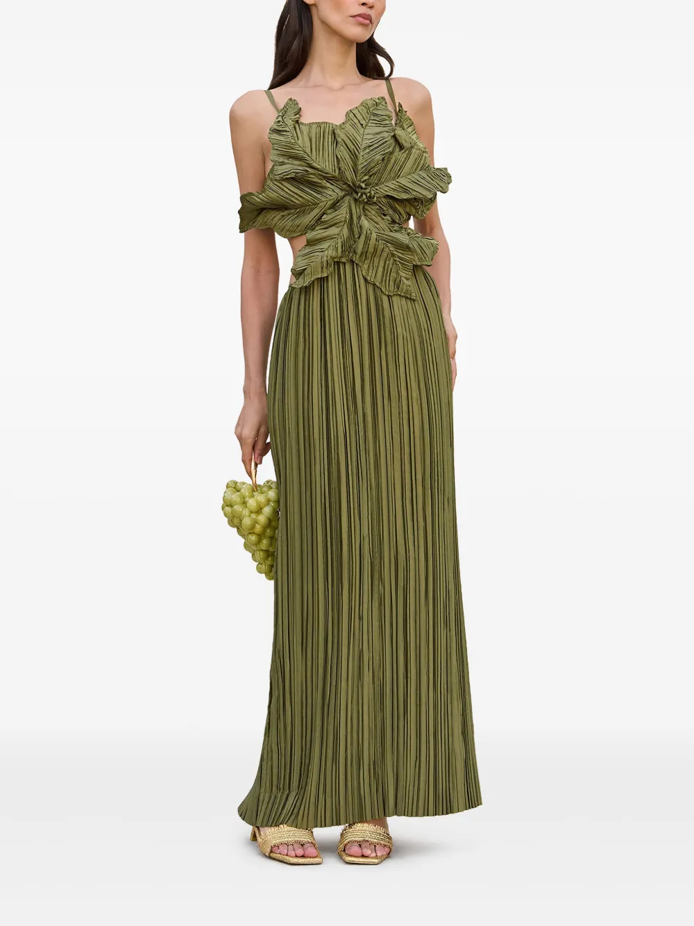 Rochie maxi Cult Gaia Hestra Gown khaki, din textil, model plisat integral, cu barete ajustabile pentru umeri, inchidere cu fermoar ascuns la spate, floare decorativa aplicata pe partea din fata, detaliu decupat la spate, slit inalt si tiv drept. Potrivita pentru sezonul primavara/vara. 100% textil.