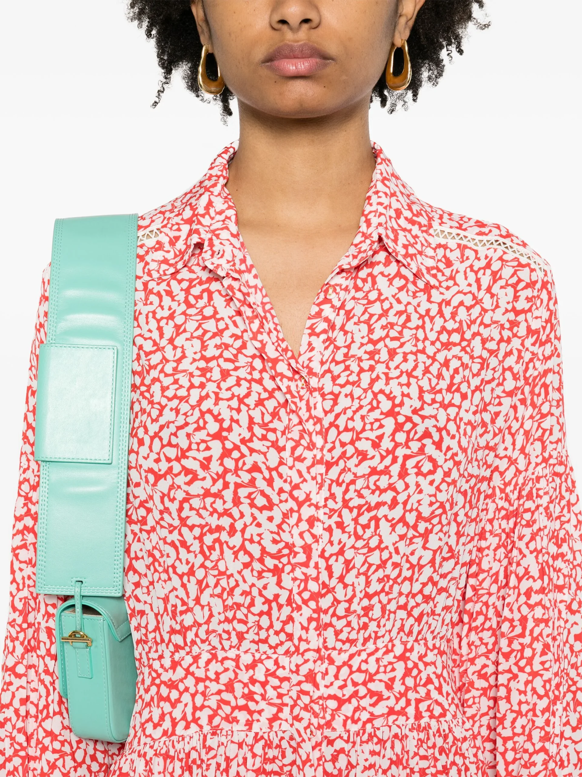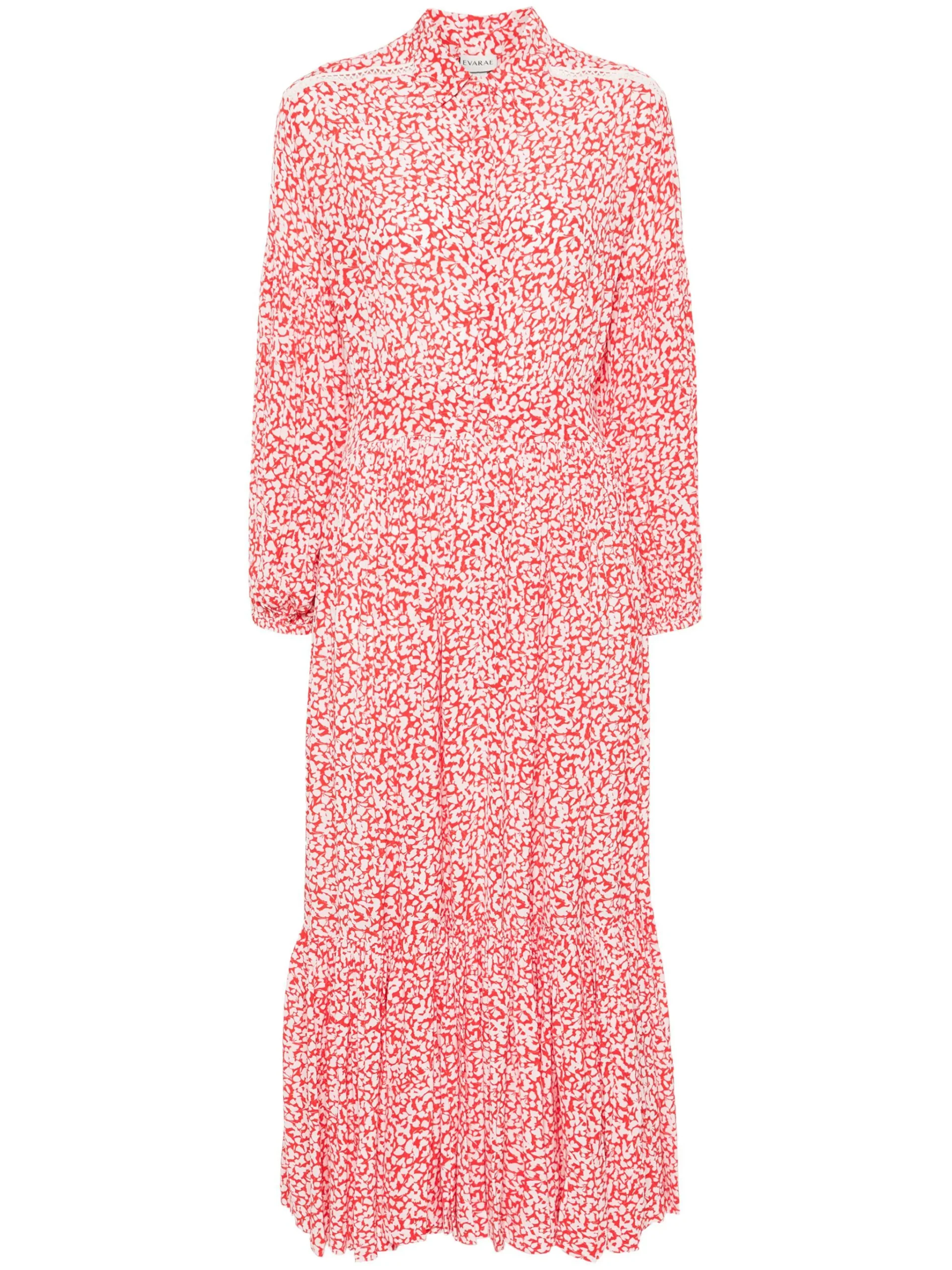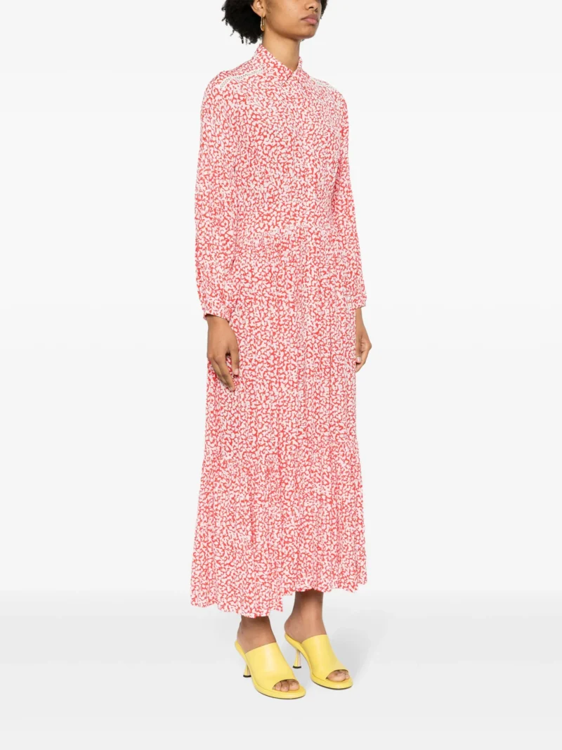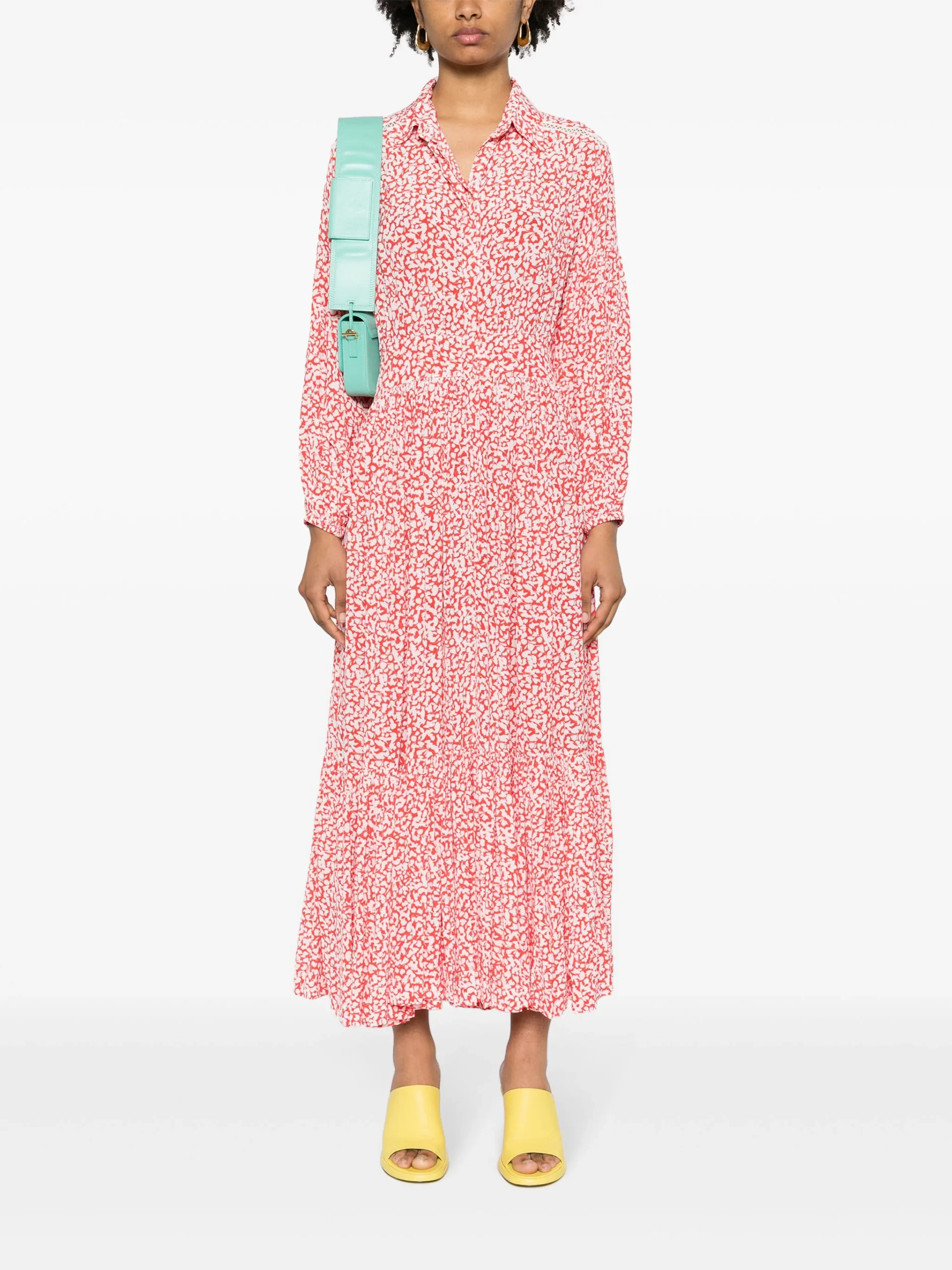 Rochie maxi multicolor din viscoza, cu guler clasic, inchidere cu nasturi , maneci lungi, mansete elastice, model imprimat pe toata suprafata si tiv drept. Potrivita pentru sezonul primavara/vara. 100% viscoza.