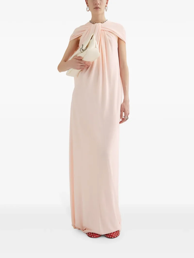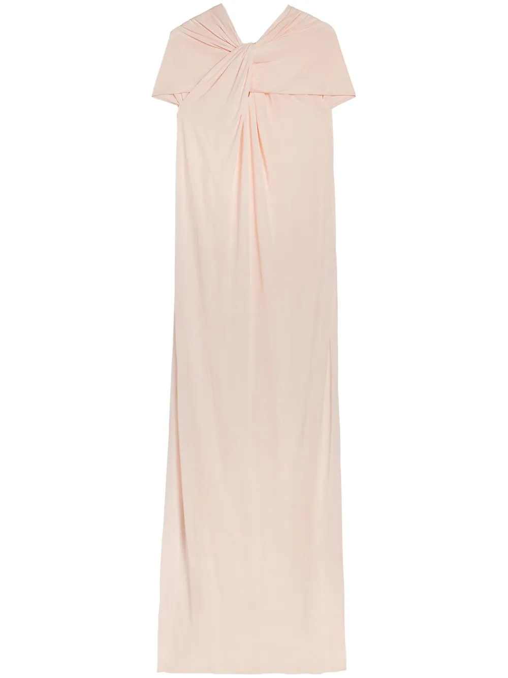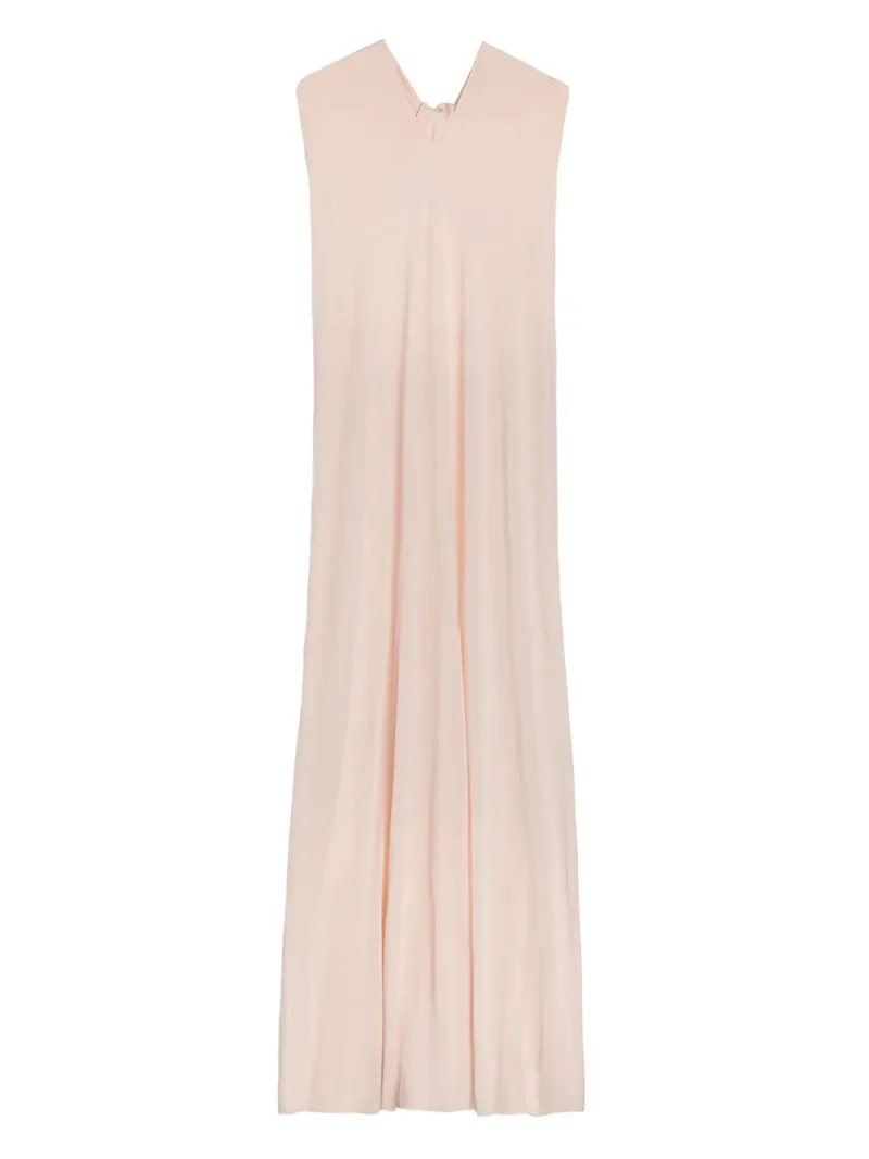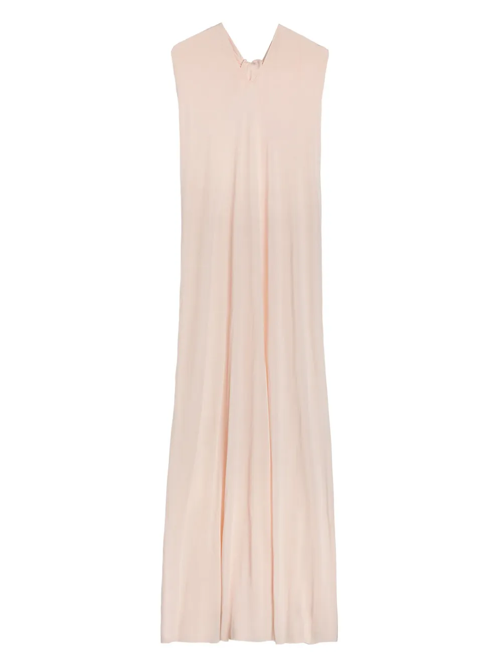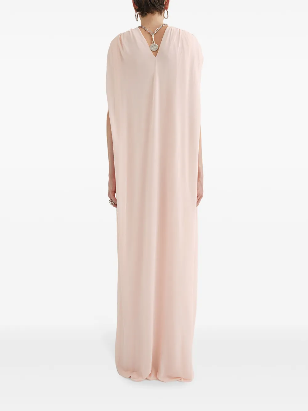 Rochie maxi JIL SANDER Draped roz, design drapat din viscoza, cu guler asimetric, decolteu in V la spate, maneci tip capa, detaliu cu nod si tiv drept. Potrivita pentru sezonul primavara/vara. 100% viscoza.