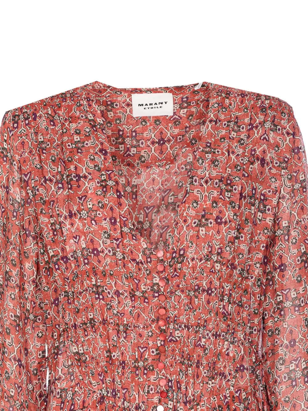 Rochie maxi Marant Etoile Briane Button-Front Flounced portocaliu, realizata din viscoza, cu decolteu in v, inchidere cu nasturi, maneci lungi bufante, talie cu drapaje tip corset, grafica imprimata si tiv evazat. Potrivita pentru sezonul toamna/iarna. 100% viscoza.