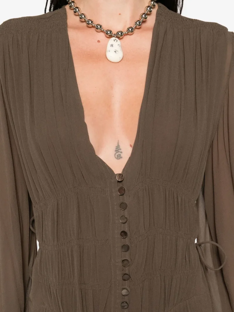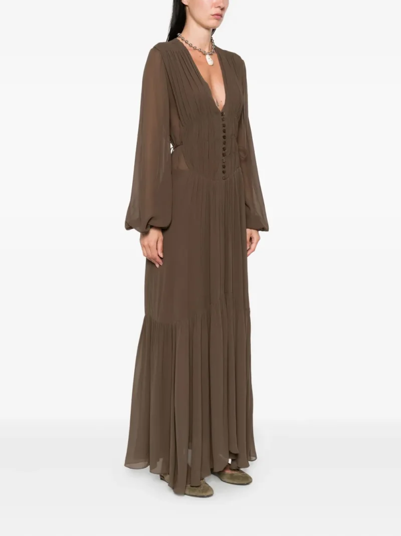 Rochie maxi Marant Etoile Briane maro, din viscoza, cu decolteu in V, inchidere cu nasturi, maneci lungi bufante, talie cu drapaje tip corset si tiv evazat. Potrivita pentru sezonul toamna/iarna. 100% viscoza.