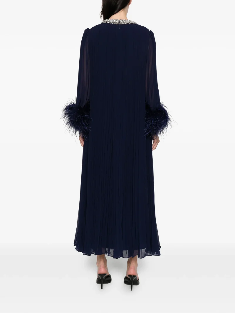 Rochie maxi Self-Portrait feather-cuff pleated albastru, cu decolteu decorat, tiv cu pene, maneci lungi si design plisat. 100% poliester