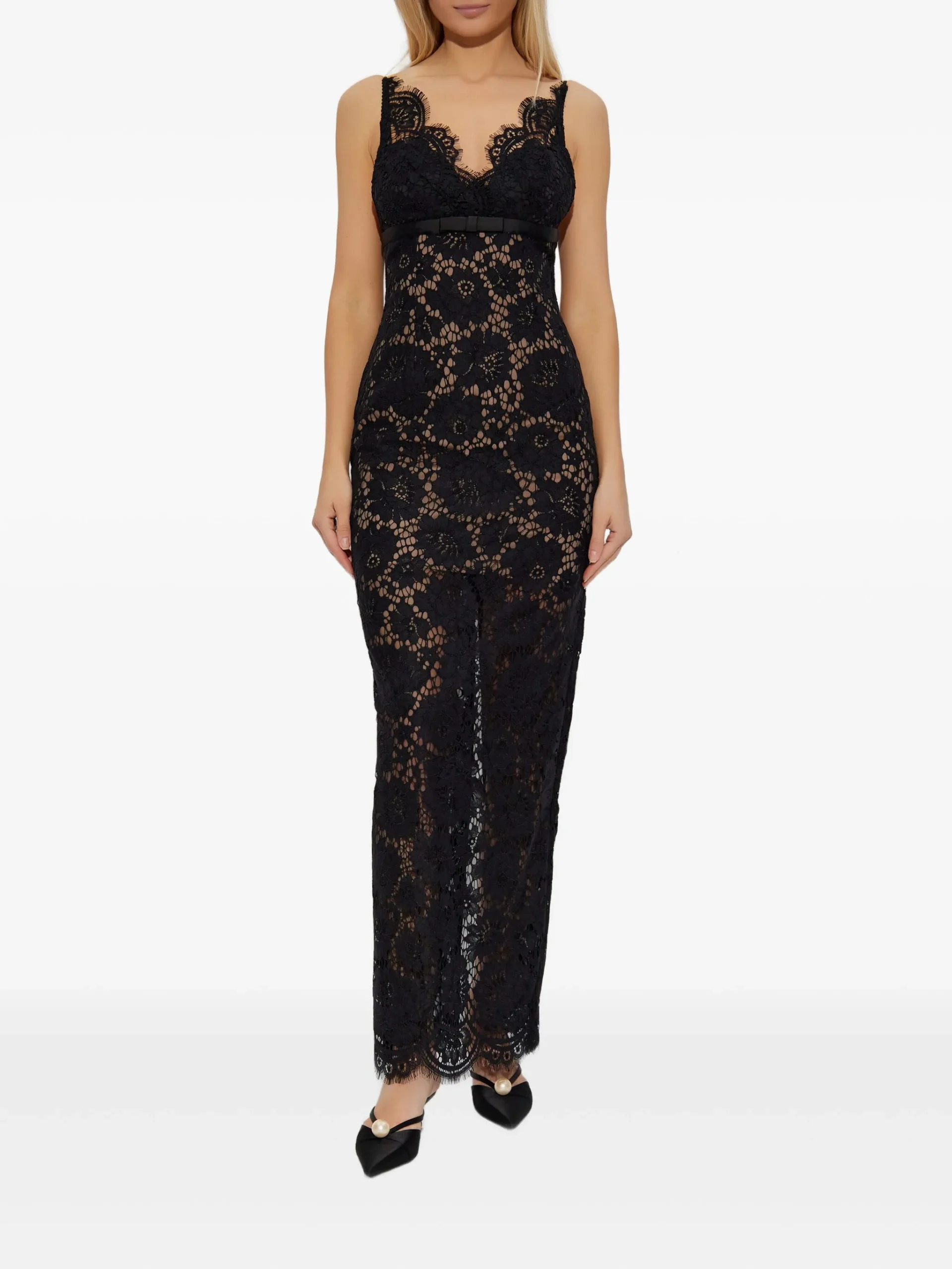 Rochie maxi Self-Portrait floral-lace negru, model floral cu dantela, margine festonata, decolteu in V, fara maneci. 63% nylon 27% bumbac 10% vascoza