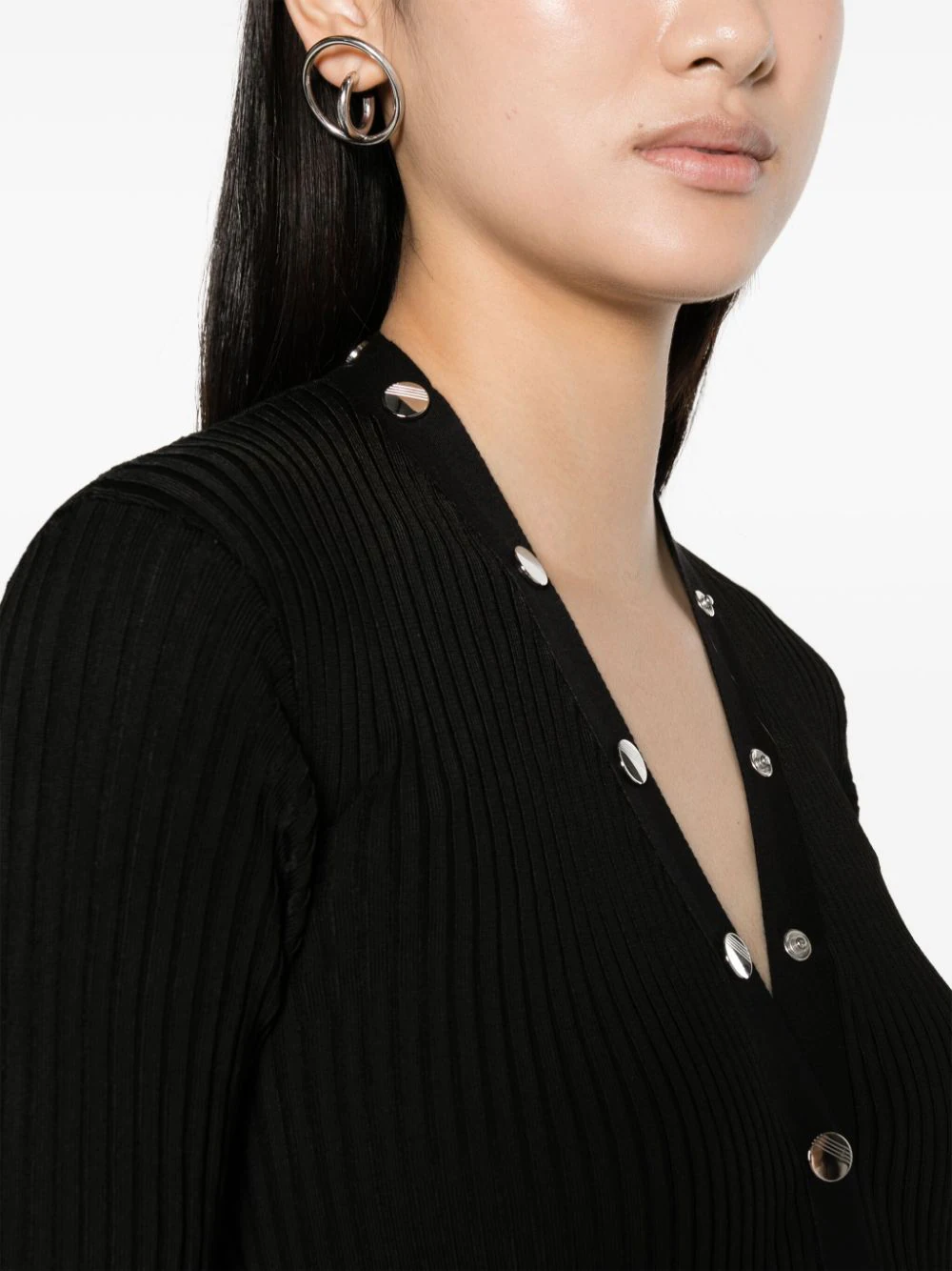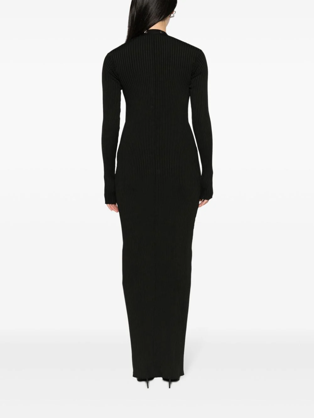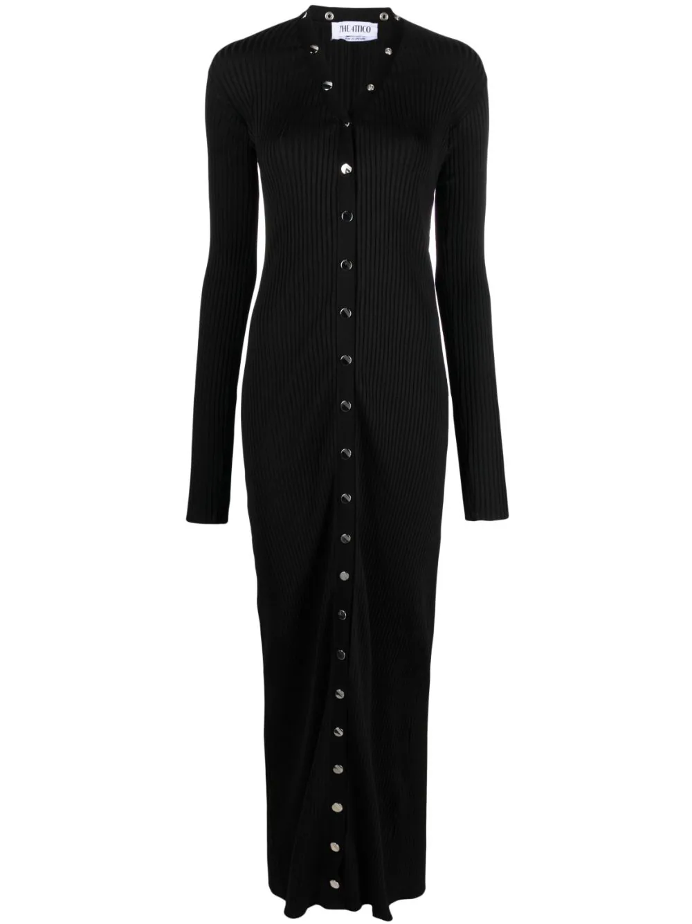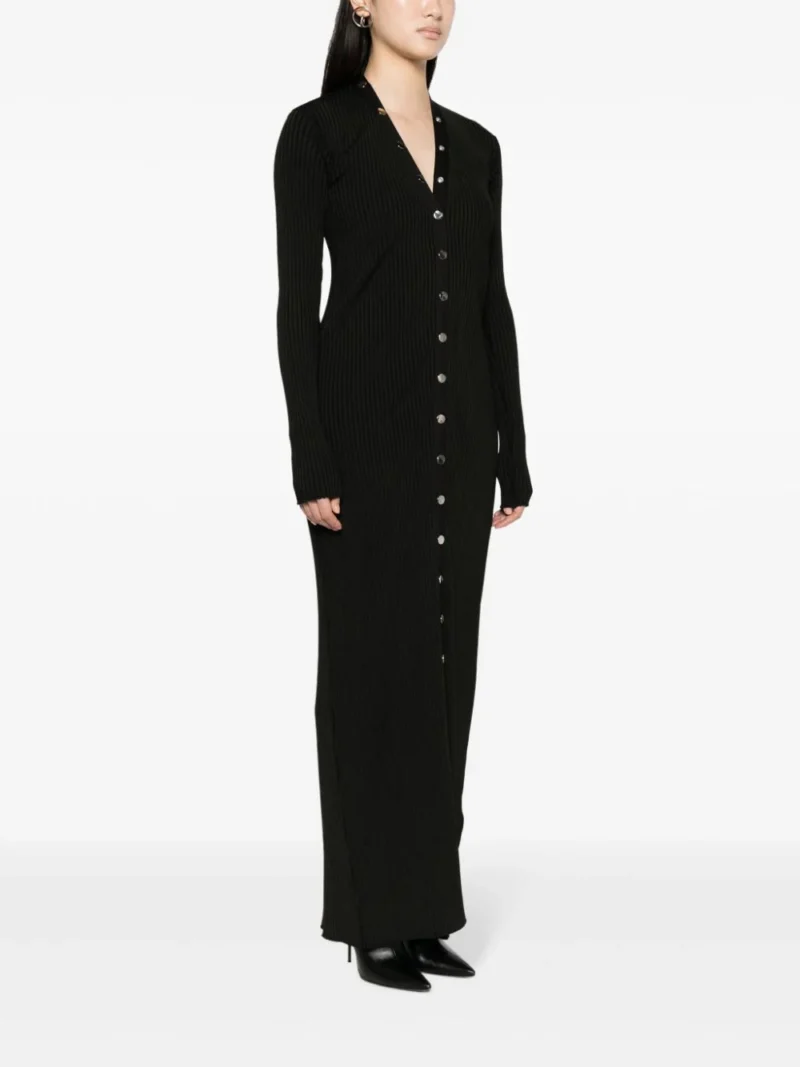 Rochie maxi neagra din viscoza si poliester, tip cardigan, cu guler in V, inchidere capse metalice, umeri cazuti, maneci lungi, tesatura texturata si tiv drept. Potrivita pentru sezonul primavara/vara. 50% viscoza; 50% poliester.