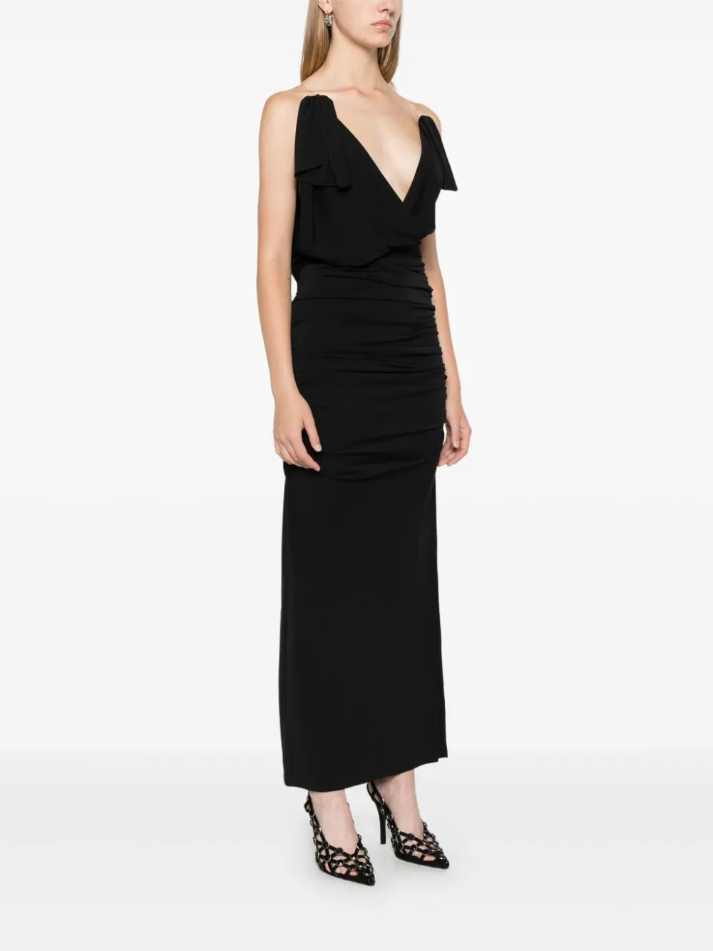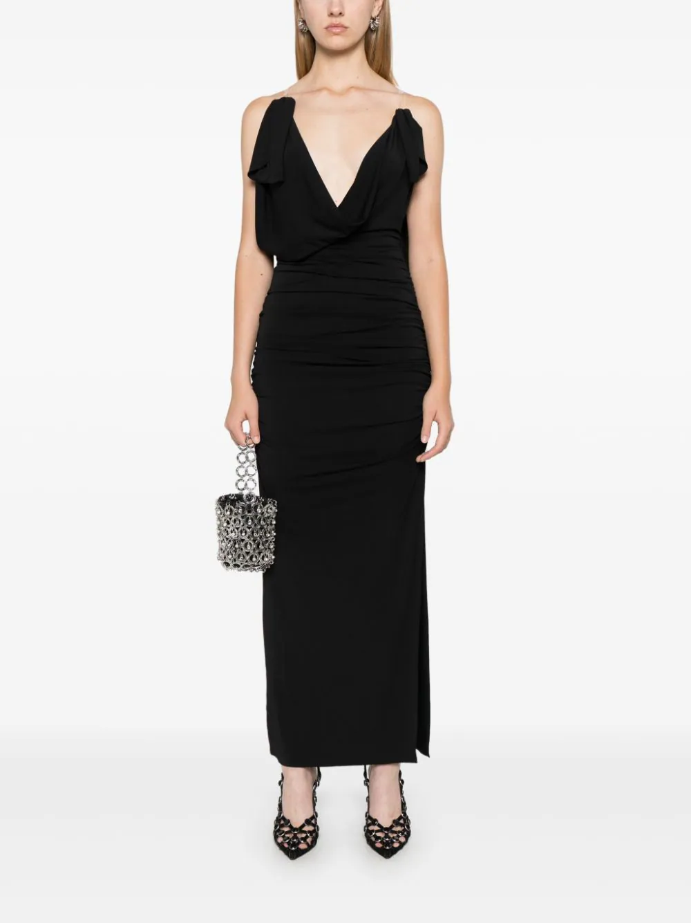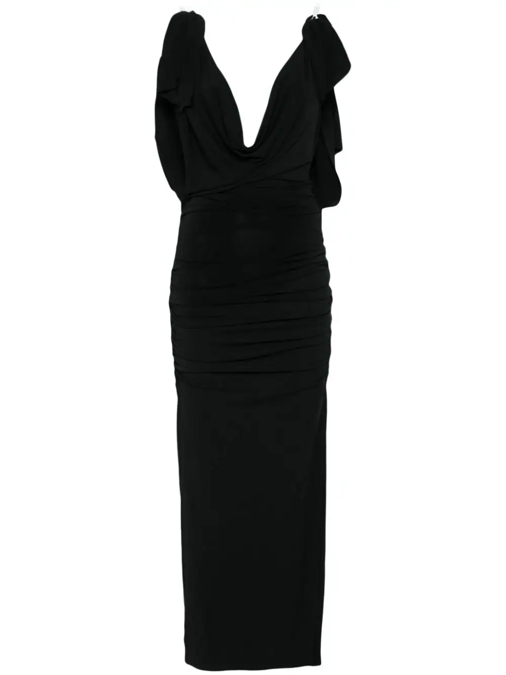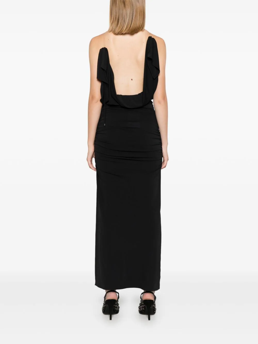 Rochie maxi The Attico Ruched negru, design drapat din acetat, cu decolteu asimetric, spatele gol, barete tranparente, detalii plisate pe toata suprafata produsului si tiv drept. Acest produs este realizat manual. Potrivit pentru sezonul toamna/iarna. 75% acetat; 20% poliamida; 5% alte fibre.