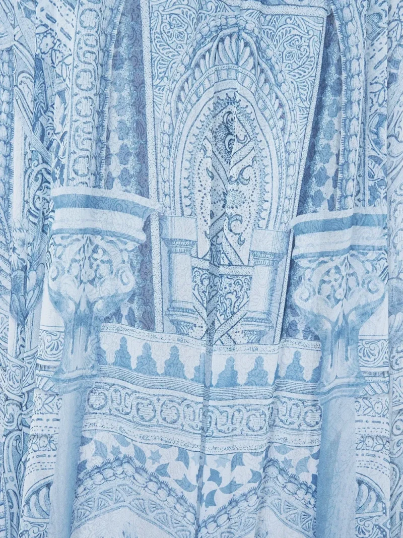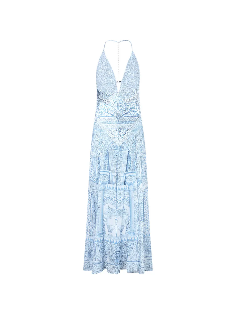 Rochie maxi The Hum Of The Alhambra Hardware Detail Slip albastru, realizata din matase, cu barete tip spaghetti, decolteu in V, grafica Alhambra imprimata pe toata suprafata si tiv evazat. Potrivita pentru sezonul primavara/vara. 100% matase.