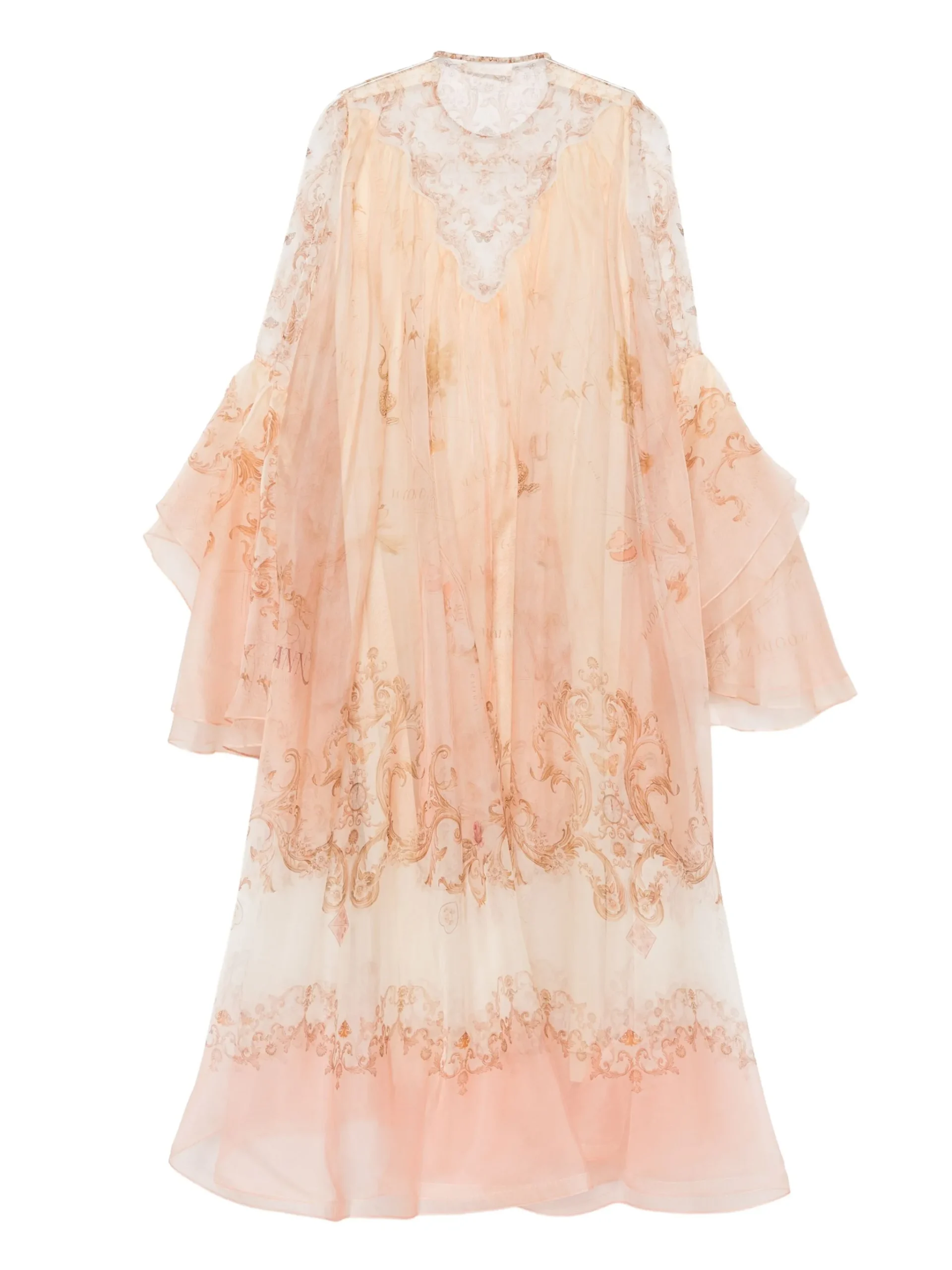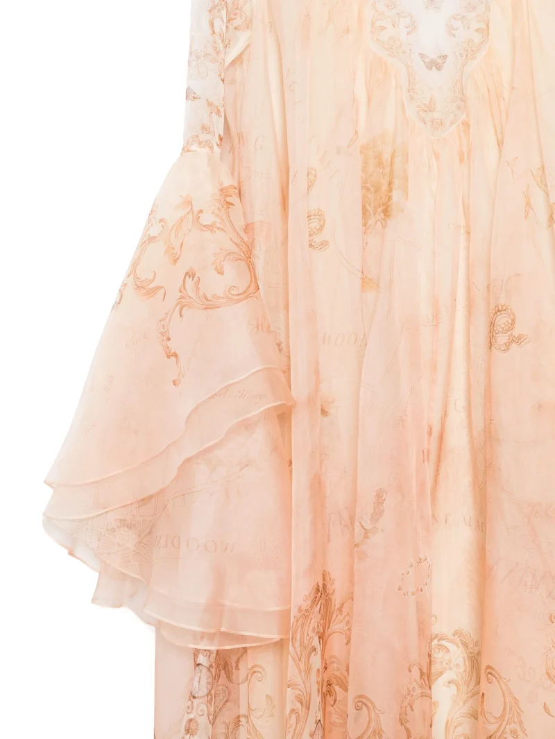 Rochie maxi Zimmermann Hypnotic roz, cu maneci medii bufante, grafica florala imprimata, volane decorative.si croiala in forma A-line. 100% matase
