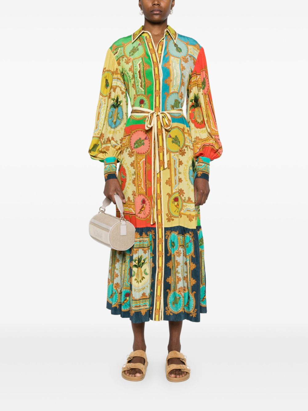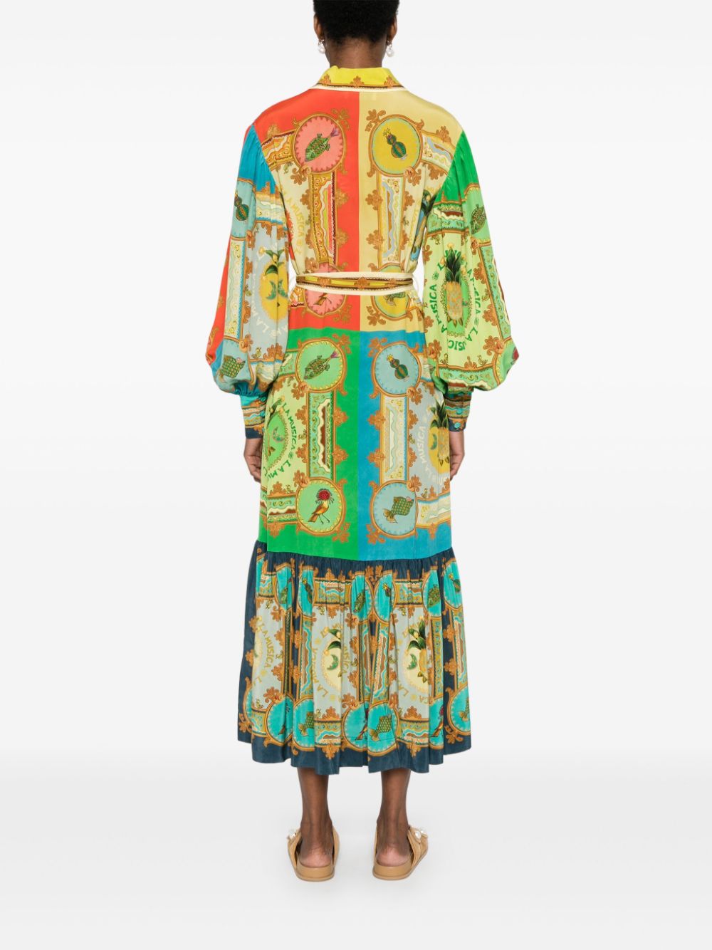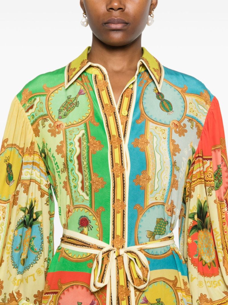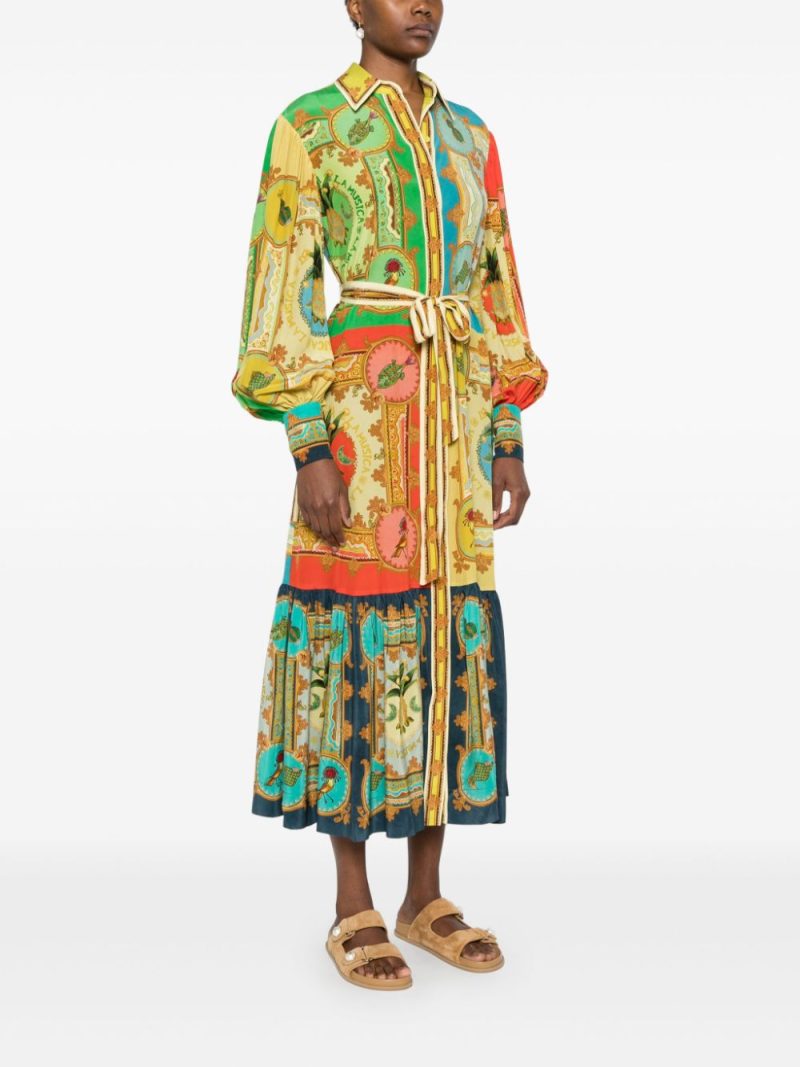 Rochie midi Alemais La musica multicolor, din matase satinata, cu guler clasic, inchidere cu nasturi ascunsi, maneci lungi bufante, mansete cu nasturi, cordon textil in jurul taliei, grafica La musica color-block imprimata si tiv cu volane decorative. Potrivita pentru sezonul primavara/vara. 100% matase.