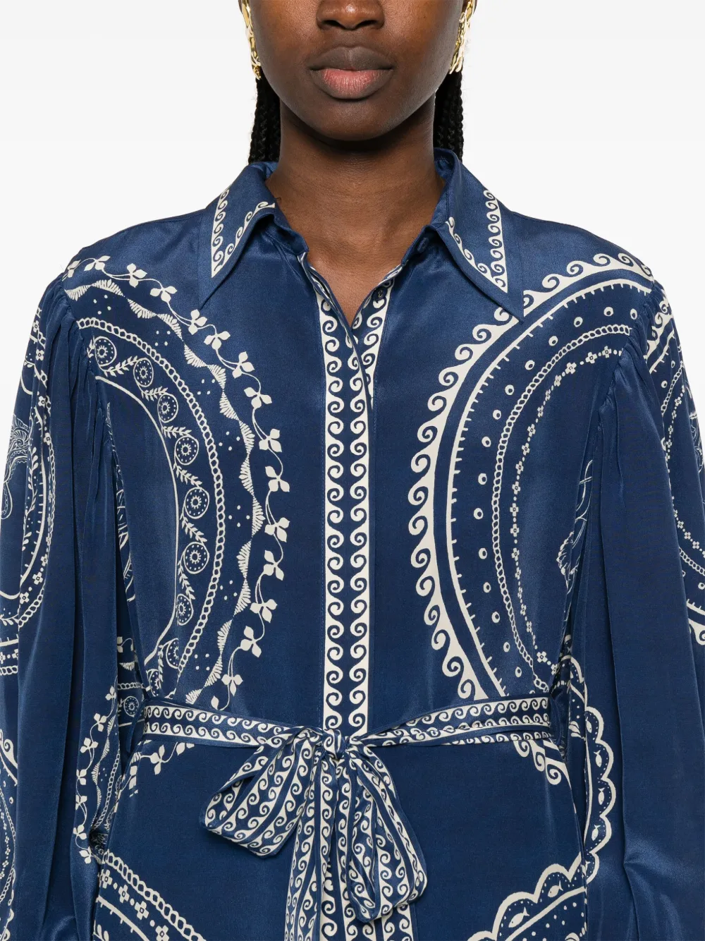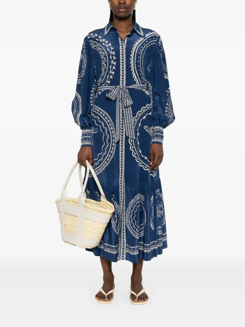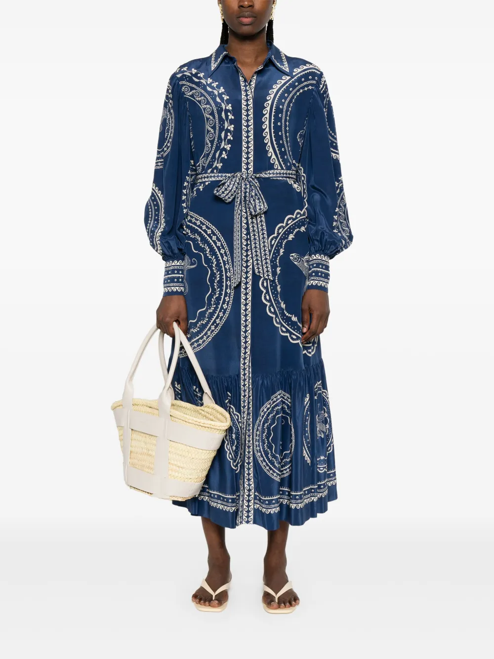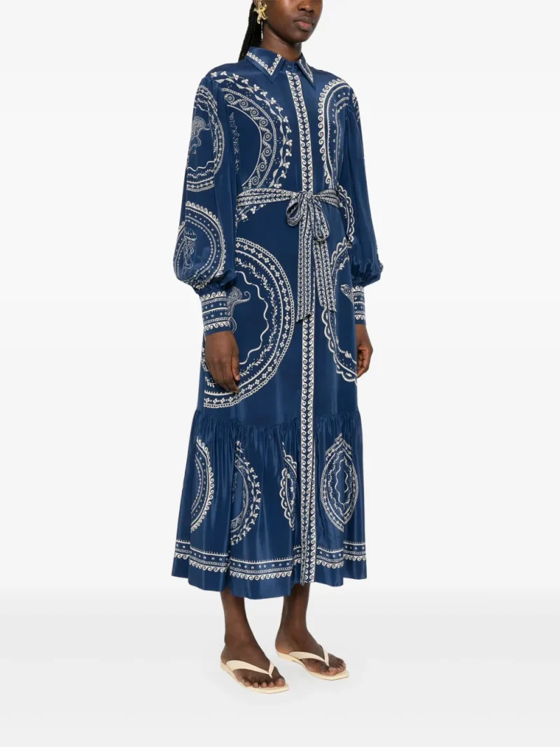 Rochie midi Alemais Ocean albastru, din matase, tip camasa, cu guler clasic, inchidere cu nasturi ascunsi, maneci lungi, mansete cu nasturi, grafica Ocean imprimata pe toata suprafata, cordon in jurul taliei si tiv cu volan decorativ. Potrivita pentru sezonul toamna/iarna. 100% matase; 100% matase.