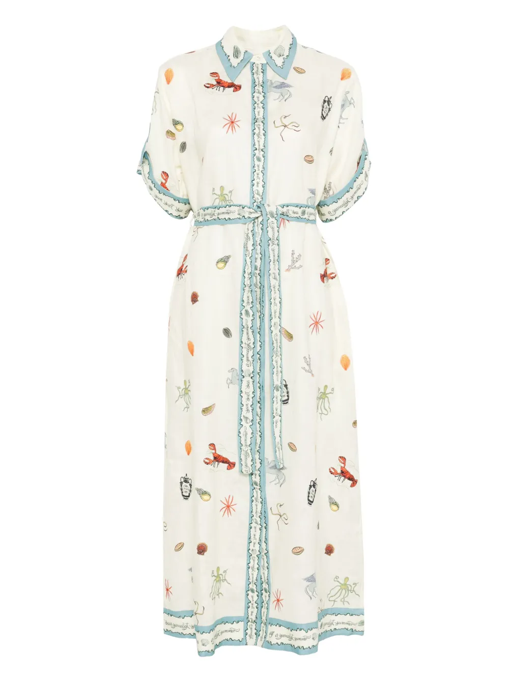 Rochie midi Alemais Sandy bej, din in, cu inchidere nasturi, guler clasic, maneci scurte, grafica Sandy imprimata pe toata suprafata, cordon textil in jurul taliei si tiv drept. Potrivita pentru sezonul primavara/vara. 100% in certificat; 100% bumbac.
