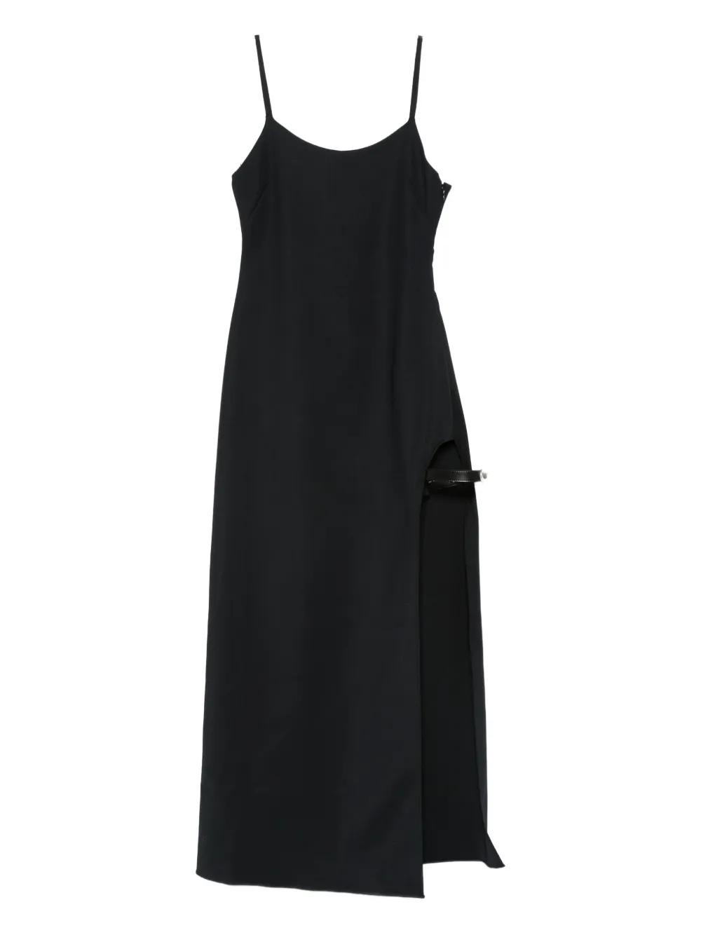 Rochie midi Coperni Side-Split Strap negru, cu barete subtiri pentru umeri, decolteu, inchidere laterala cu fermoar, slit pe un picior decorat cu bareta logo si tiv drept. Potrivita pentru sezonul toamna/iarna. 51% bumbac; 44% poliester; 5% elastan.