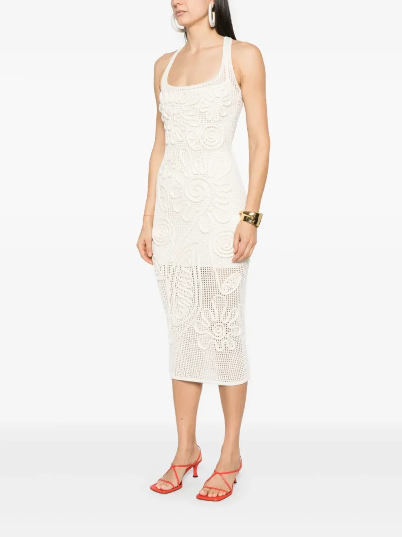 Rochie midi Cult Gaia Nissa alb, design semitransparent din bumbac, cu guler rotund, spate tip racerback, flori decorative aplicate, tesatura texturata si tiv drept. Potrivita pentru sezonul primavara/vara. 100% bumbac.