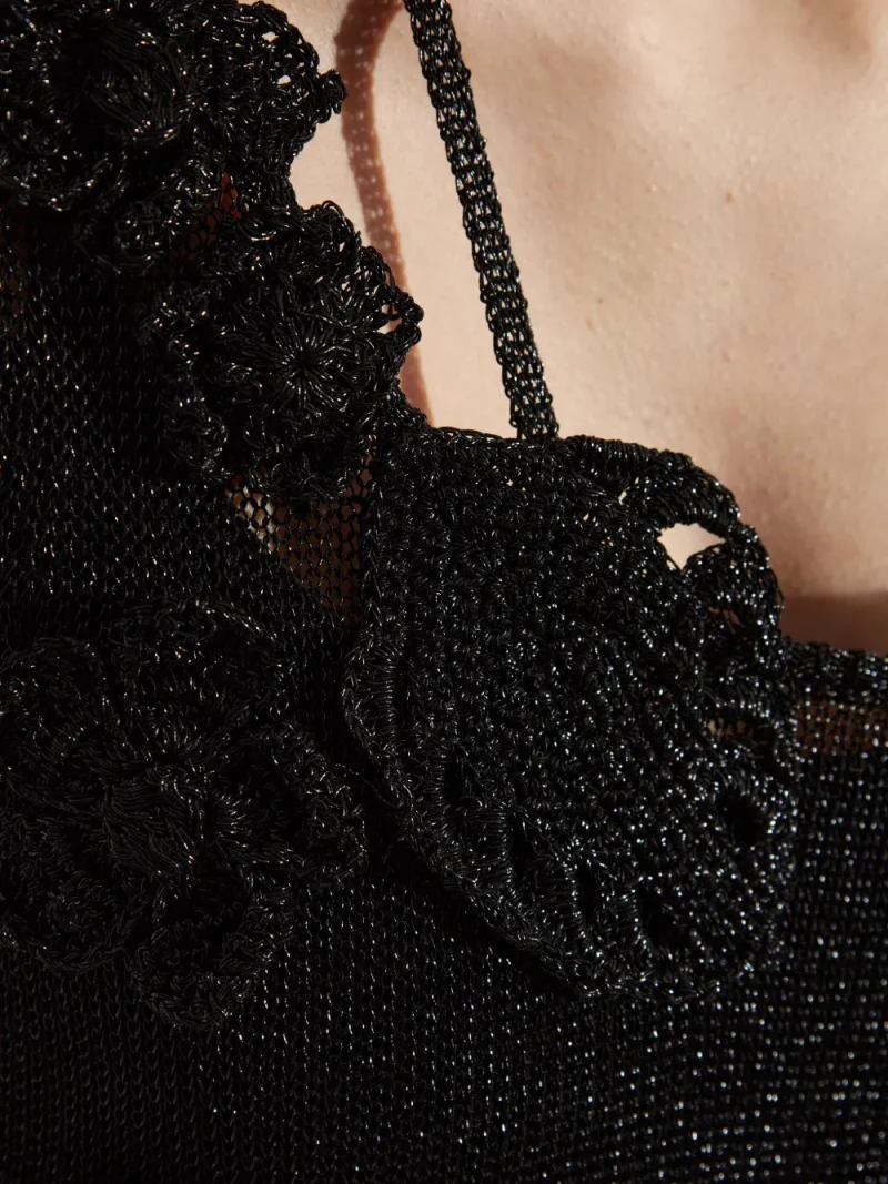 Rochie midi Cult Gaia Pemma negru, constructie semitransparenta din viscoza, cu barete late pentru umeri late, decolteu rotund, flori decorative din dantela aplicate si tiv drept. Potrivita pentru sezonul primavar/vara. 100% viscoza.