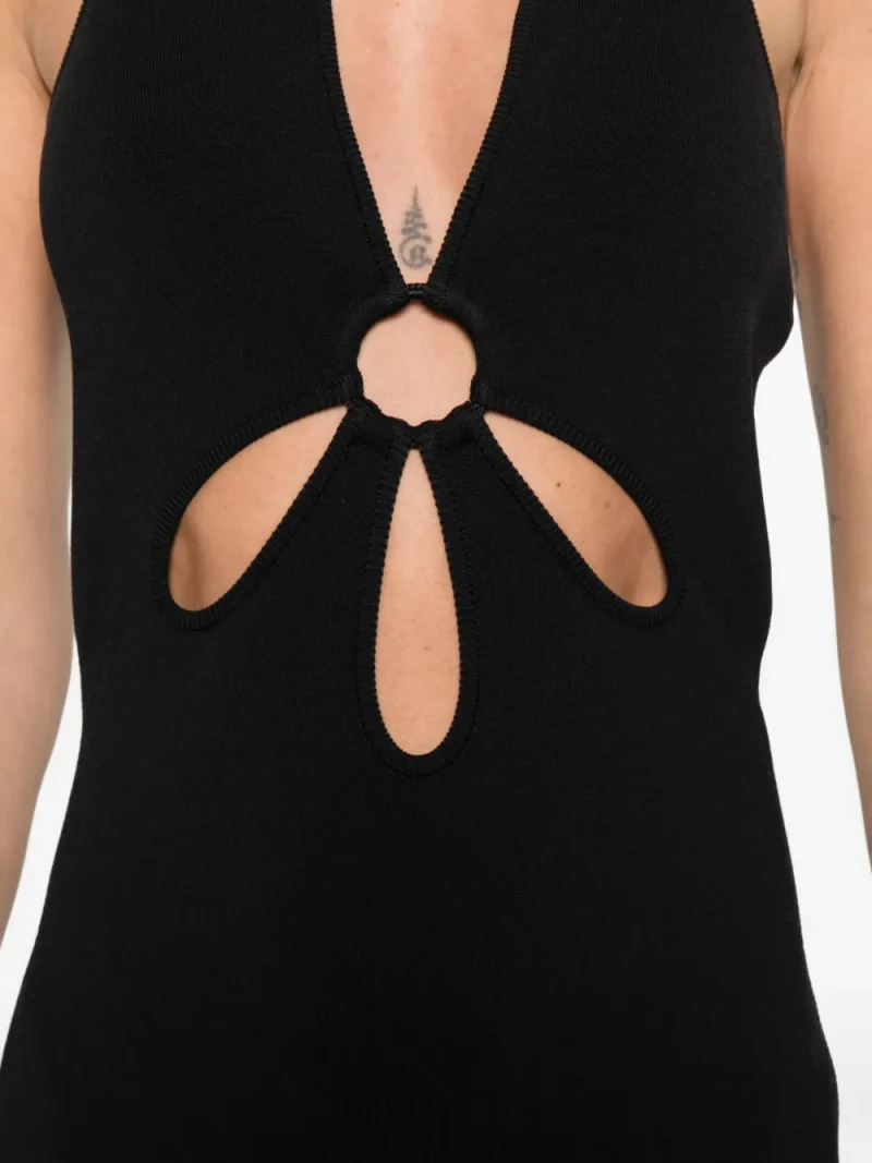 Rochie midi Cult Gaia Vinna negru, realizata din amestec de raion, cu guler halterneck, spatele gol, croiala mulata, detalii florale cut-out si tiv drept. Potrivita pentru sezonul primavara/vara. 53% rayon; 46% nylon; 1% spandex.