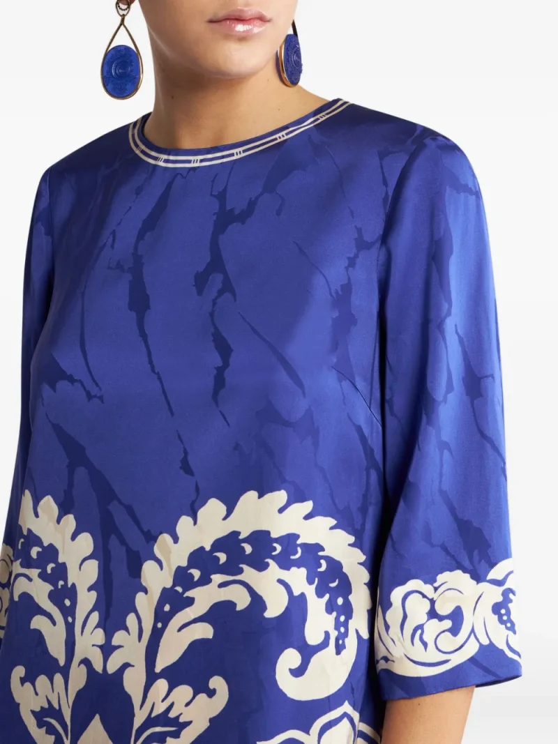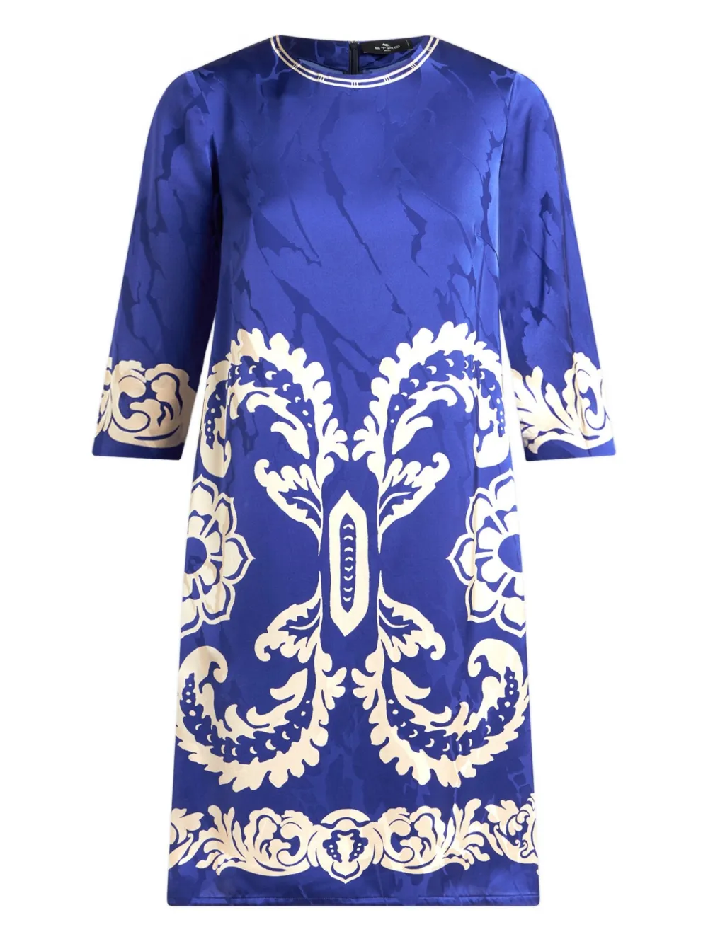 Rochie midi ETRO Jacquard-Pattern albastru, din viscoza, cu guler rotund, inchidere cu fermoar la spate, maneci medii, grafica Jaquard imprimata si tiv drept. Potrivita pentru sezonul primavara/vara. 100% viscoza.