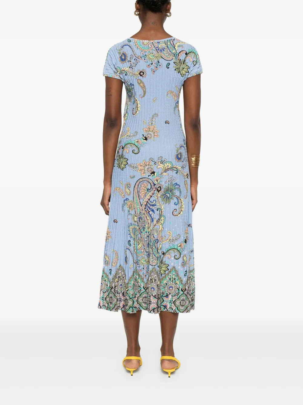 Rochie midi ETRO Paisley-Print albastru, din tricot fin, cu decolteu adanc, maneci scurte, cusaturi in relief, grafica florala in tesatura, croiala stramta pe talie si tiv evazat. 60% bumbac; 40% viscoza.