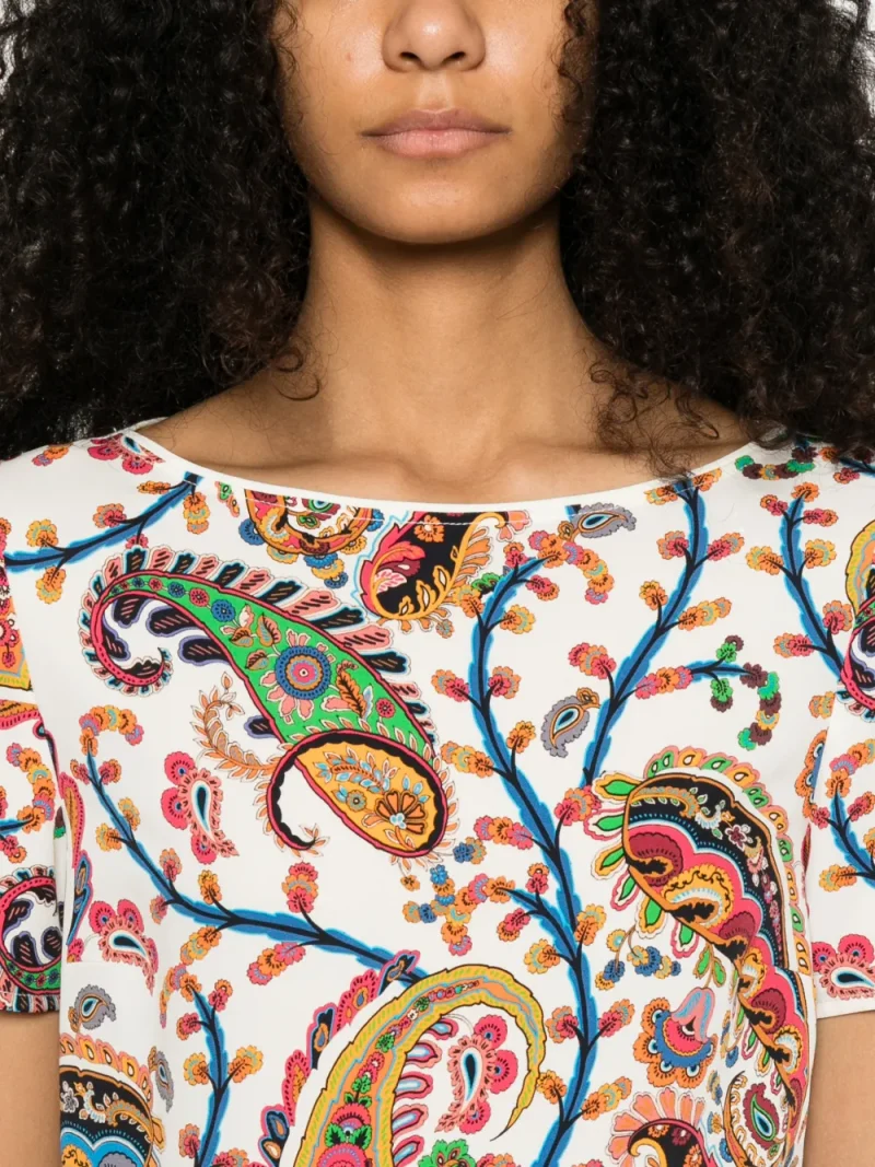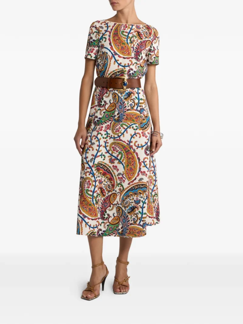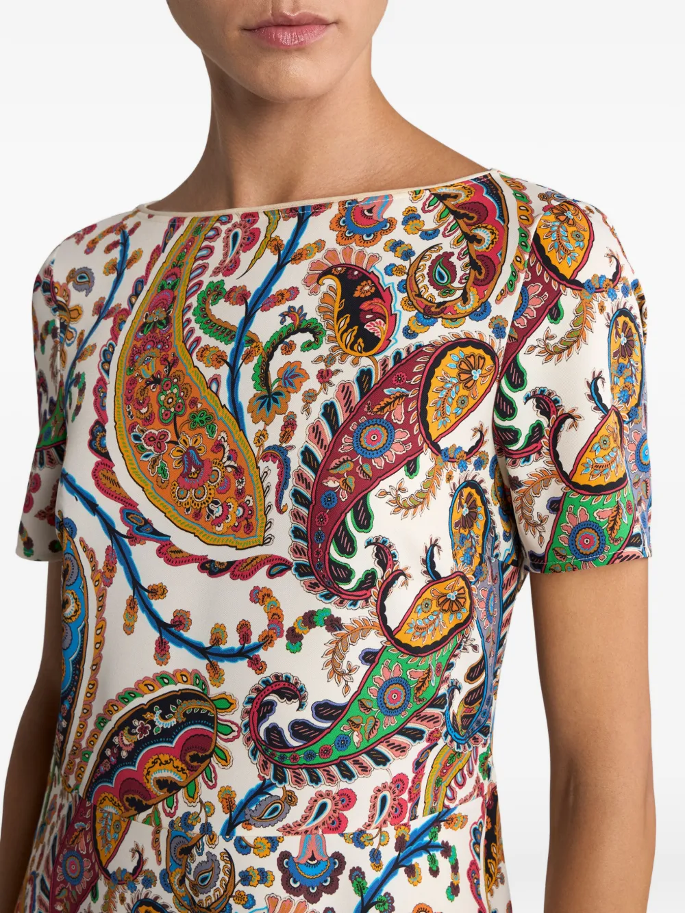 Rochie midi ETRO Paisley-Print multicolor, A-line, cu guler barcuta, inchidere cu fermoar ascuns pe lateral, maneci scurte, grafica Paisley imprimata pe toara suprafata si tiv drept. Potrivita pentru sezonul primavara/vara. 95% poliester; 5% elastan.