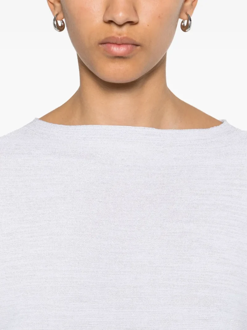 Rochie midi Fabiana Filippi Lurex alb, din bumbac, cu guler rotund, umeri cazuti, maneci medii, tricotata integral si cu tiv drept. Potrivita pentru sezonul primavara/vara. 68% bumbac; 25% poliester; 7% poliester.