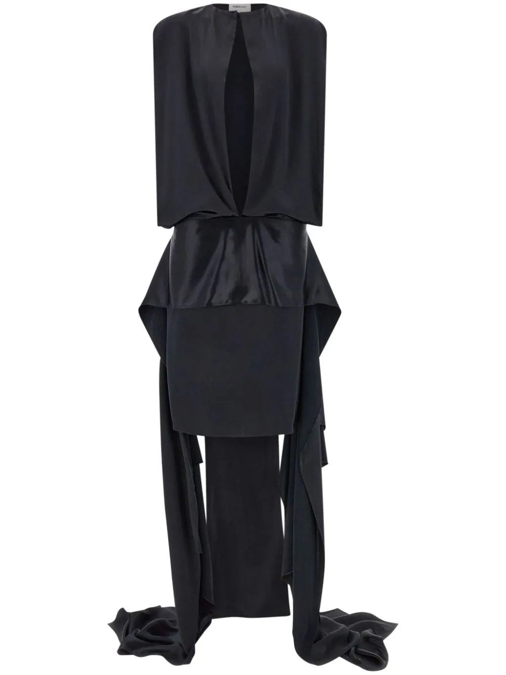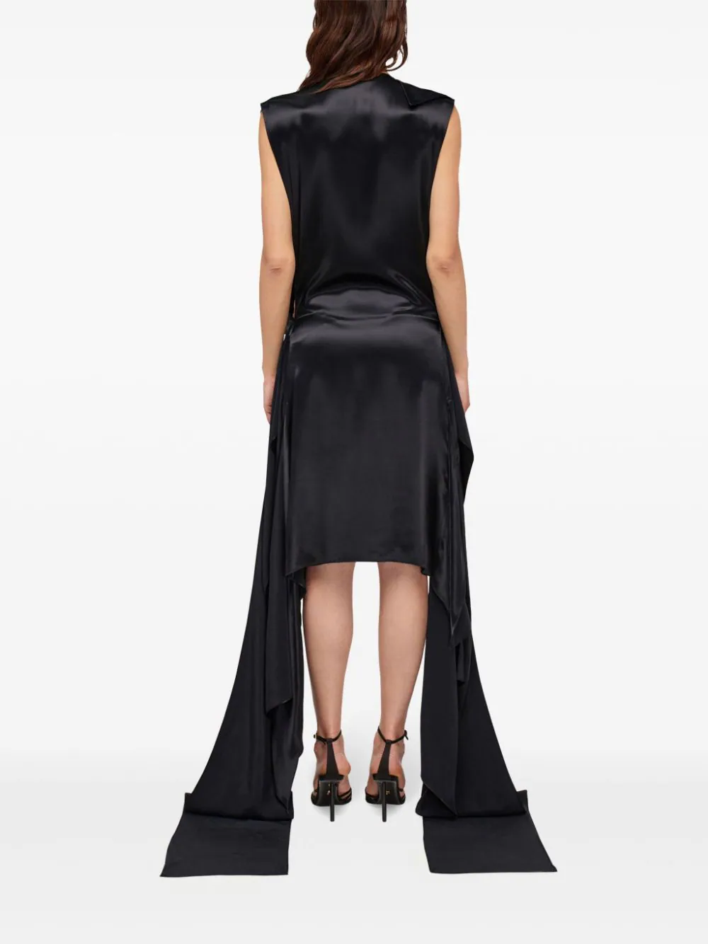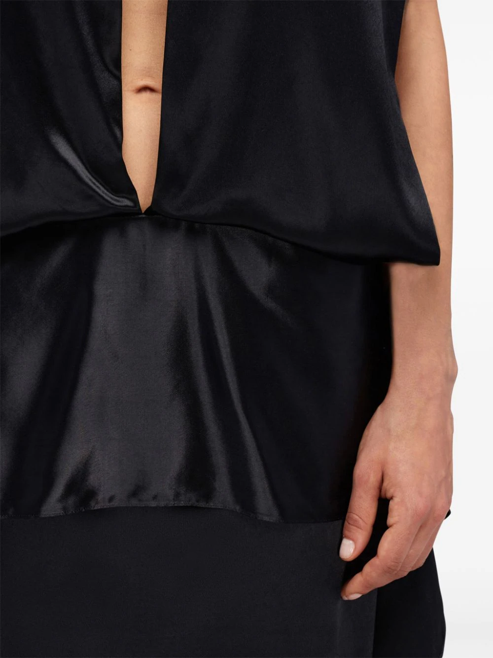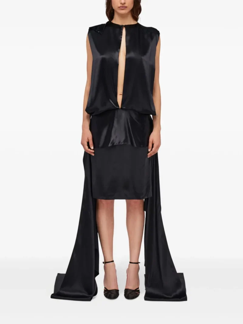 Rochie midi Ferragamo Satin-Weave Slit-Detail negru, din viscoza satinata, cu guler rotund, fara maneci, decupaj pe partea din fata, detaliu Slash si tiv peplum. Potrivita pentru sezonul toamna/iarna. 100% viscoza.