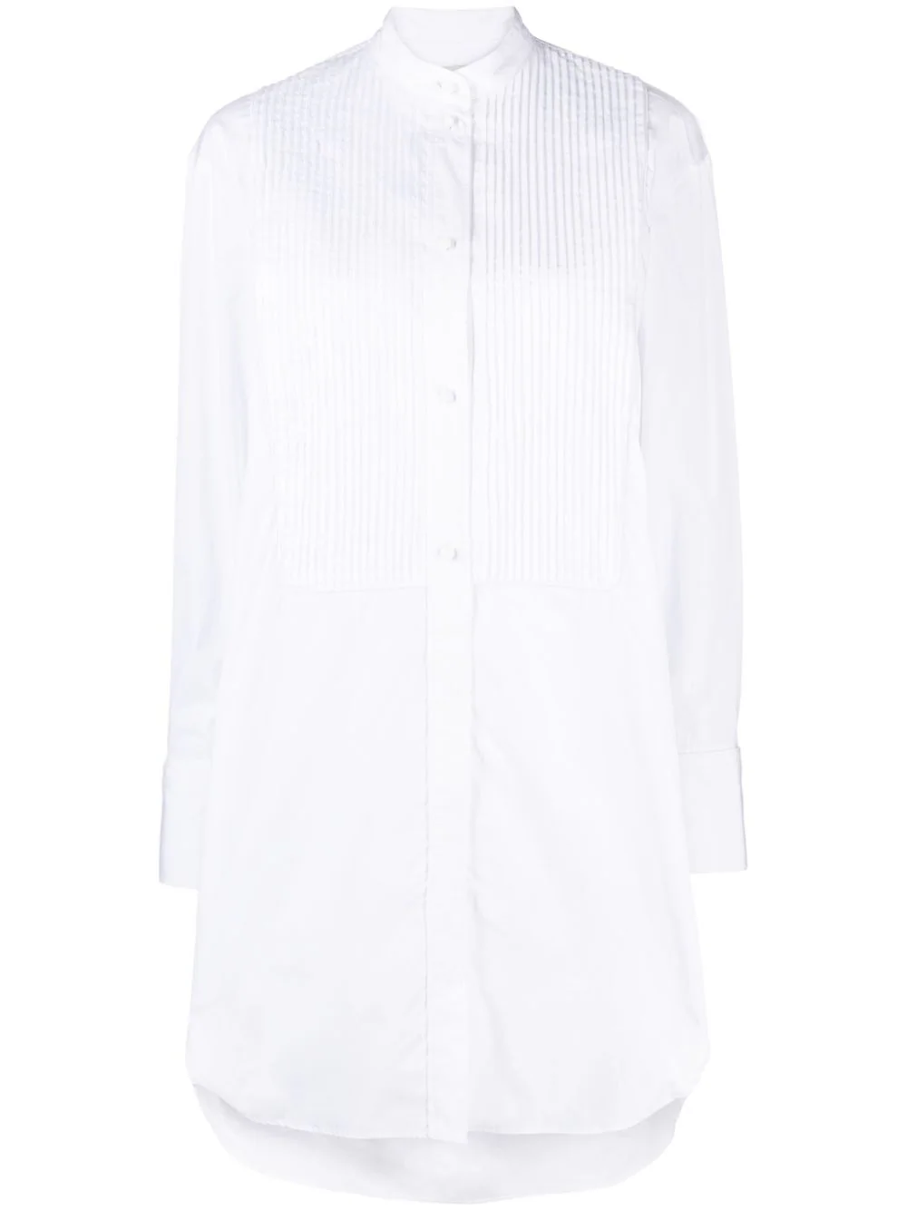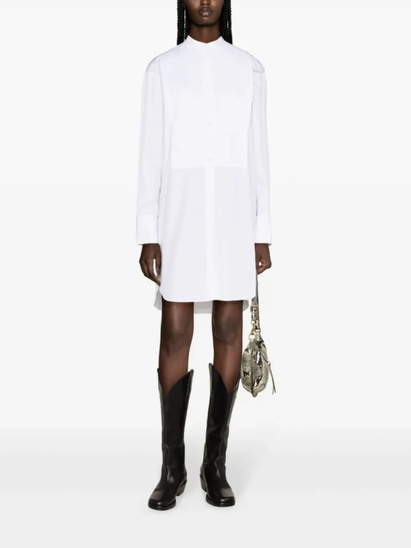 Rochie midi alba din bumbac poplin, cu guler tunica si inchidere cu nasturi la vedere, maneci lungi, mansete cu nasturi, design plisat pe partea din fata, slituri laterale, croiala relaxata si tiv asimetric, rotunjit. Potrivita pentru sezonul primavara/vara. 100% bumbac.