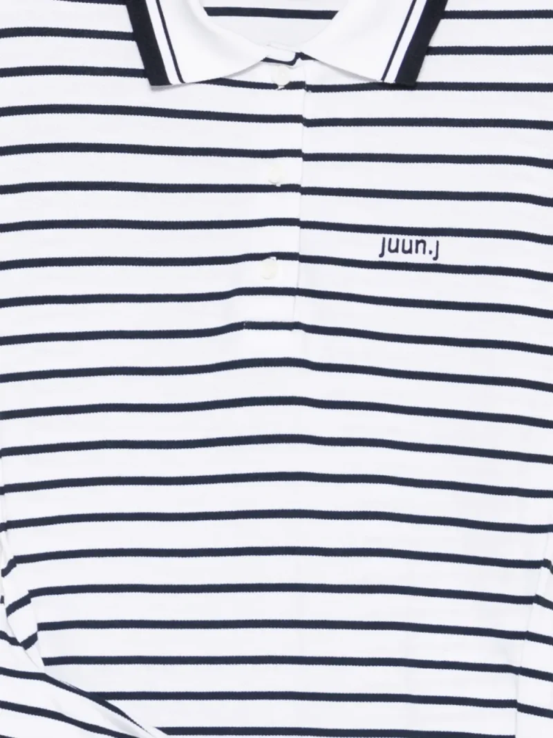 Rochie midi Juun.J Striped alb, realizata din bumbac, wrap-design, cu guler polo, maneci scurte, inchidere partiala cu nasturi, grafica in dungi, logo brodat la piept si tiv drept. Potrivita pentru sezonul primavara/vara. 100% bumbac; 97% poliester; 3% poliuretan.