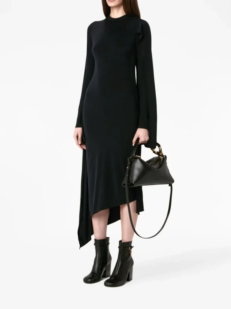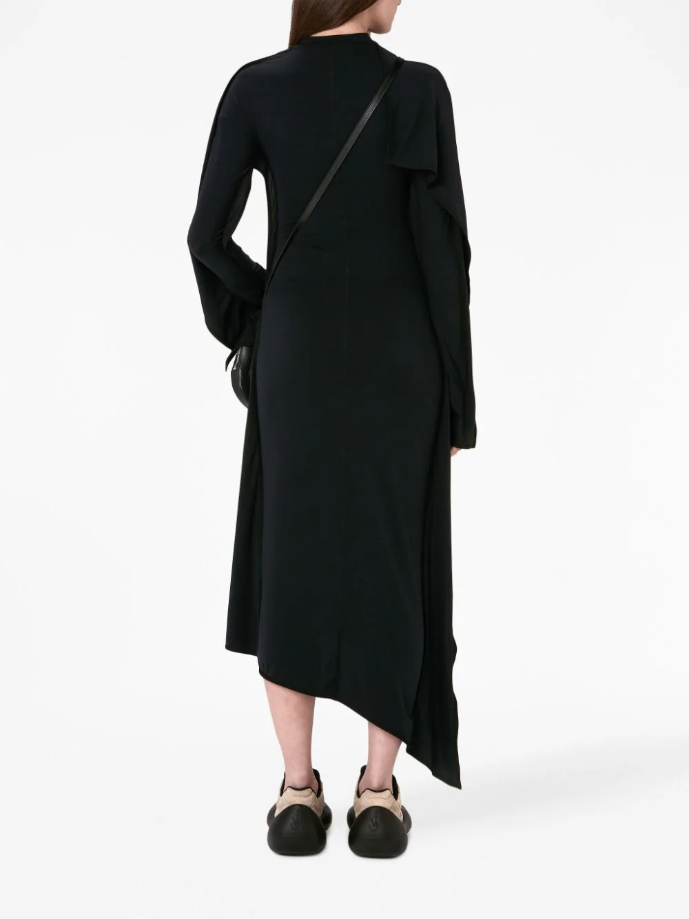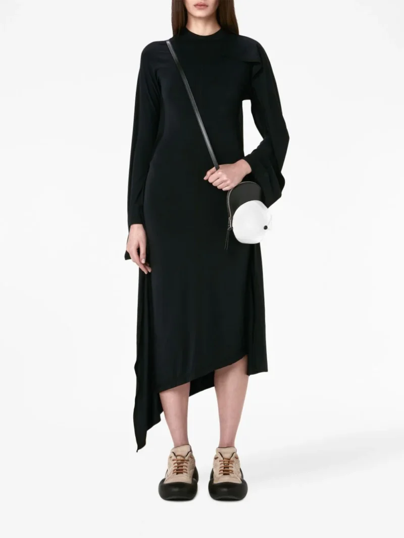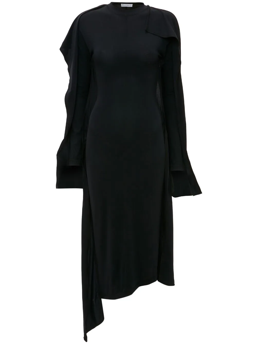 Rochie midi neagra din materiale sintetice, slim fit, cu guler rotund, maneci lungi, design in straturi si tiv asimetric. Potrivita pentru sezonul toamna/iarna. 87% poliamida; 13% elastan.