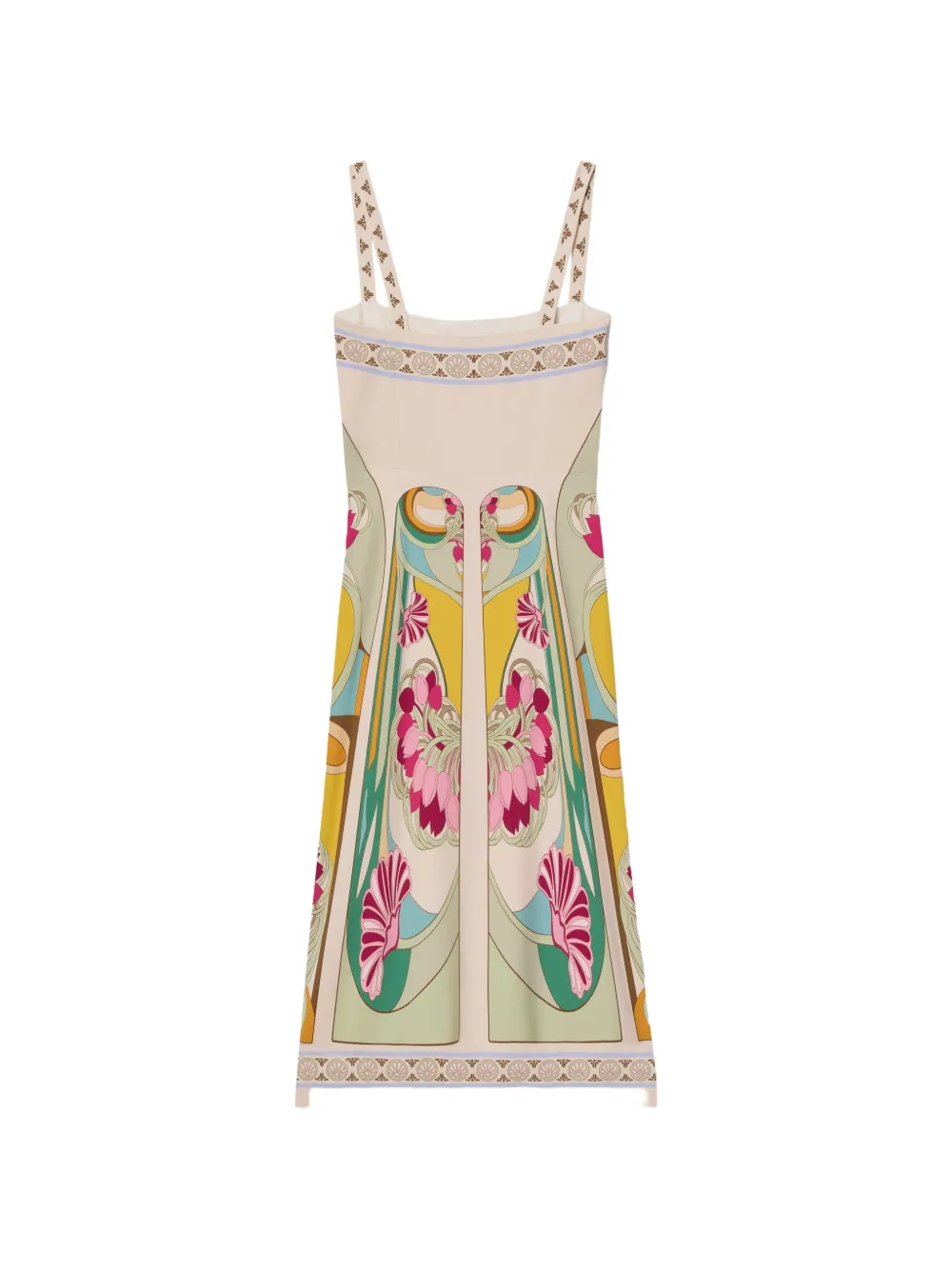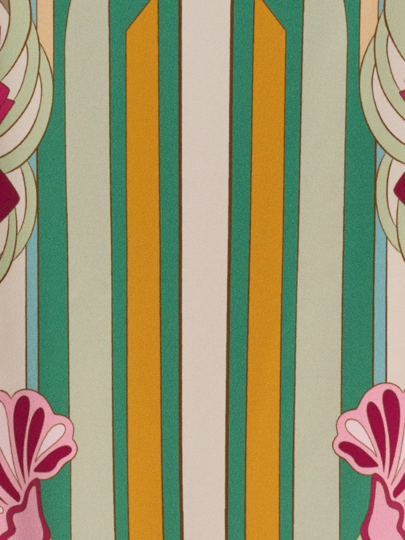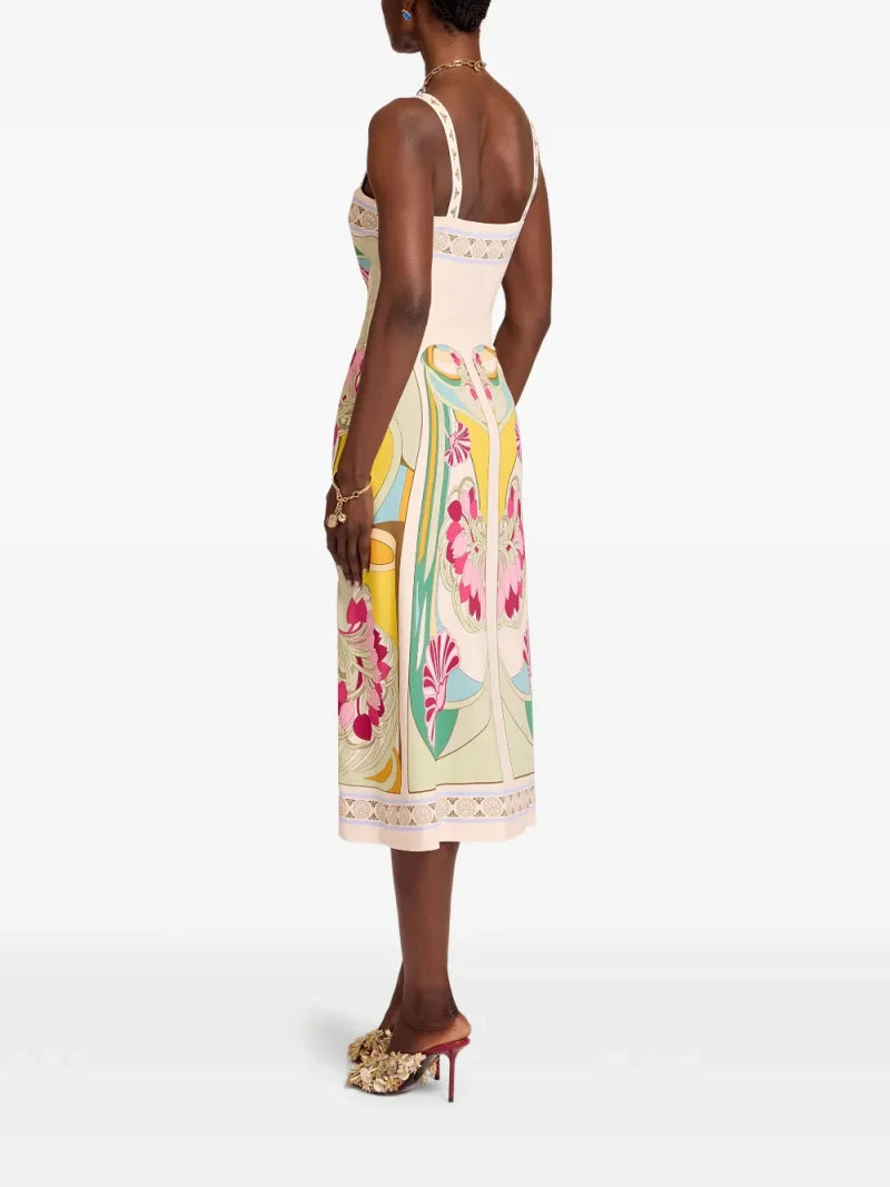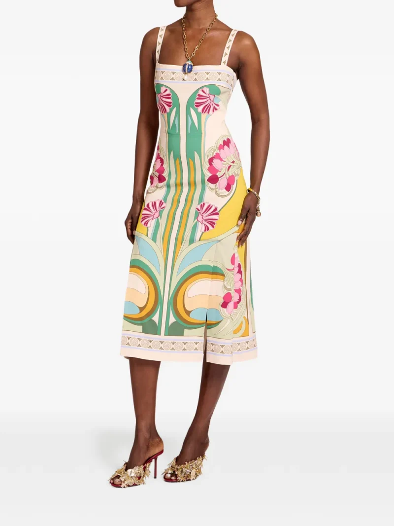 Rochie midi La DoubleJ Magnifico multicolor, confectionata din twill de viscoza, cu partea superioara tip corset, barete late pentru umeri, fusta construita din trei panouri, silueta tip clepsidra, grafica cu lalele ultra-sofisticate aplicata manual cu maiestrie si tiv drept. Potrivita pentru sezonul primavara/vara. 96% viscoza; 4% elastan.