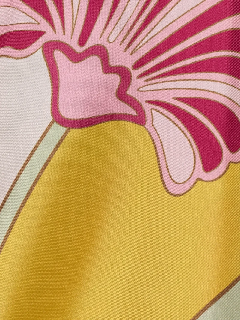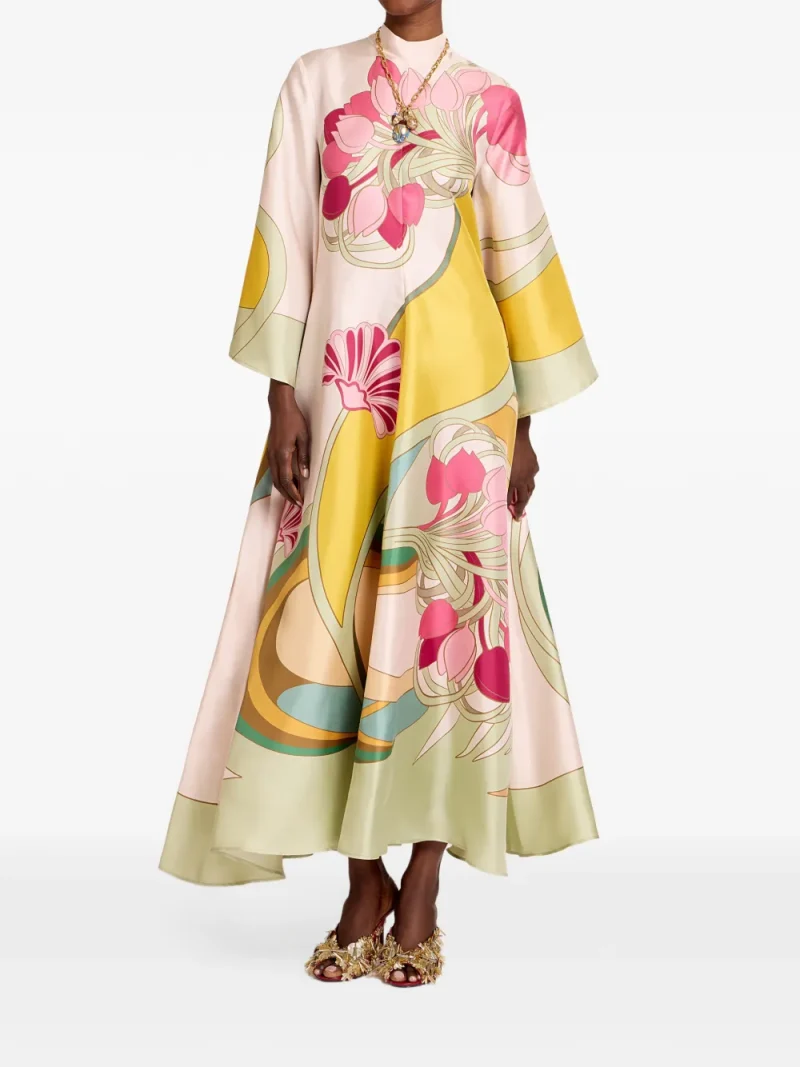 Rochie midi La DoubleJ Magnifico multicolor, construita din twill de matase, cu guler ridicat, inchidere cu esarfa la spate, maneci cascada drapate, grafica Magnifico cu lalele ultra-sofisticate aplicata manual, croiala lejera si tiv evazat. Potrivita pentru sezonul primavara/vara. 100% matase.