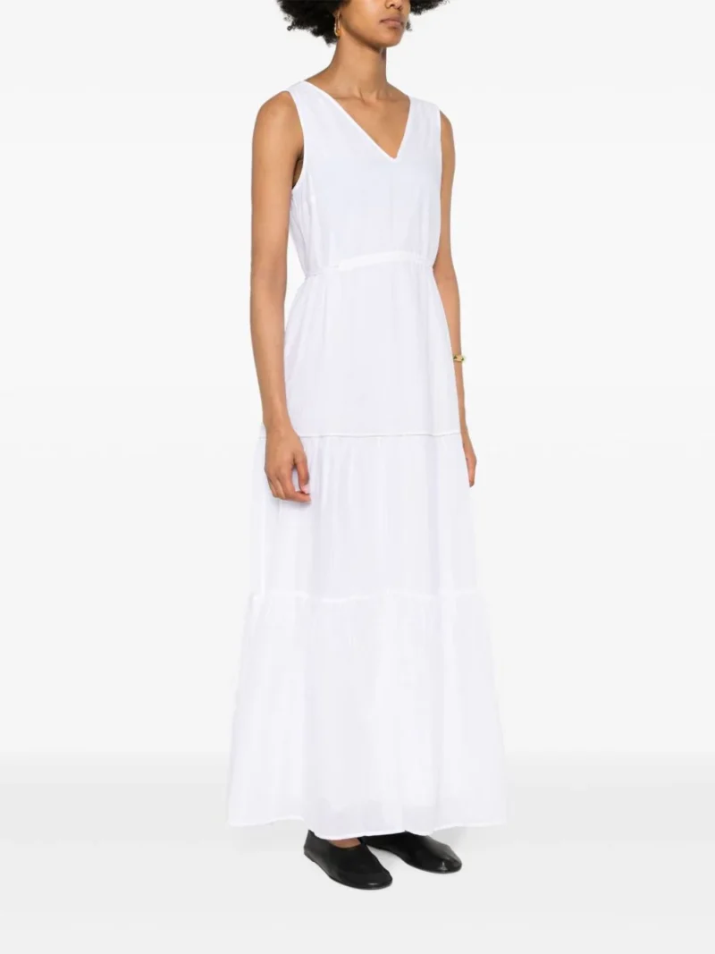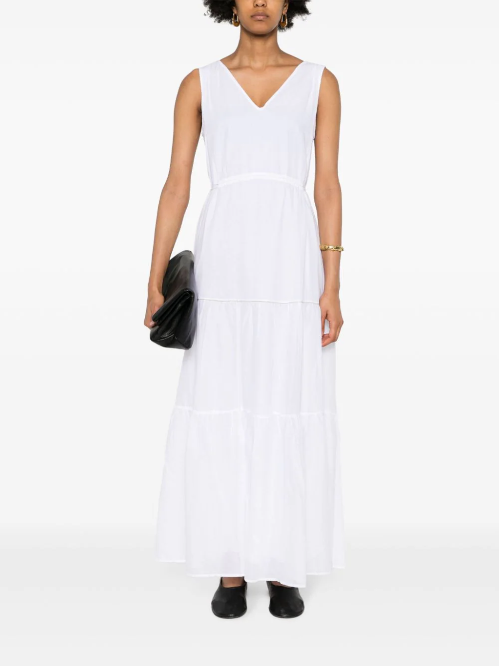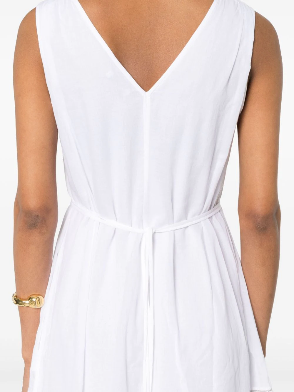 Rochie midi alba din bumbac, cu decolteu in V, spatele gol, fara maneci, detalii plisate, cordon bumbac in jurul taliei, cu captuseala din bumbac si tiv evazat. Potrivita pentru sezonul primavara/vara. 100% bumbac.