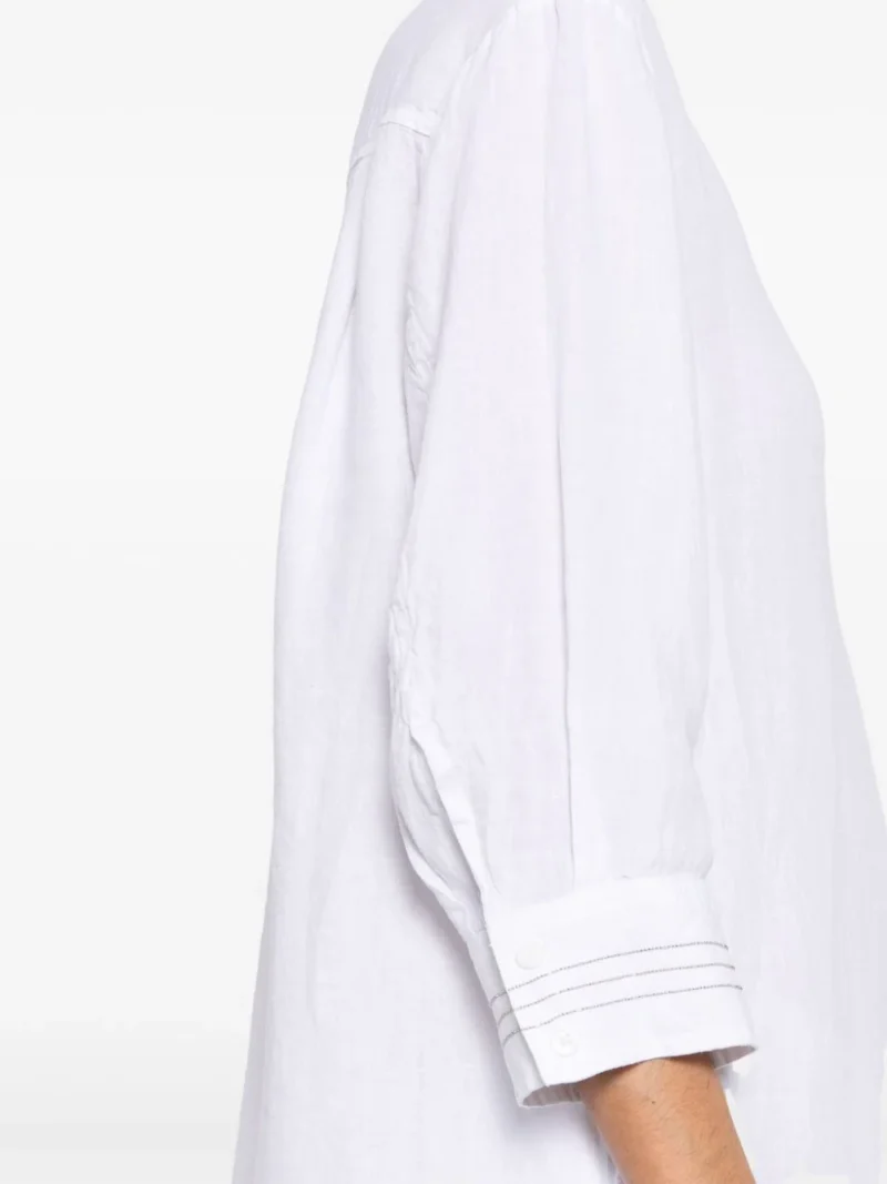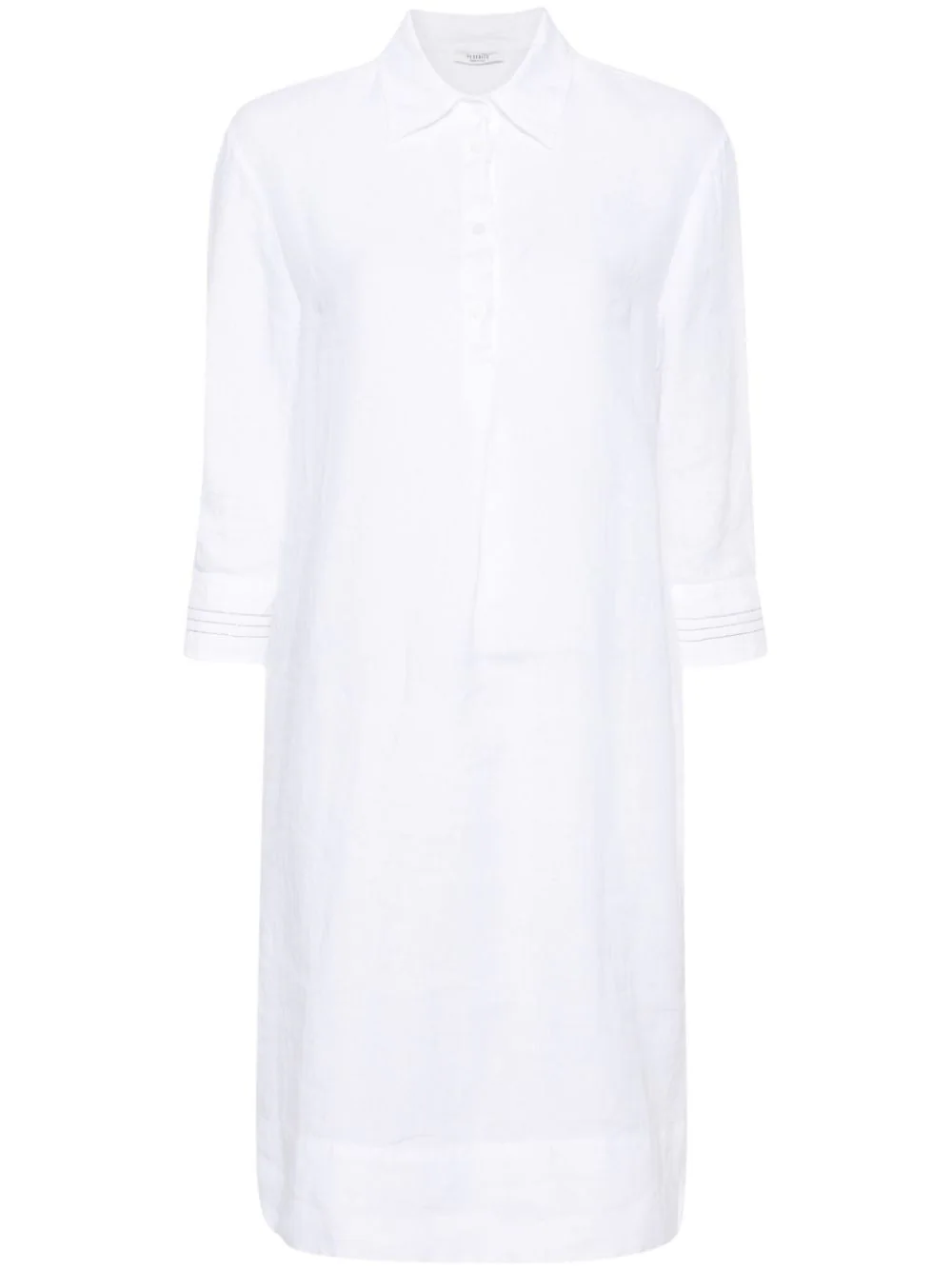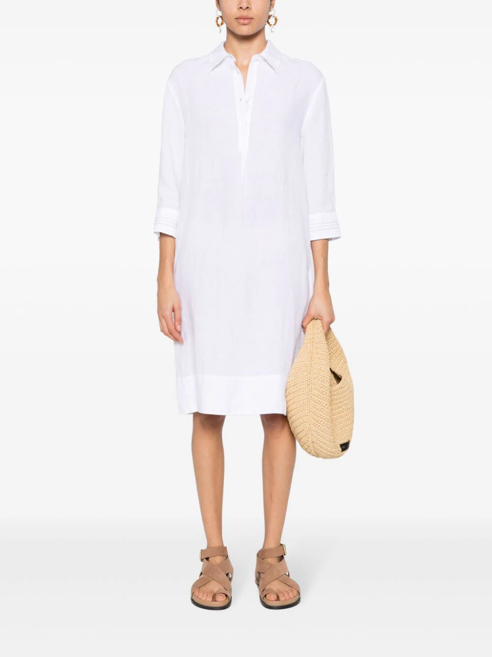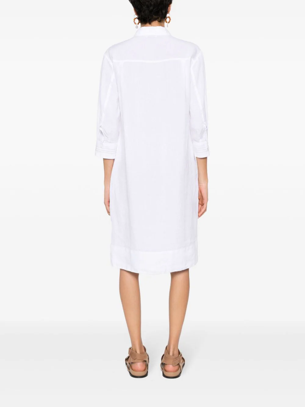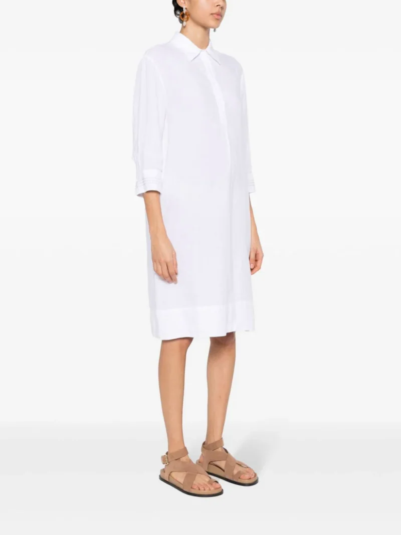 Rochie midi alba din in, tip camasa, cu guler clasic, inchidere cu nasturi, maneci medii, mansete late decorate cu margele si tiv drept. Potrivita pentru sezonul primavara/vara. 100% in.