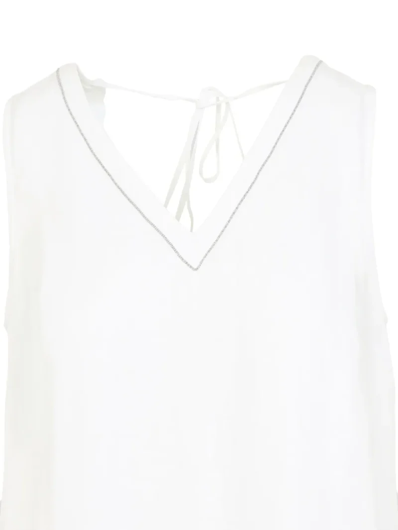 Rochie midi Peserico Linen alb, din bumbac, cu guler in V decorat cu cristale sclipitoare, inchidere cu snur la spate, fara maneci, croiala relaxata si tiv drept. Potrivita pentru sezonul primavara/vara. 100% bumbac.