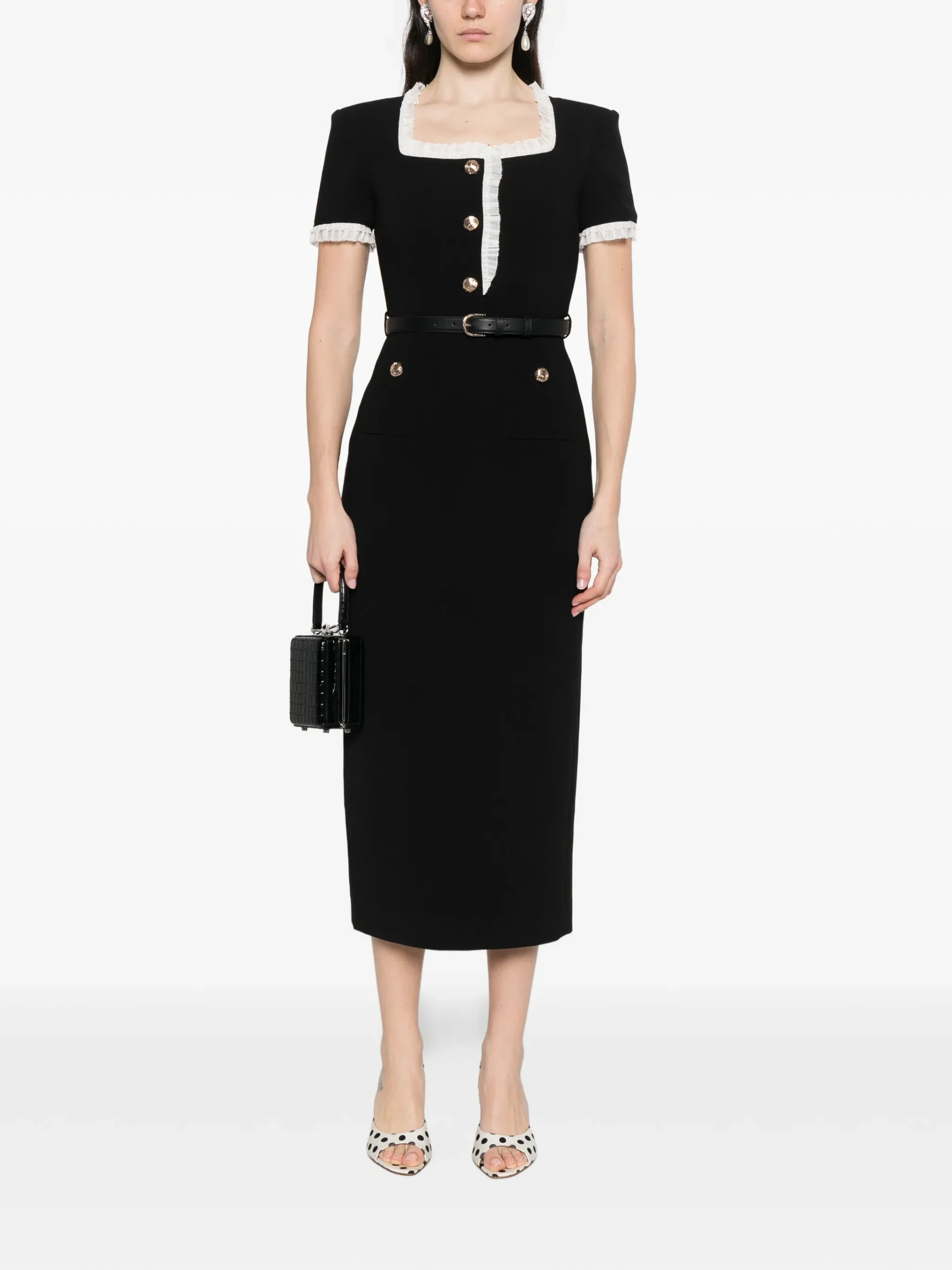 Rochie midi Self-Portrait Belted negru, cu nasturi aurii, cordon in talie, maneci scurte, decolteu patrat si margini scalloped.100% poliester