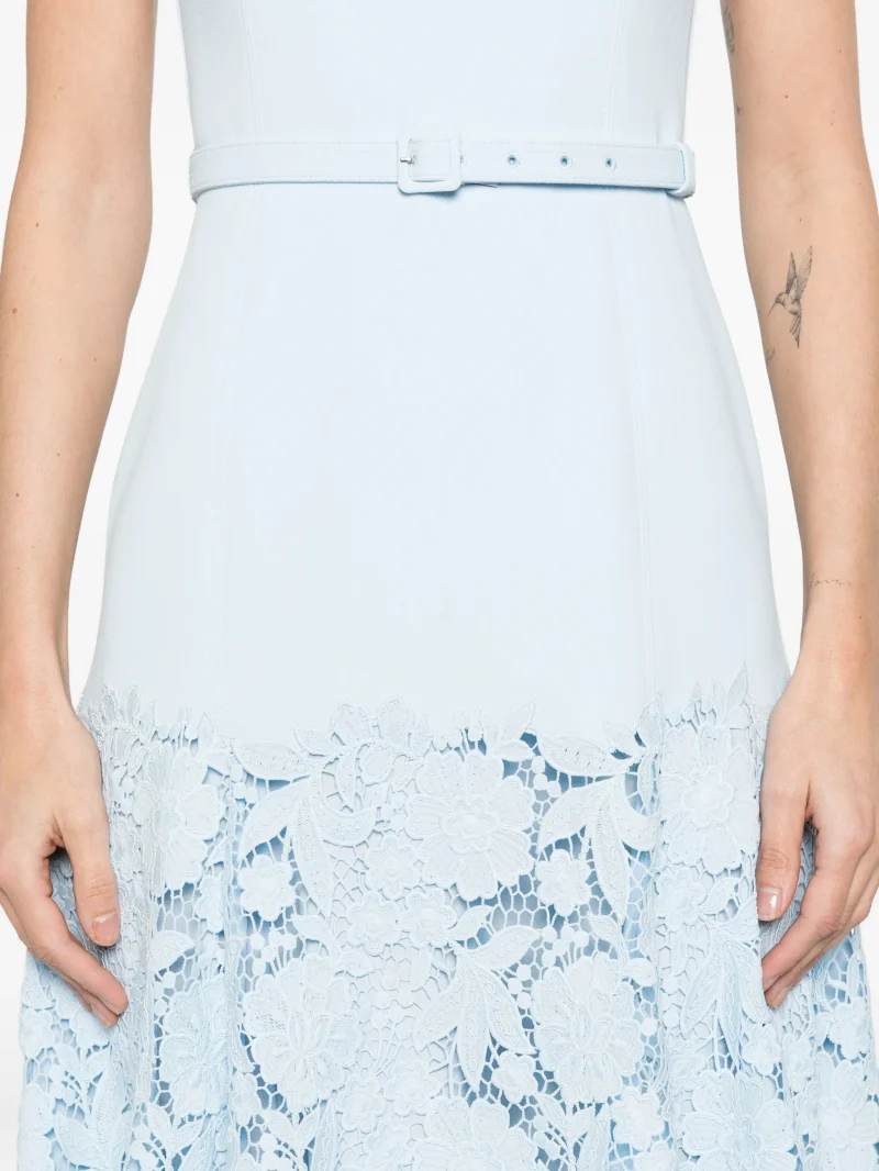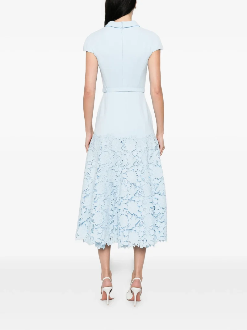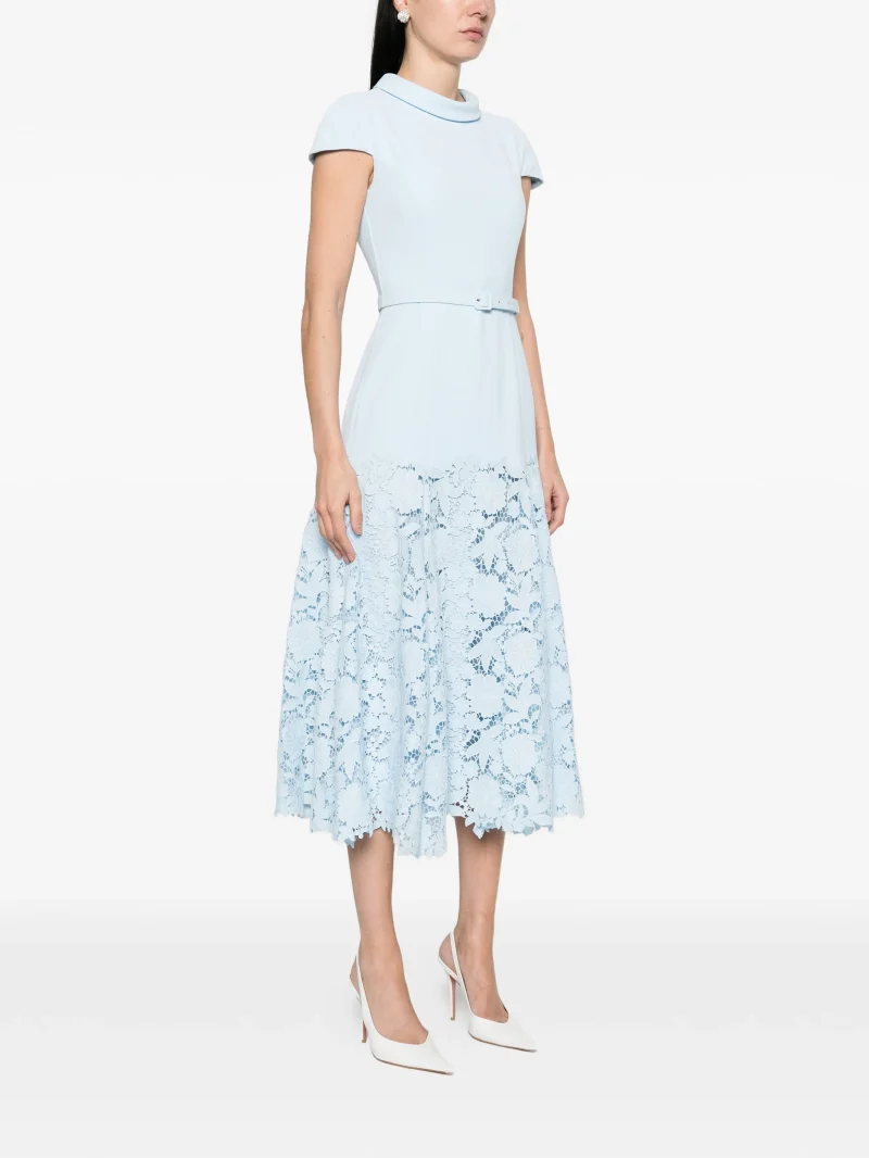 Rochie midi Self-Portrait crepe lace albastru, cu talie marcata cu cordon, decolteu rotund, maneci scurte, detalii din dantela si lungime midi.100% poliester