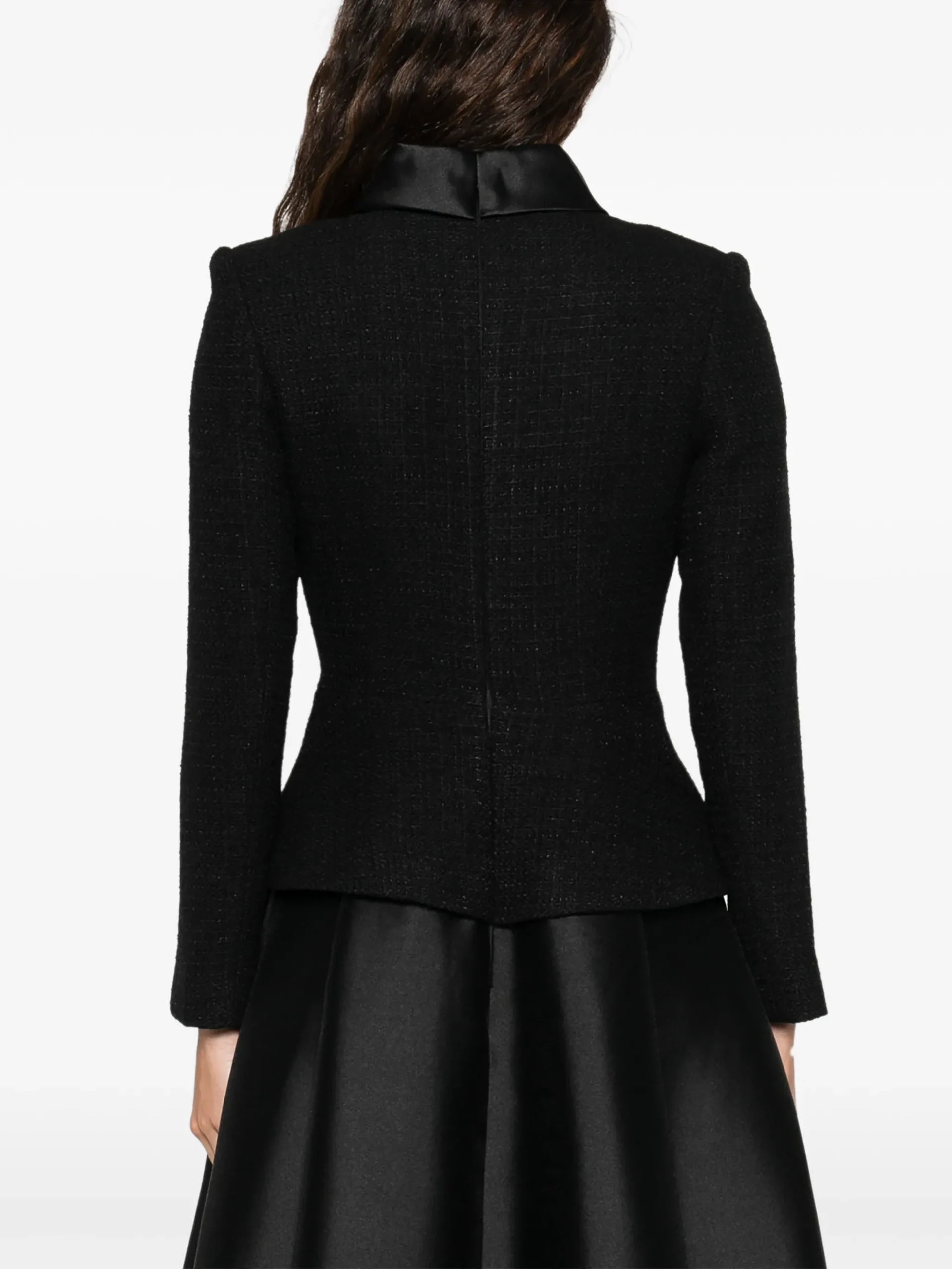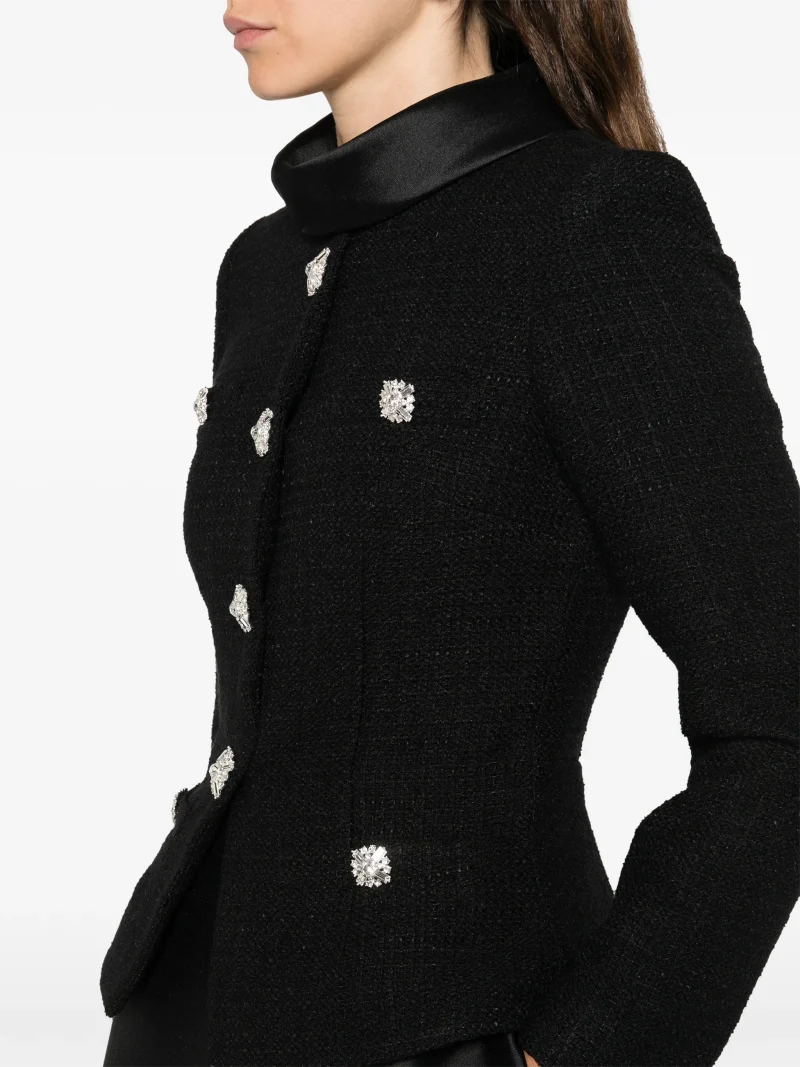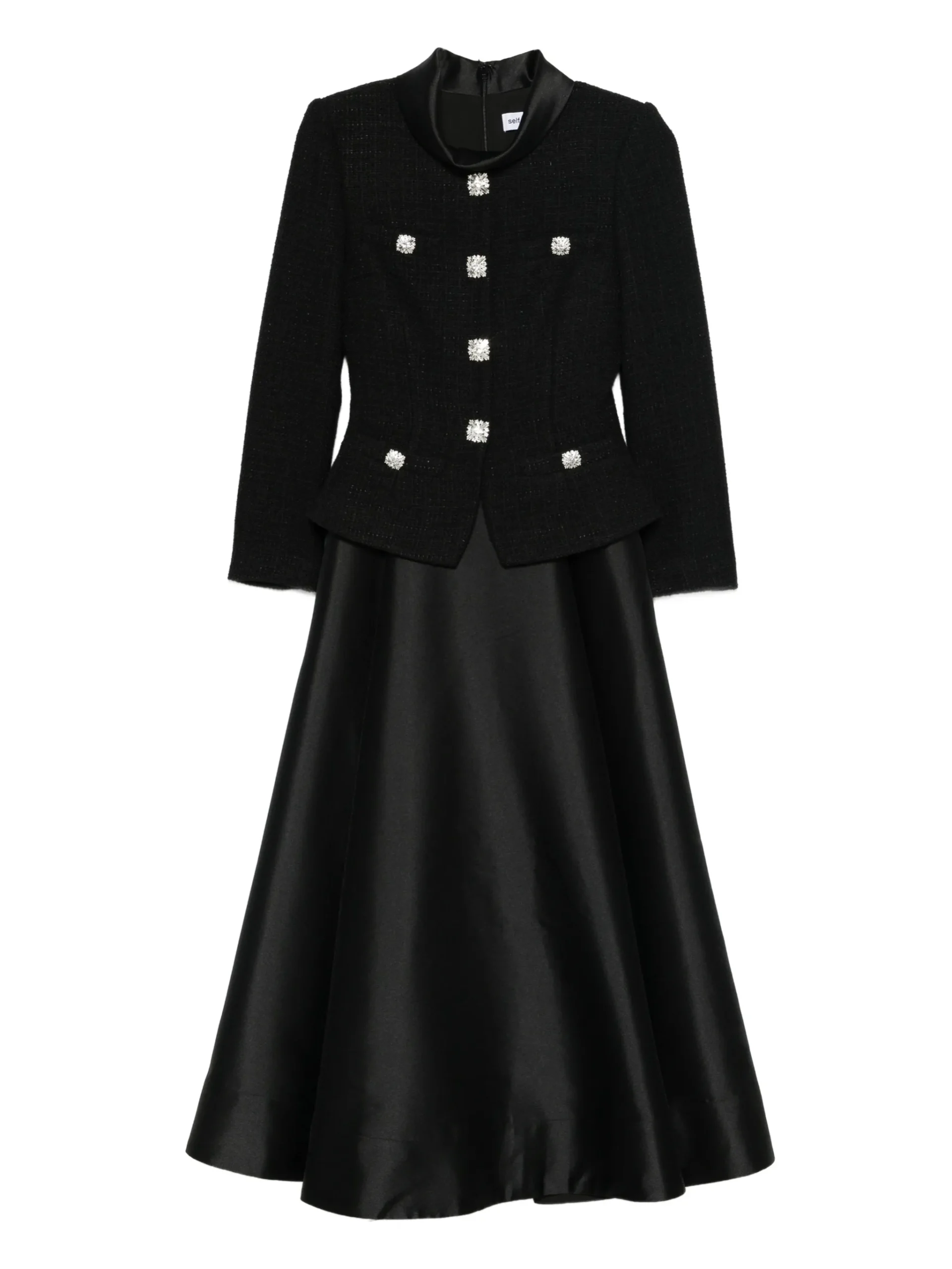 Rochie midi Self Portrait negru, cu nasturi decorativi, fusta in linie A, guler inalt si maneci lungi. 100% poliester
