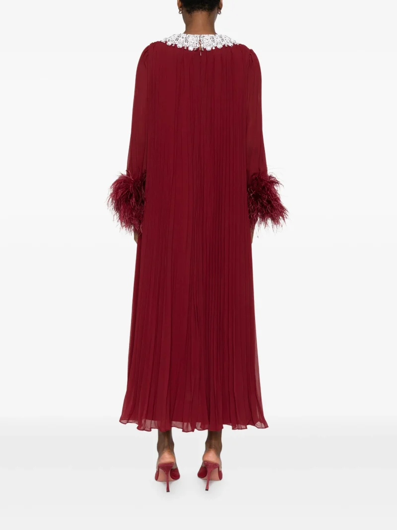 Rochie midi Self-Portrait burgundy, plisata, cu decolteu impodobit cu cristale, maneci lungi, terminatie cu pene si lungime midi. Potrivita pentru sezonul toamna/iarna. 100% poliester.