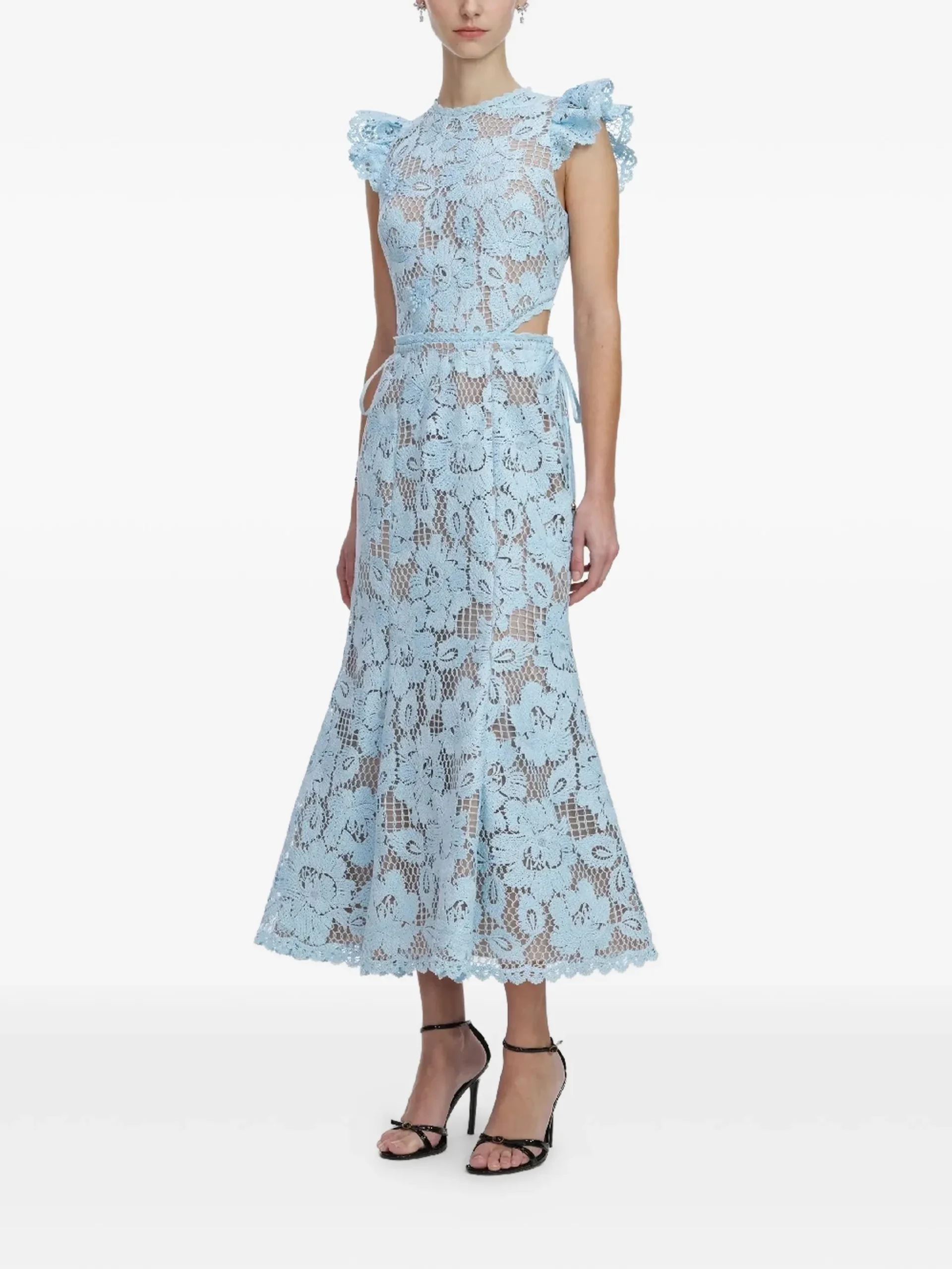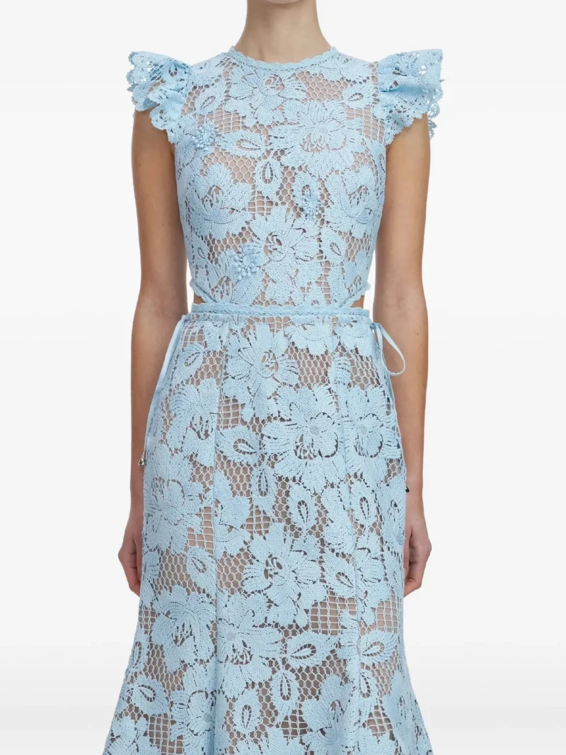 Rochie midi Self-Portrait floral-embroidered albastru, cu broderie florala, volane la umeri, decupaj in talie, detaliu funda si fusta tip sirena. 100% poliester