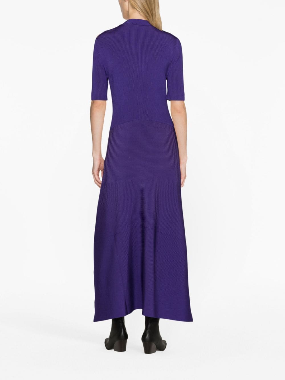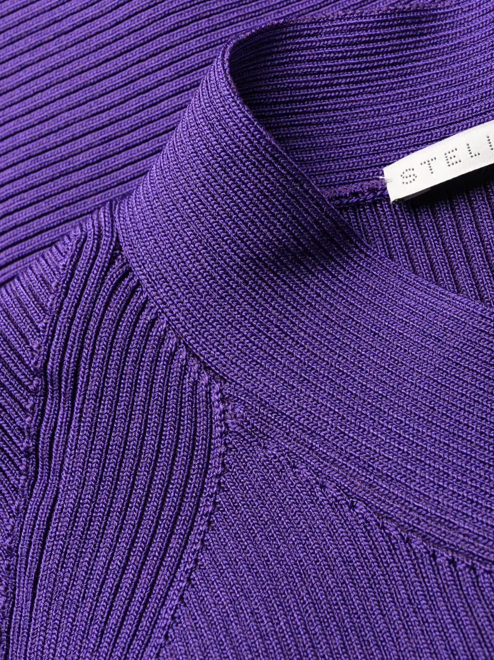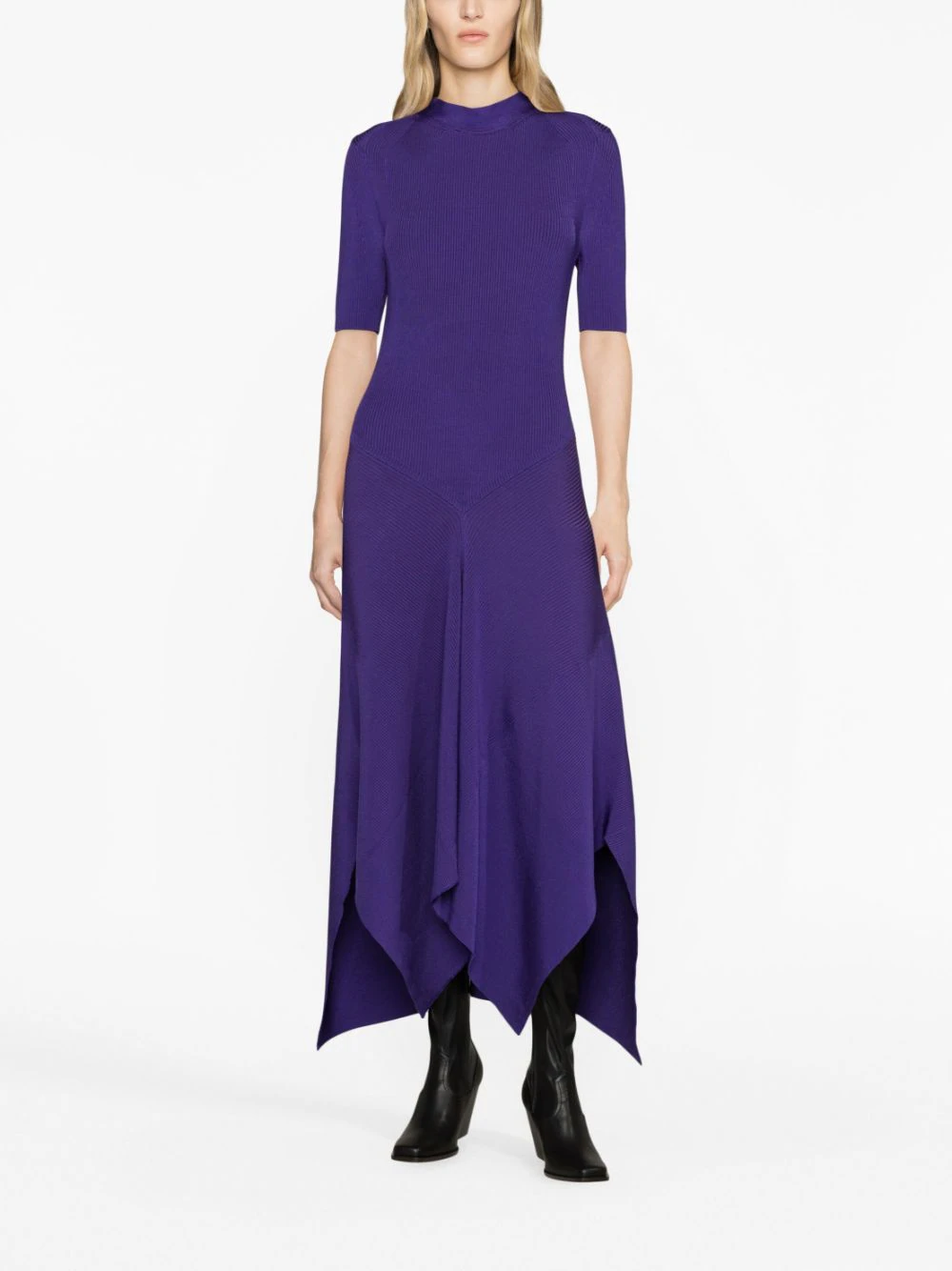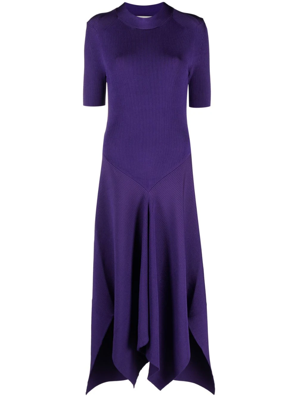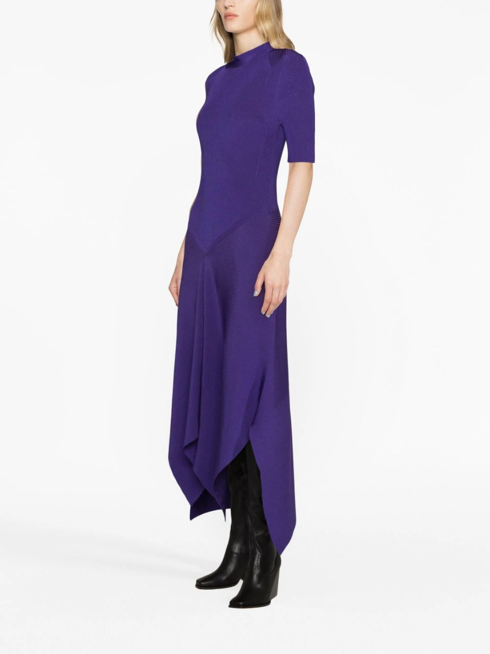 Rochie midi mov din tricot rib de fibre sintetice, cu guler rotund, maneci scurte, design cu falduri si tiv asimetric. Potrivita pentru sezonul toamna/iarna. 79% viscoza; 19% poliamida; 2% elastan.