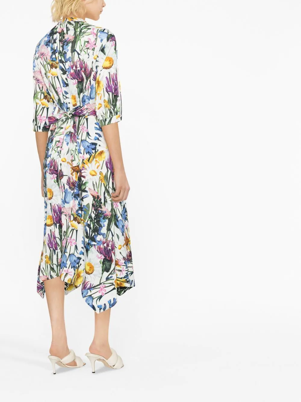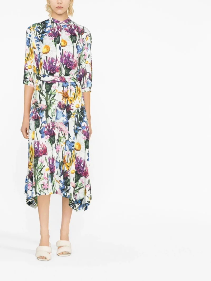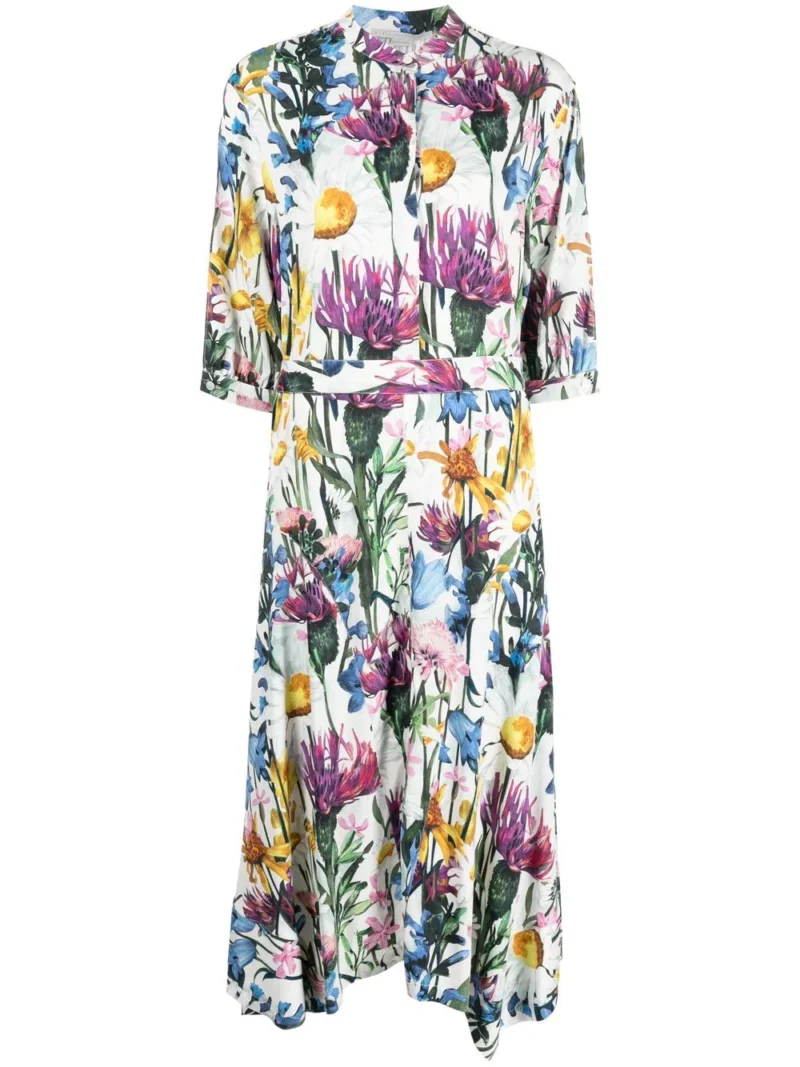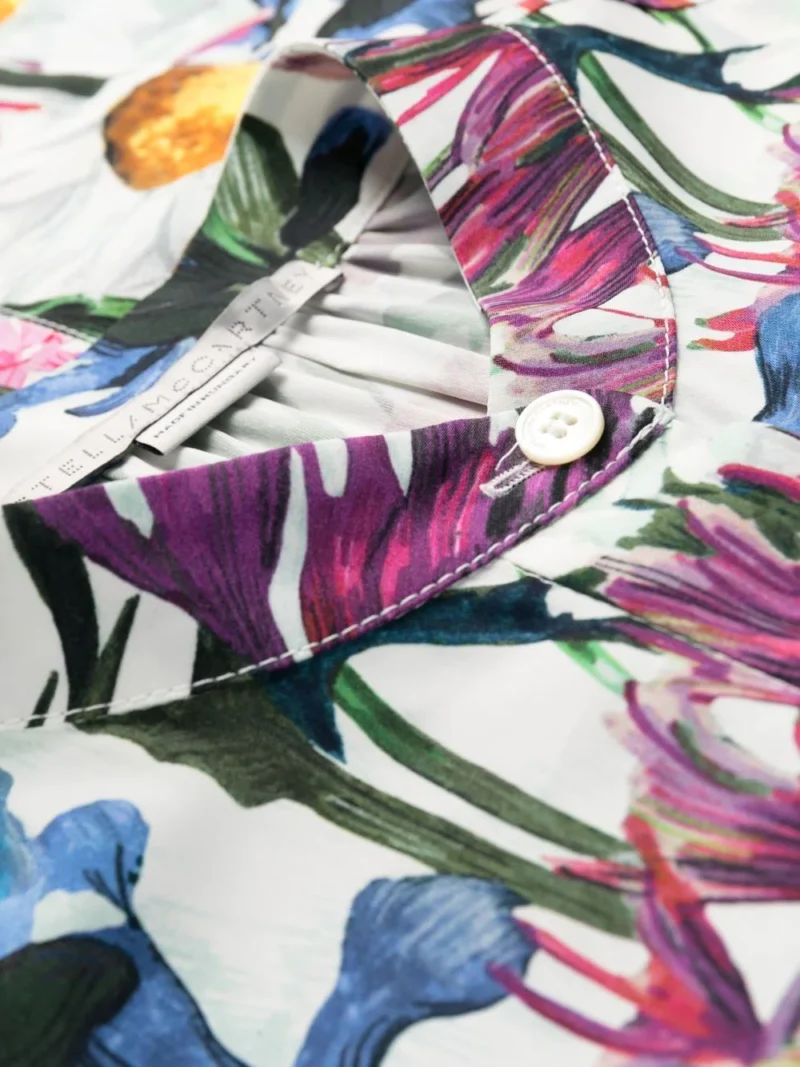 Rochie midi multicolor din viscoza, cu guler tunica si inchidere cu nasturi ascunsi, maneci medii, mansete cu nasturi, grafica Stella McCartney Flower imprimata pe toata suprafata si tiv curbat. Potrivita pentru sezonul primavara/vara. 94% viscoza; 6% elastan.