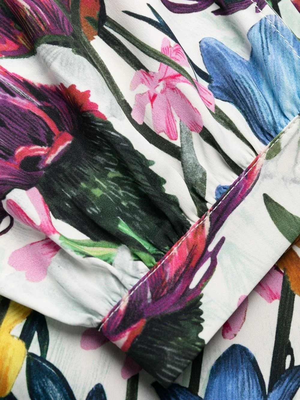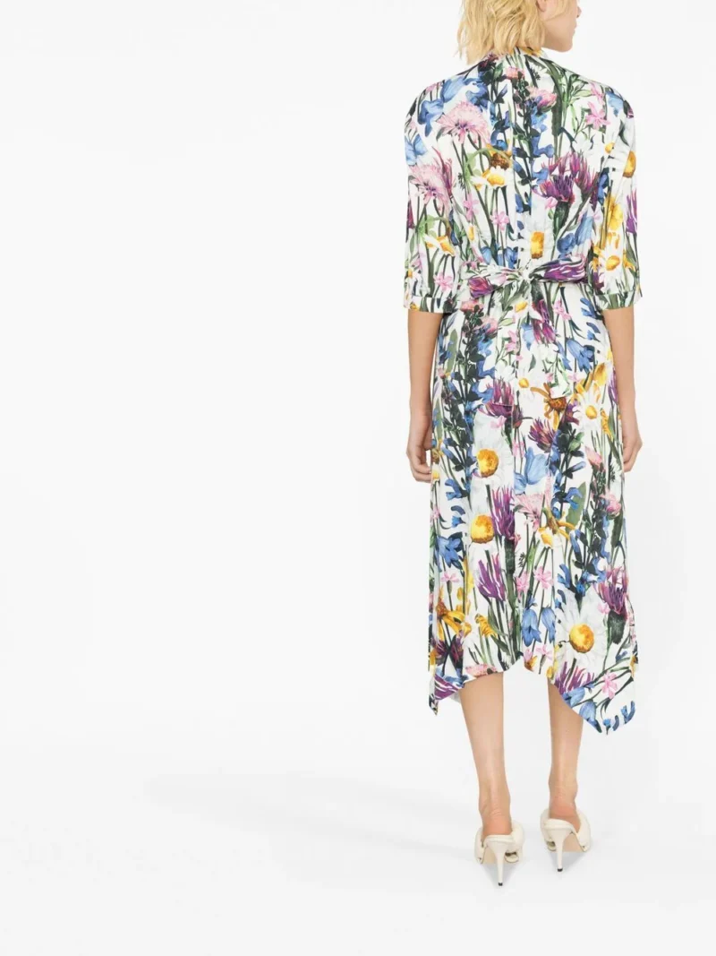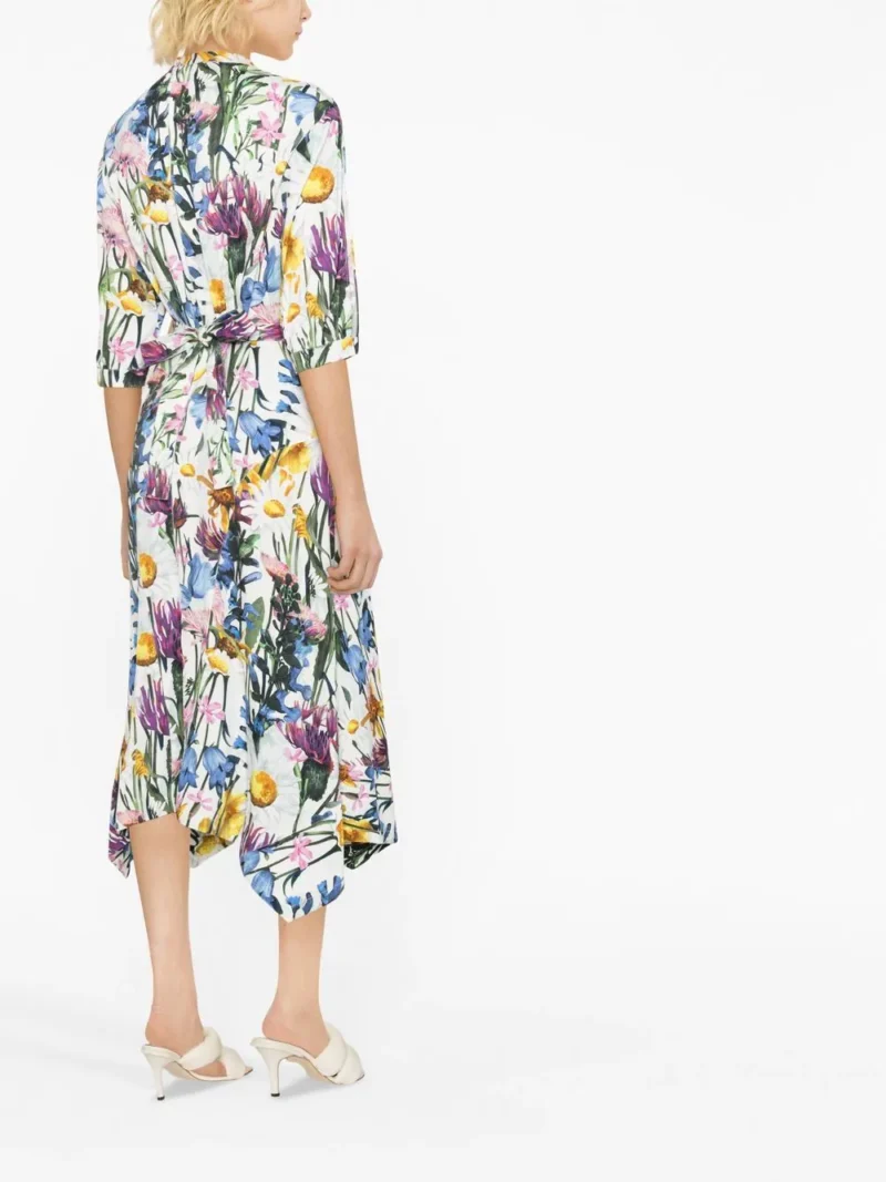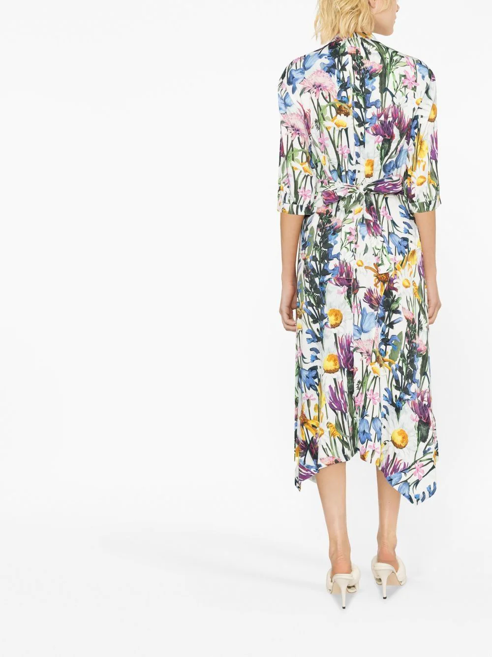 Rochie midi multicolor din viscoza, cu guler tunica si inchidere cu nasturi ascunsi, maneci medii, mansete cu nasturi, grafica Stella McCartney Flower imprimata pe toata suprafata si tiv curbat. Potrivita pentru sezonul primavara/vara. 94% viscoza; 6% elastan.