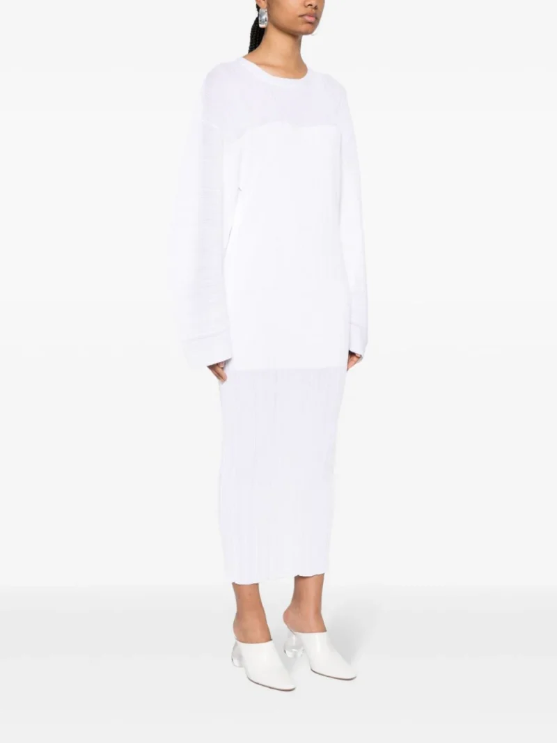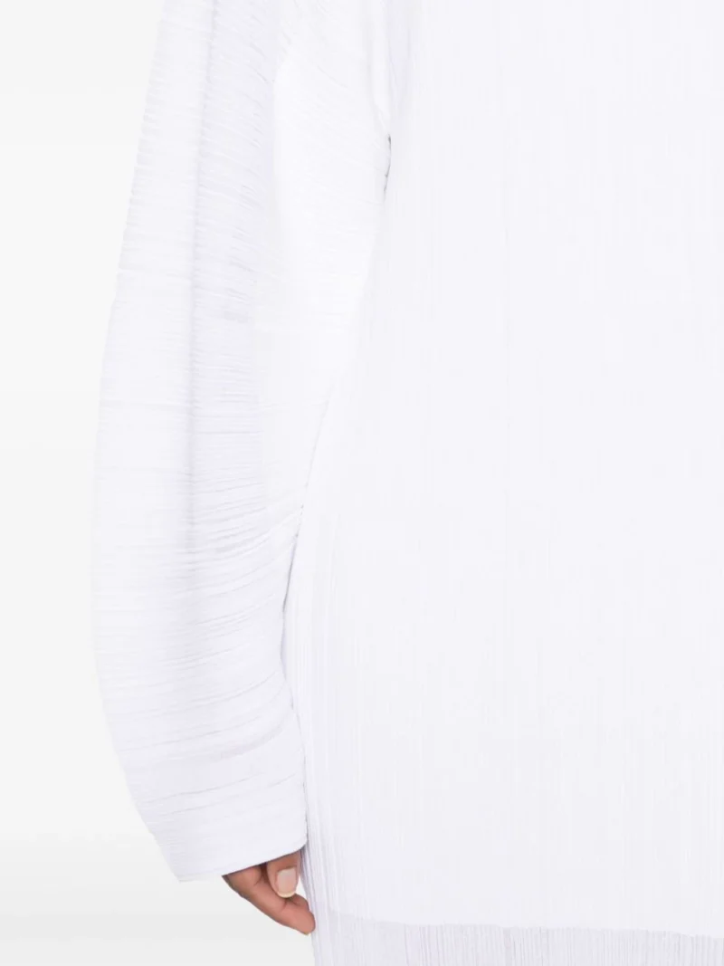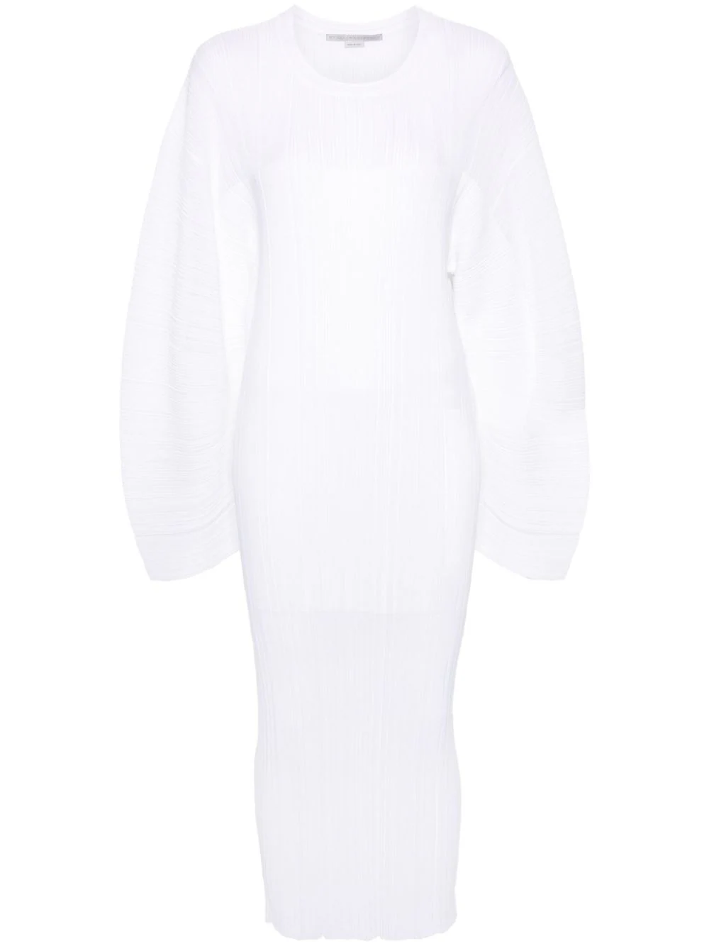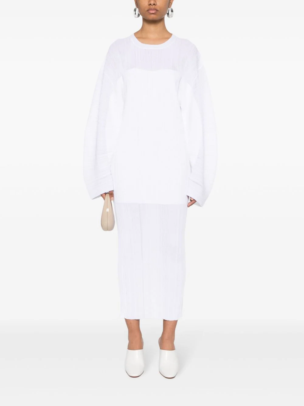 Rochie midi alba din viscoza si poliamida, cu guler rotund, maneci bufante lungi, mansete late, aspect creponat si tiv drept. Potrivita pentru sezonul primavara/vara. 84% viscoza; 16% poliamida.