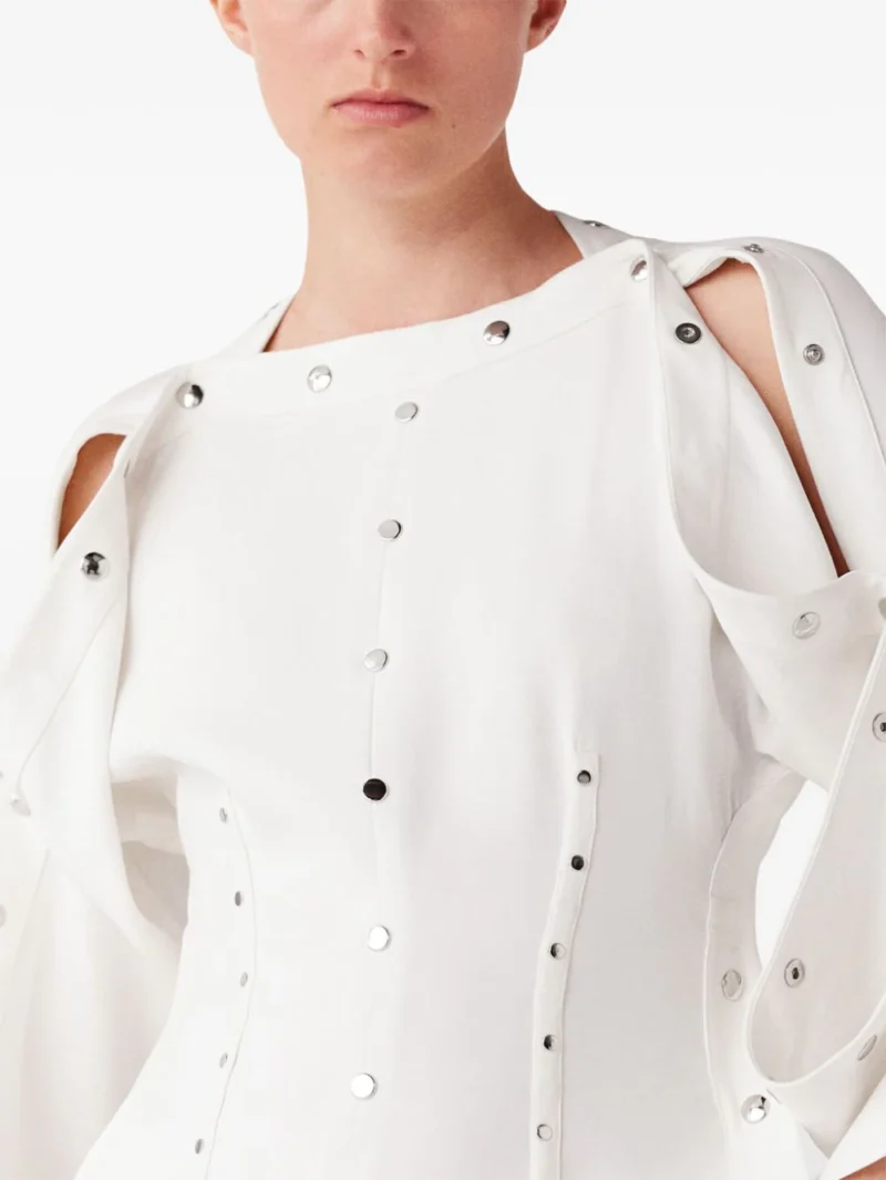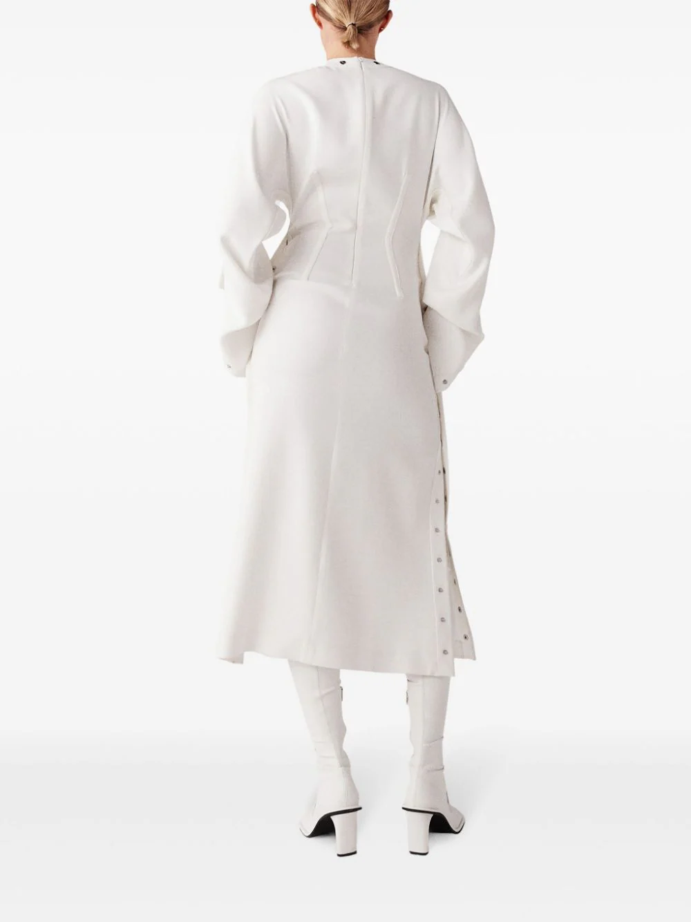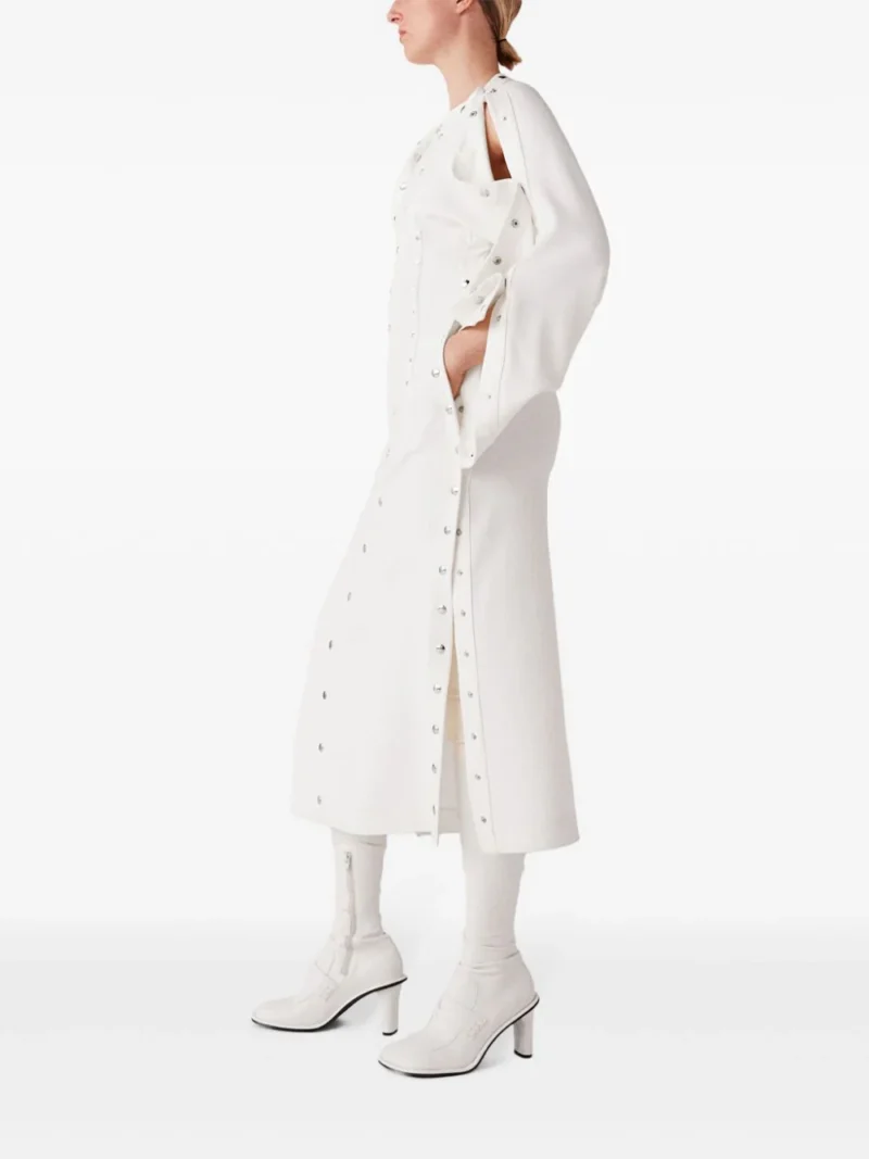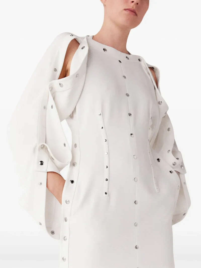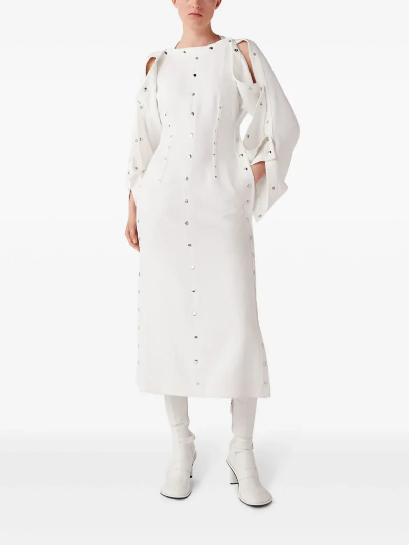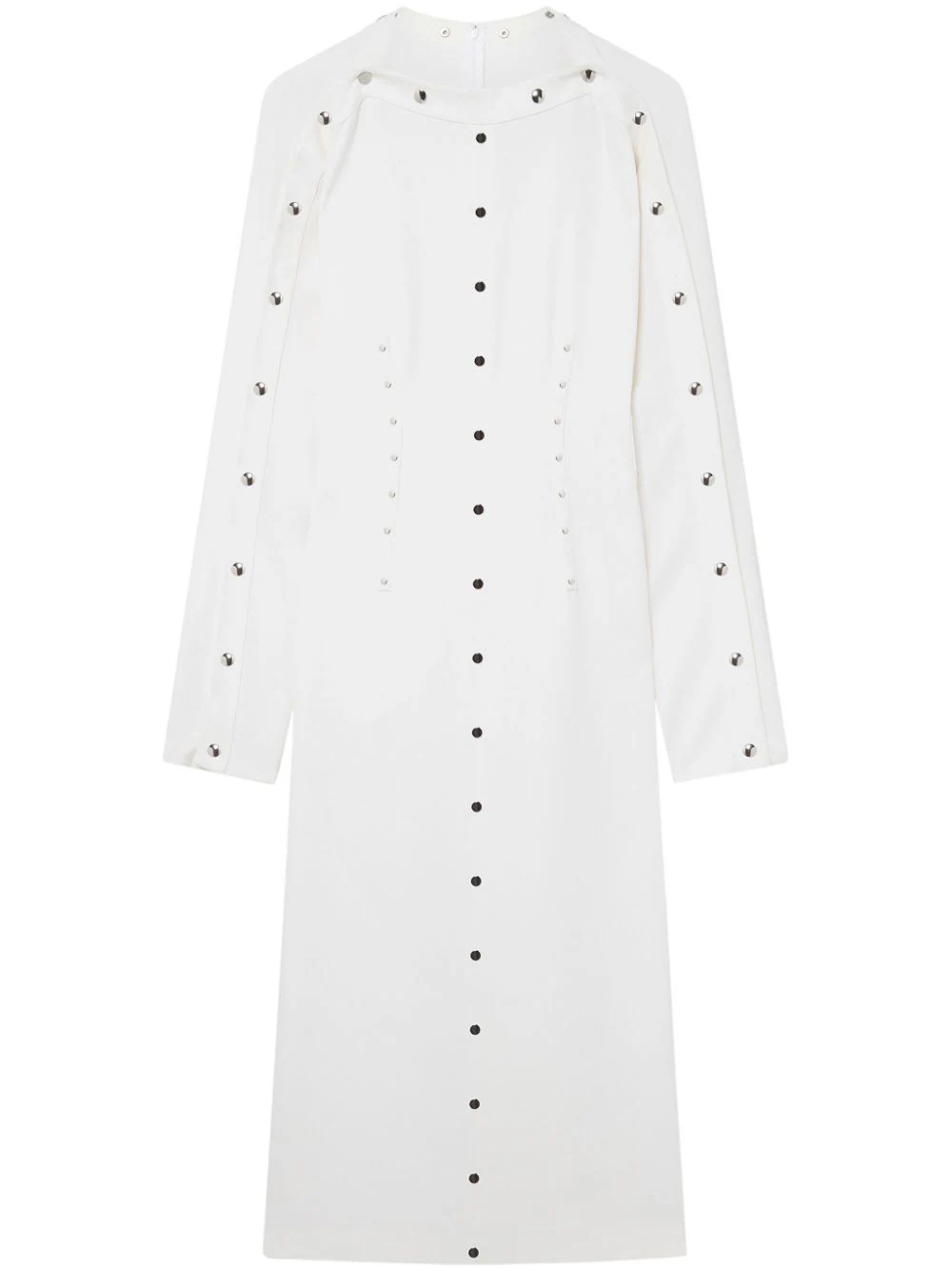 Rochie midi Stella McCartney Stud-Embellished alb, tip A-line, din viscoza , cu guler tip barcuta, inchidere cu fermoar ascuns la spate, maneci lungi cu decupaje, decorata integral cu capse si tiv drept. Potrivita pentru sezonul toamna/iarna. 96% viscoza; 4% elastan.