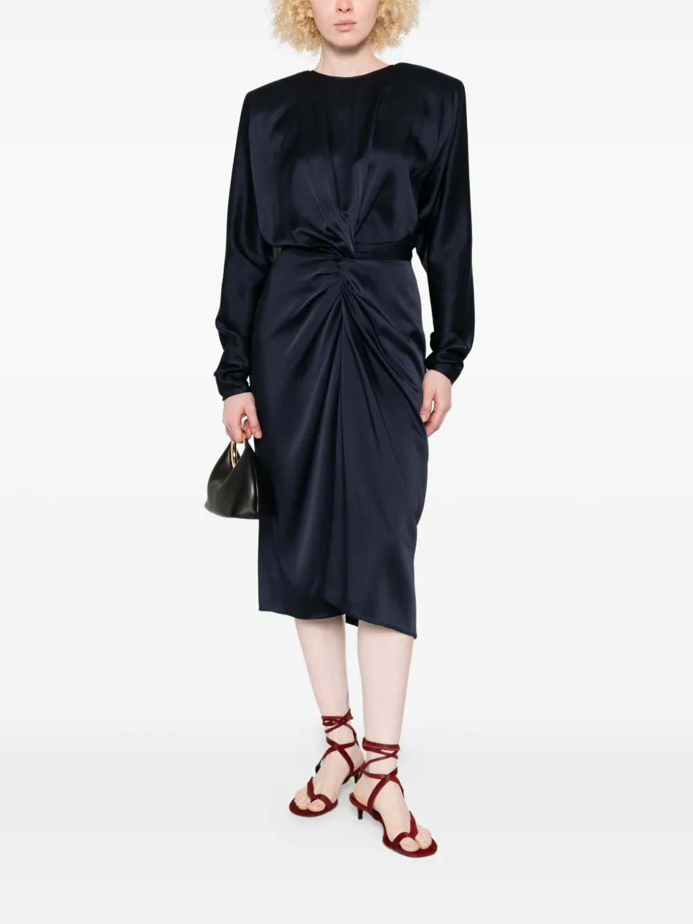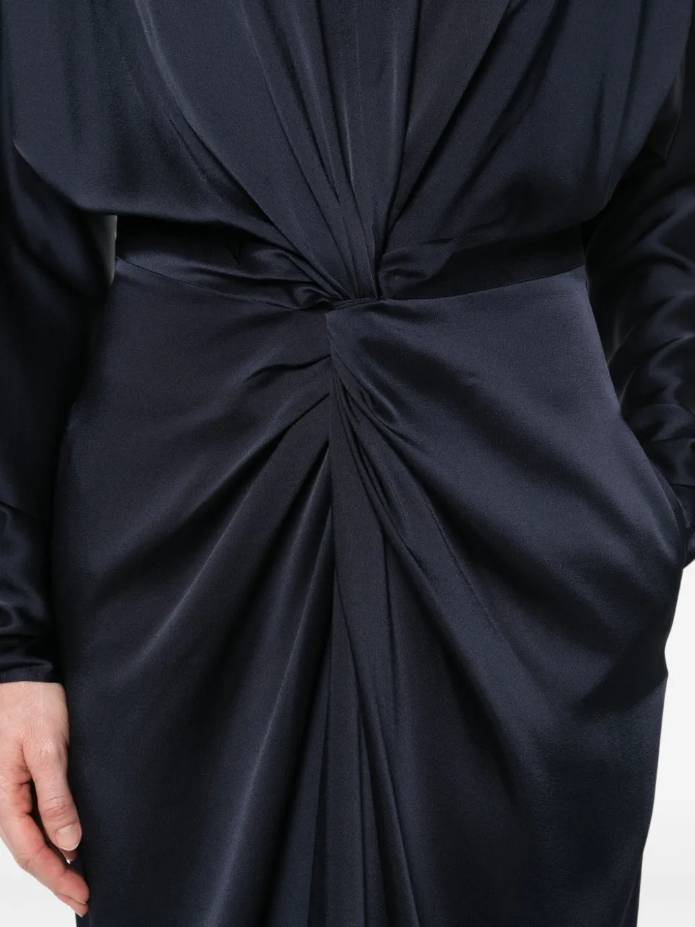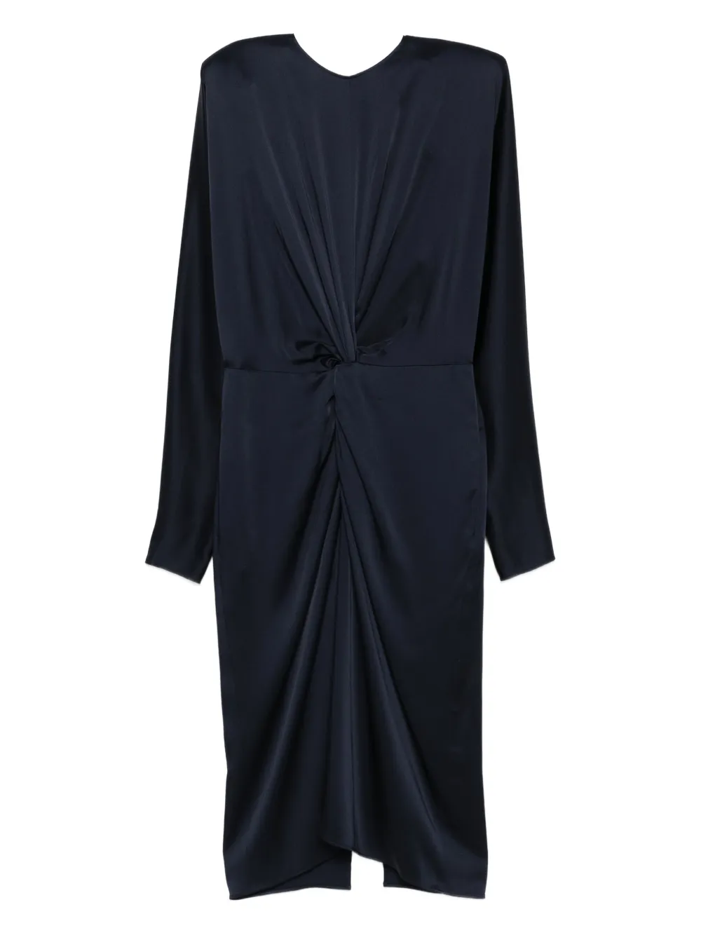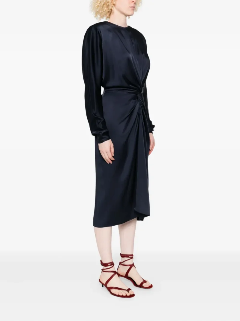 Rochie midi Stella McCartney Twist-Front Long-Sleeve bleumarin, din acetat cu guler rotund, inchidere cu fermoar la spate, maneci lungi, talie evidentiata cu pluri decorative, slit la spate si tiv drept. Potrivita pentru sezonul primavara/vara. 73% acetat; 27% viscoza.