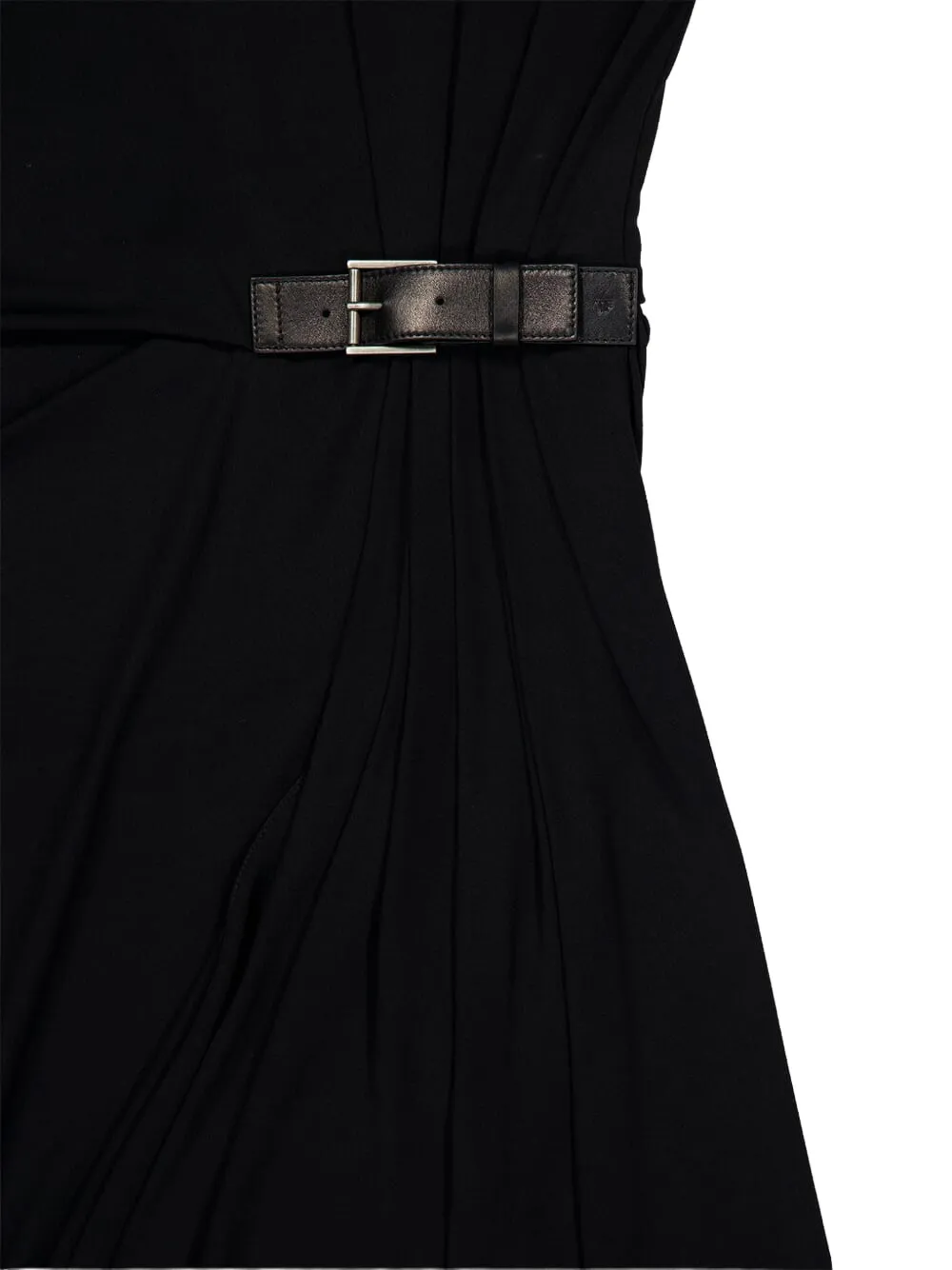 Rochie midi TOM FORD Belted negru, relizata din viscoza, cu guler rotund si barete late pentru umeri, croiala stramta cu drapaje, decoratiune catarama in jurul taliei si tiv drept. Potrivita pentru sezonul primavara/vara. 100% viscoza; 100% piele de miel.