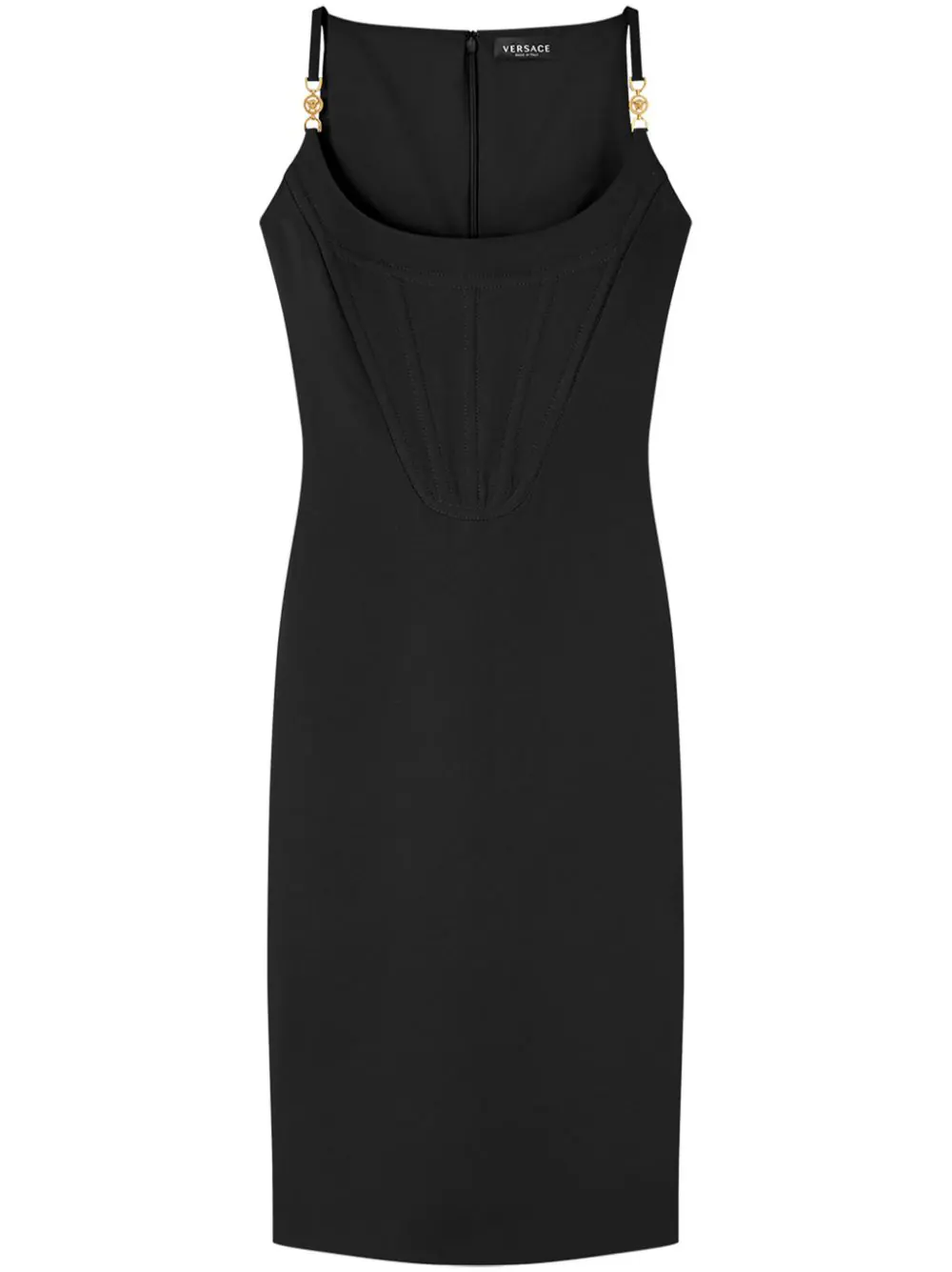 Rochie midi neagra din crep satinat, cu decolteu amplu si inchidere cu fermoar pe spate, bretele subtiri cu logo metalic Versace Medusa, corset in forma de V, slit pe spate, tesatura elastica care accentueaza forma corpului, captuseala din matase si tiv drept. Potrivita pentru sezonul primavara/vara. 97% viscoza; 3% elastan; 100% matase.
