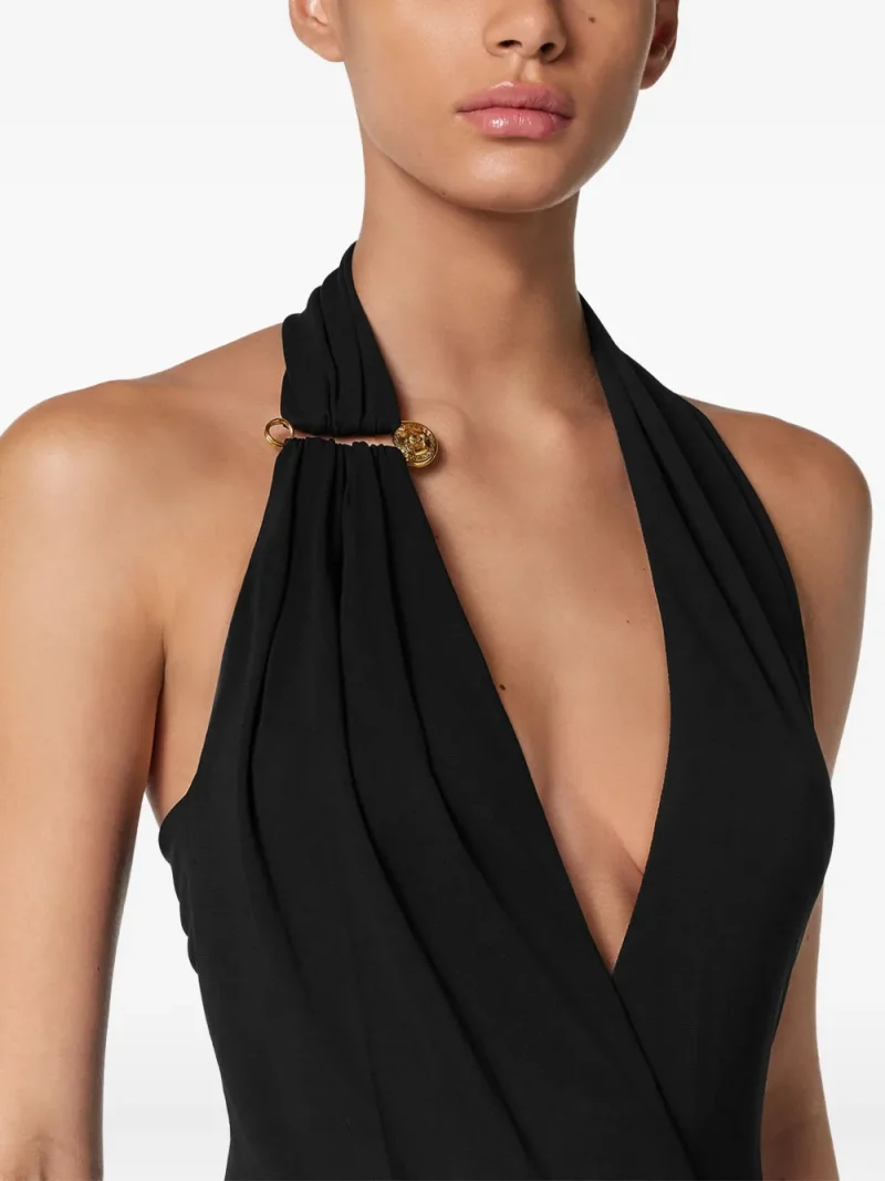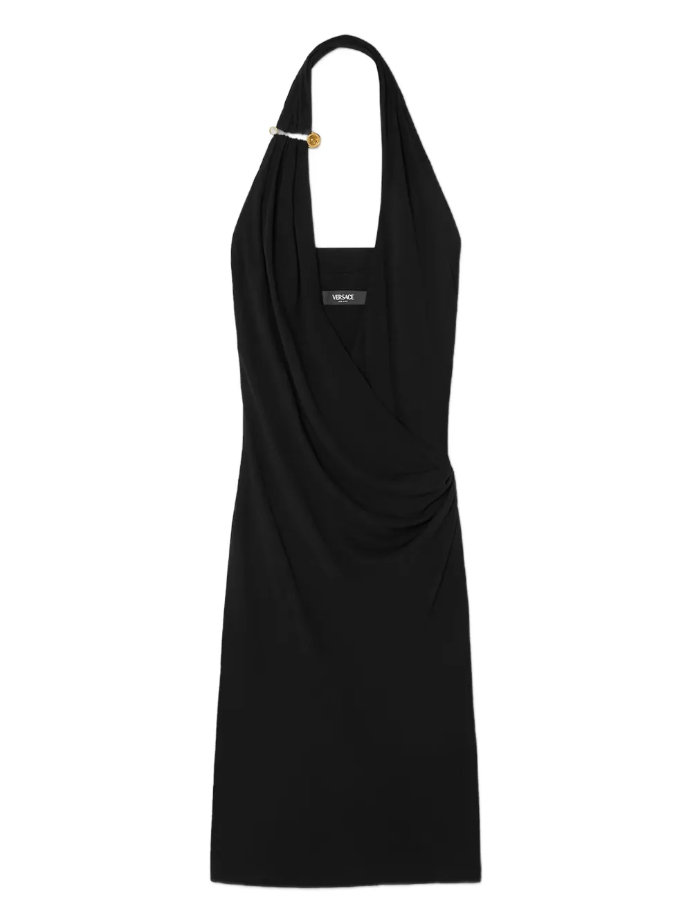Rochie midi Versace Halterneck Crepe negru, din viscoza, cu decolteu in V, guler halterneck, pin Versace Medusa aplicat, croiala stramta si tiv drept. Potrivita pentru sezonul primavara/vara. 95% viscoza; 5% elastan; 95% viscoza; 5% elastan.