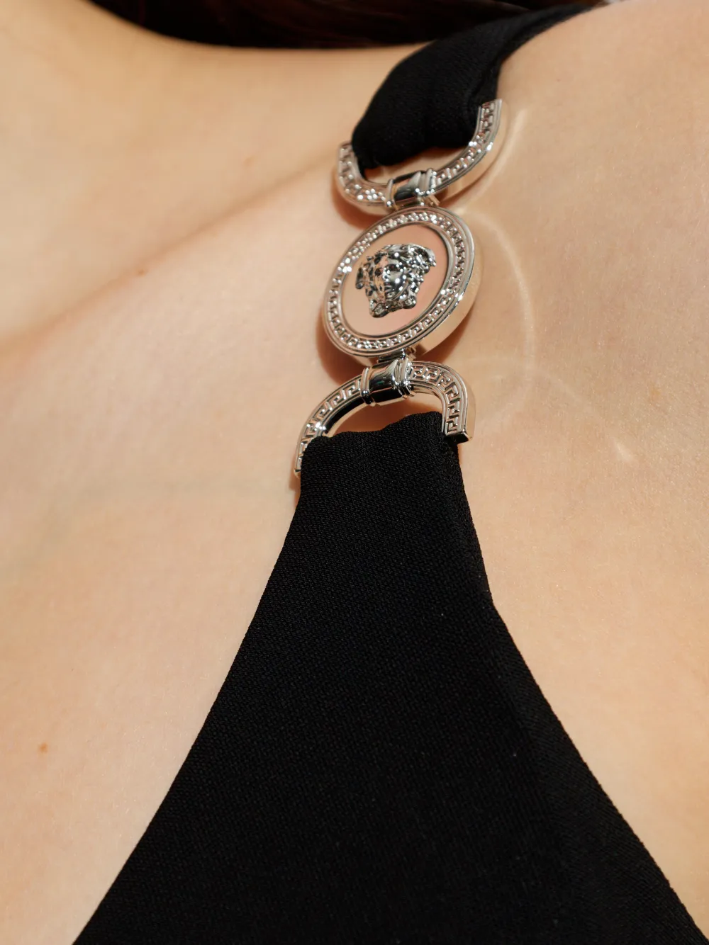 Rochie midi Versace Medusa-Detail negru, din viscoza, cu barete pentru umeri decorate cu logo metalic Medusa, decolteu, spatele gol, croiala stramta si tiv drept. Potrivita pentru sezonul primavara/vara. 95% viscoza; 5% elastan.