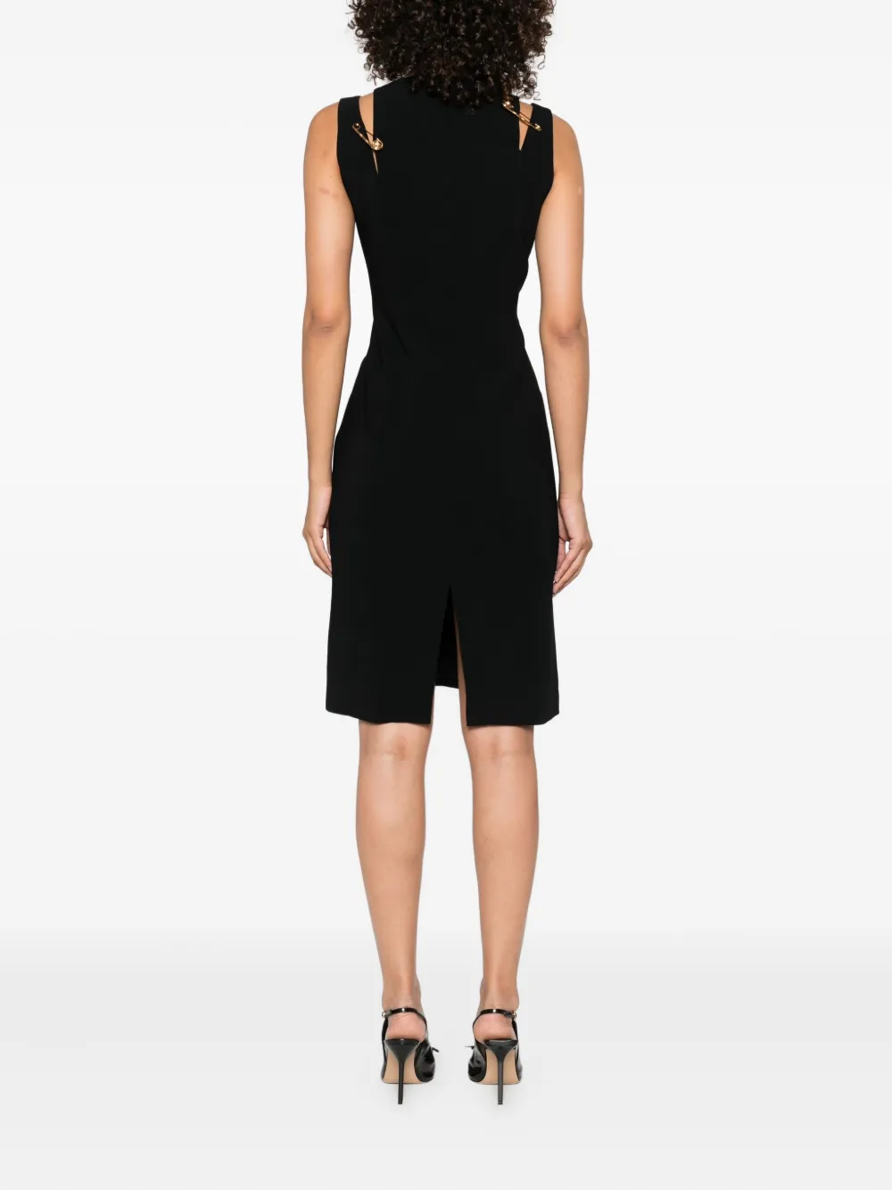 Rochie midi Versace Safety-Pin Detail negru, din viscoza, cu barete late pentru umeri decorate cu Safety Pin Medusa, decolteu in V, inchidere cu fermoar la spate, slit la spate si tiv drept. Potrivita pentru sezonul toamna/iarna. 95% viscoza; 5% elastan; 71% acetat; 26% matase; 3% elastan.