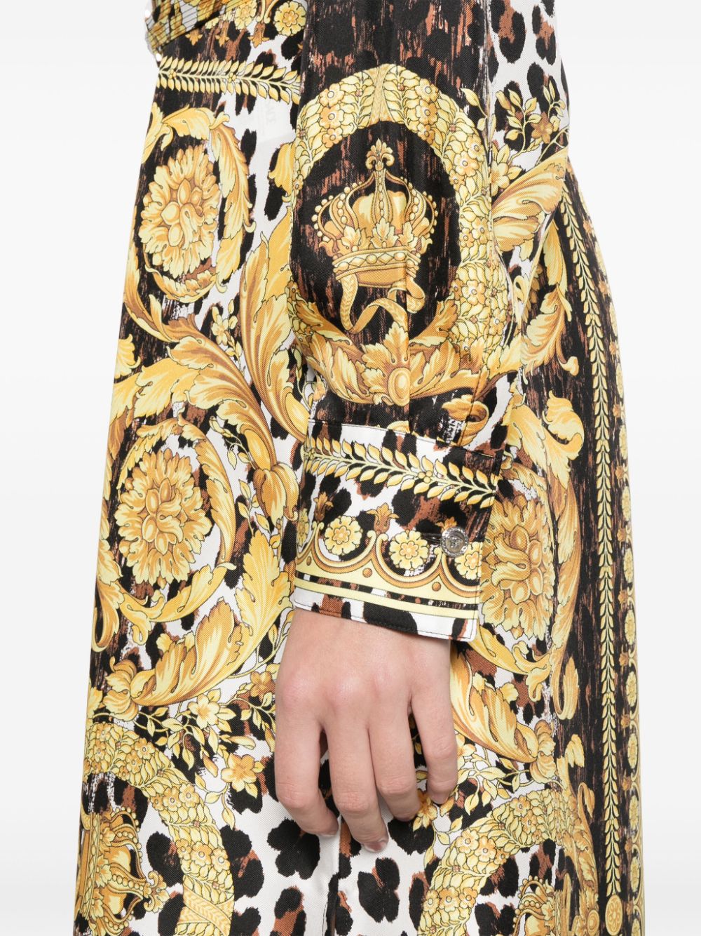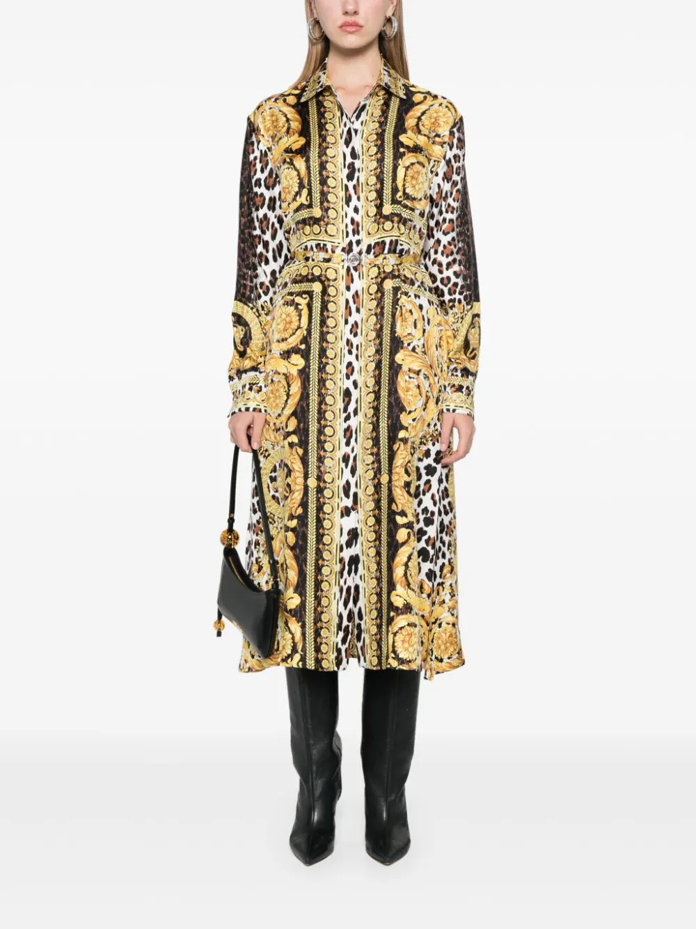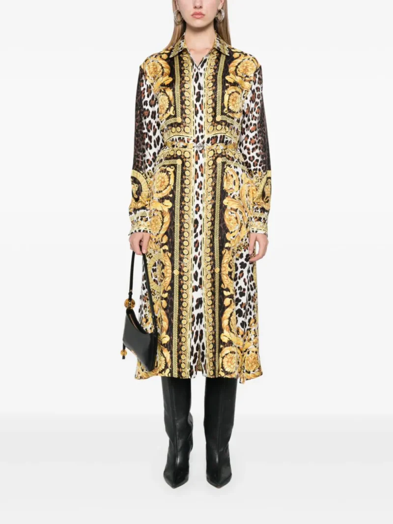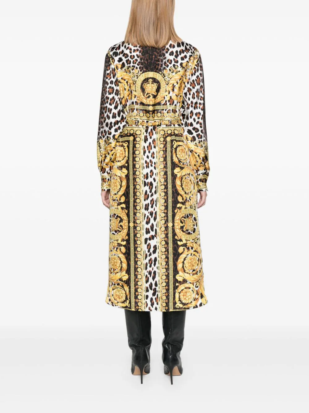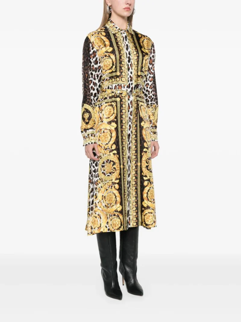 Rochie midi Versace Wild Barocco Foulard multicolor, design A-line, din matase, cu guler clasic, inchudere cu nasturi ascunsi, maneci lungi, mansete cu nasturi, cordon textil in jurul taliei, grafica Versace „Wild Barocco Foulard ” imprimata pe toata suprafata si tiv drept. Potrivita pentru sezonul toamna/iarna. 100% matase.